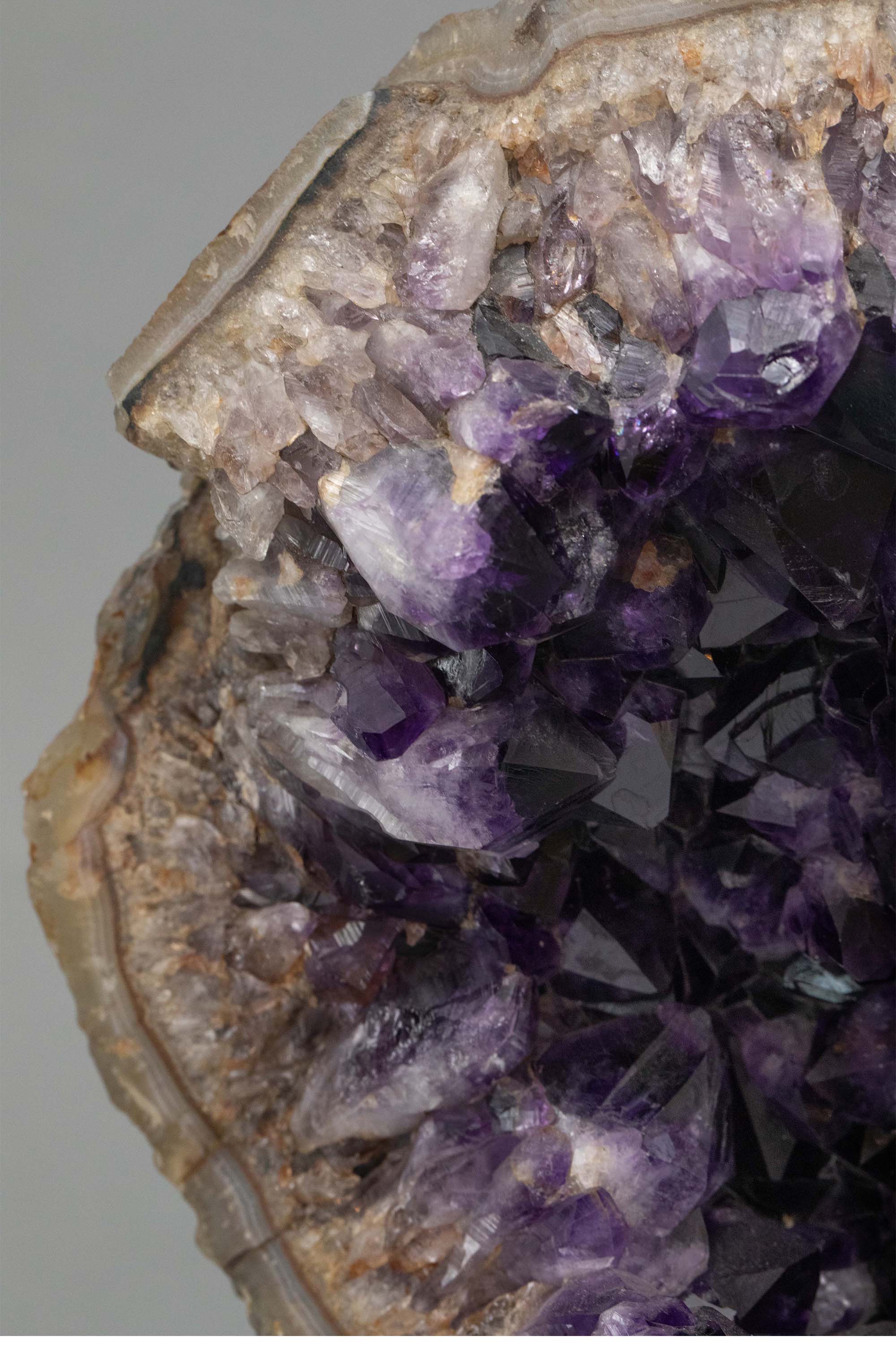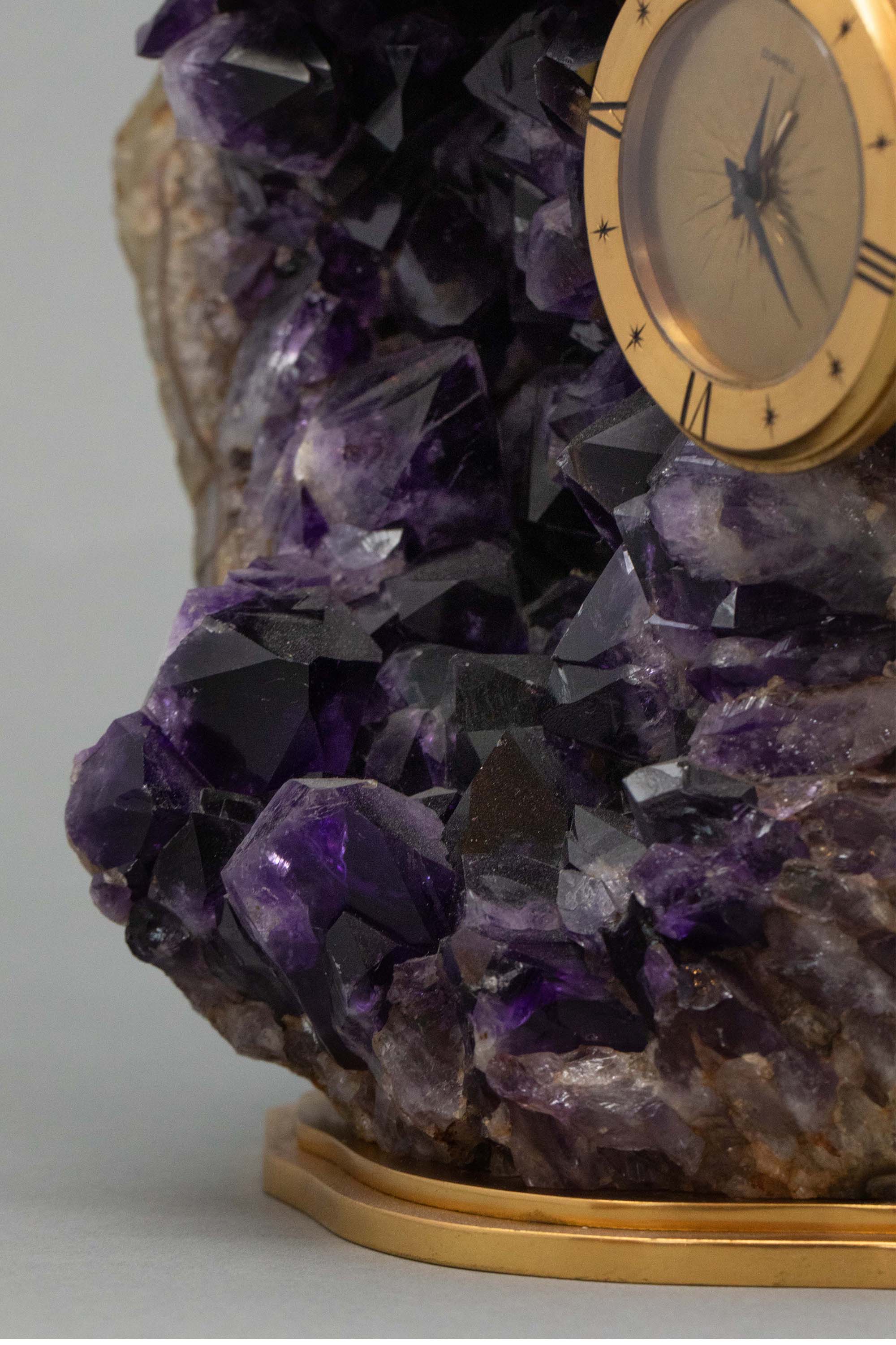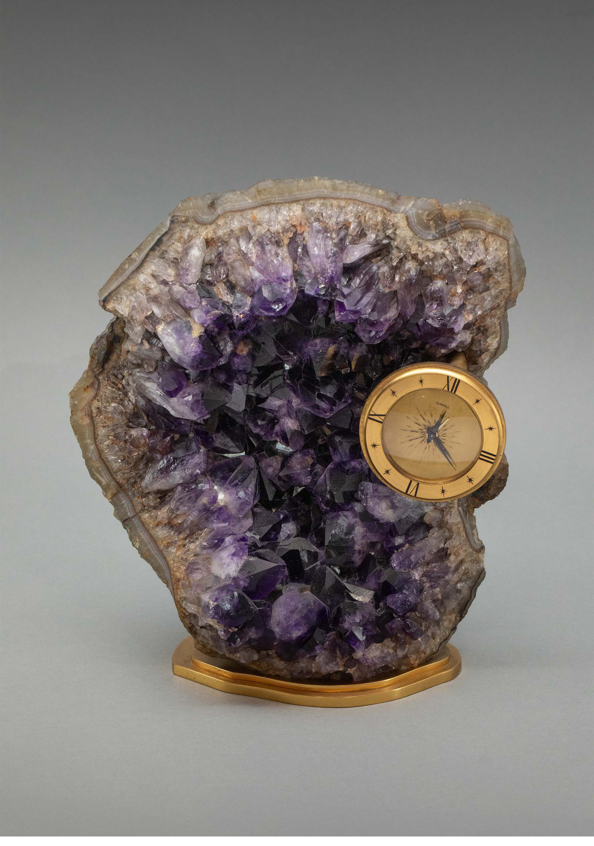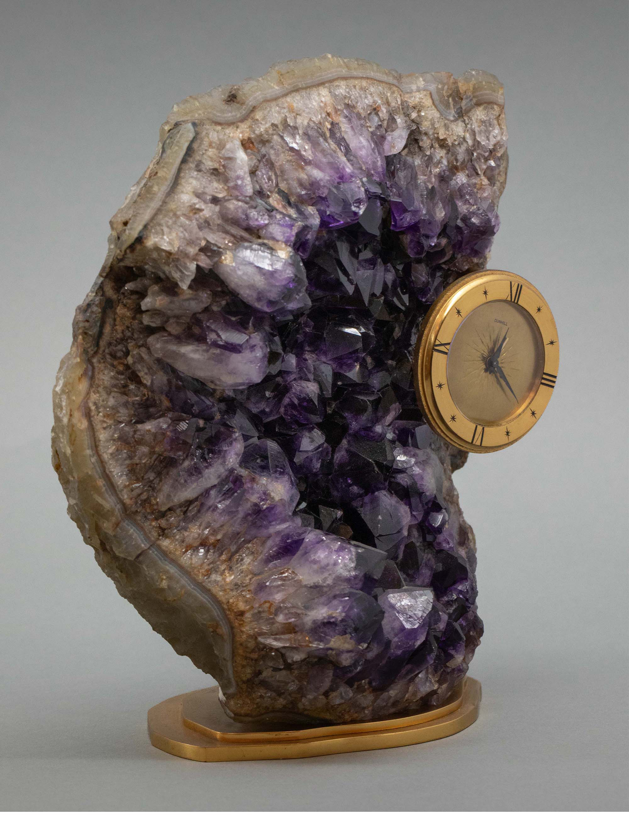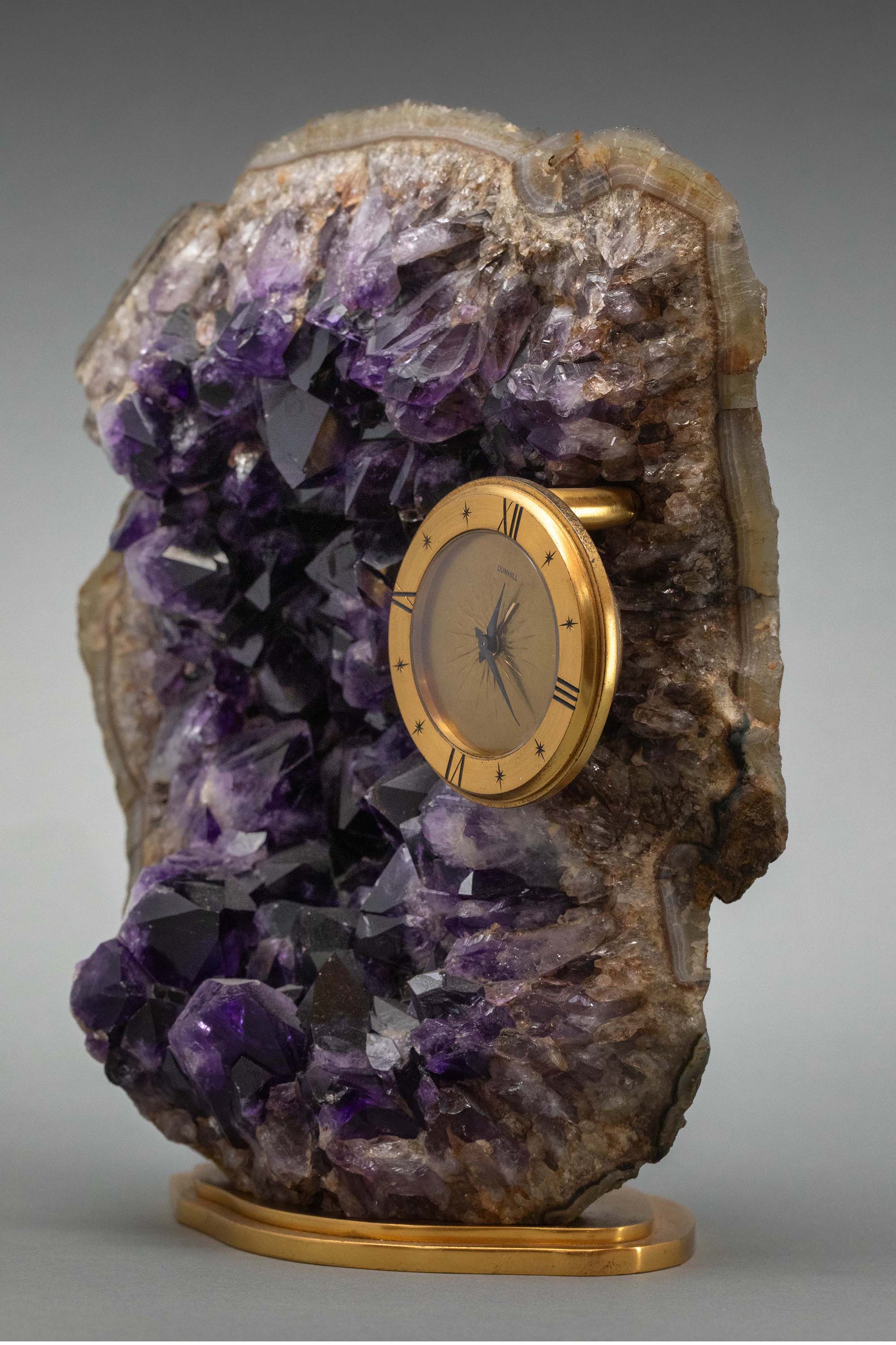 20世纪英国知名品牌Alfred Dunhill签名出品天然紫水晶洞装饰铜鎏金底座及圆形表盘座钟