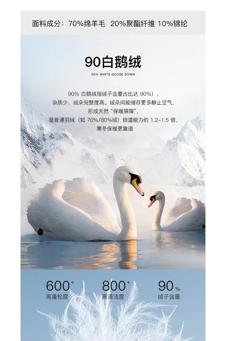 【面料】70%绵羊毛,20%聚酯纤维,10%锦纶/里料:90鹅绒