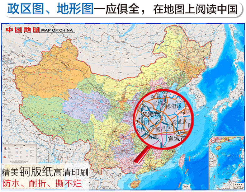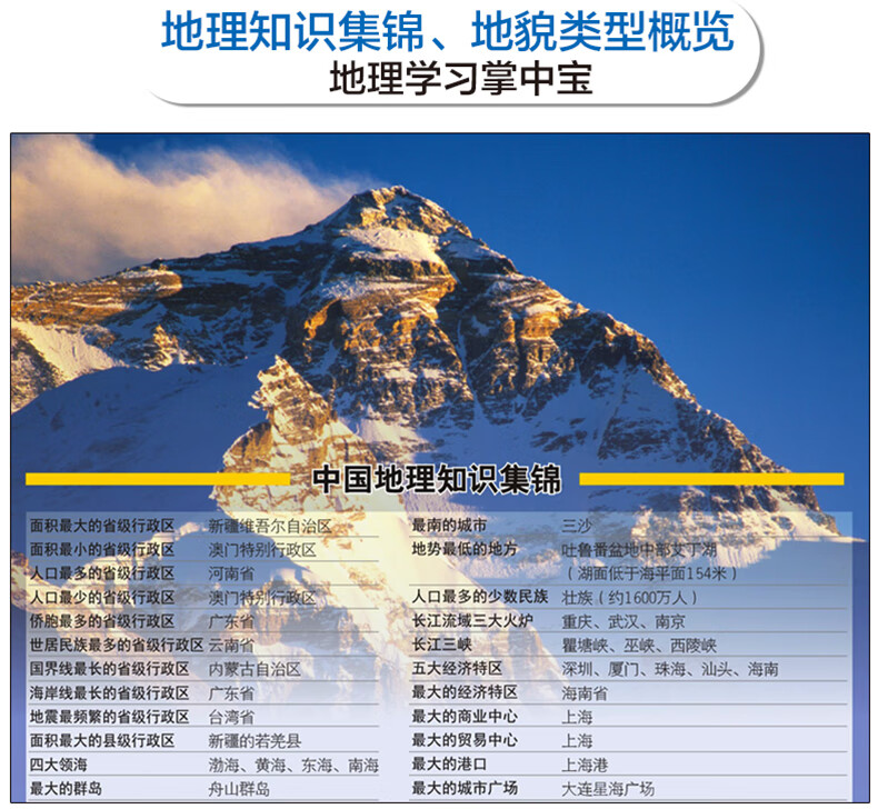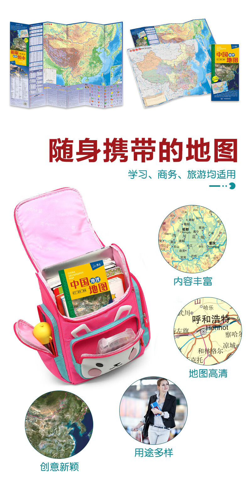 中国地图的正面是一幅行政地图,详细介绍了中国主要山脉、河流等自然要素的地理分布,并以分区设色的形式介绍了全国34个省级行政区的区域范围,以及省级行政中心、地级行政中心和县市级居民地的分布及交通等内容;反面以“中国地形”图为中心,详细介绍了中国知名的河流、山脉、高原、盆地的地理分布及其概况,中国各省区的面积、人口及其排名、中国古代主要地理名称释义,以及中国地理知识集锦等内容。