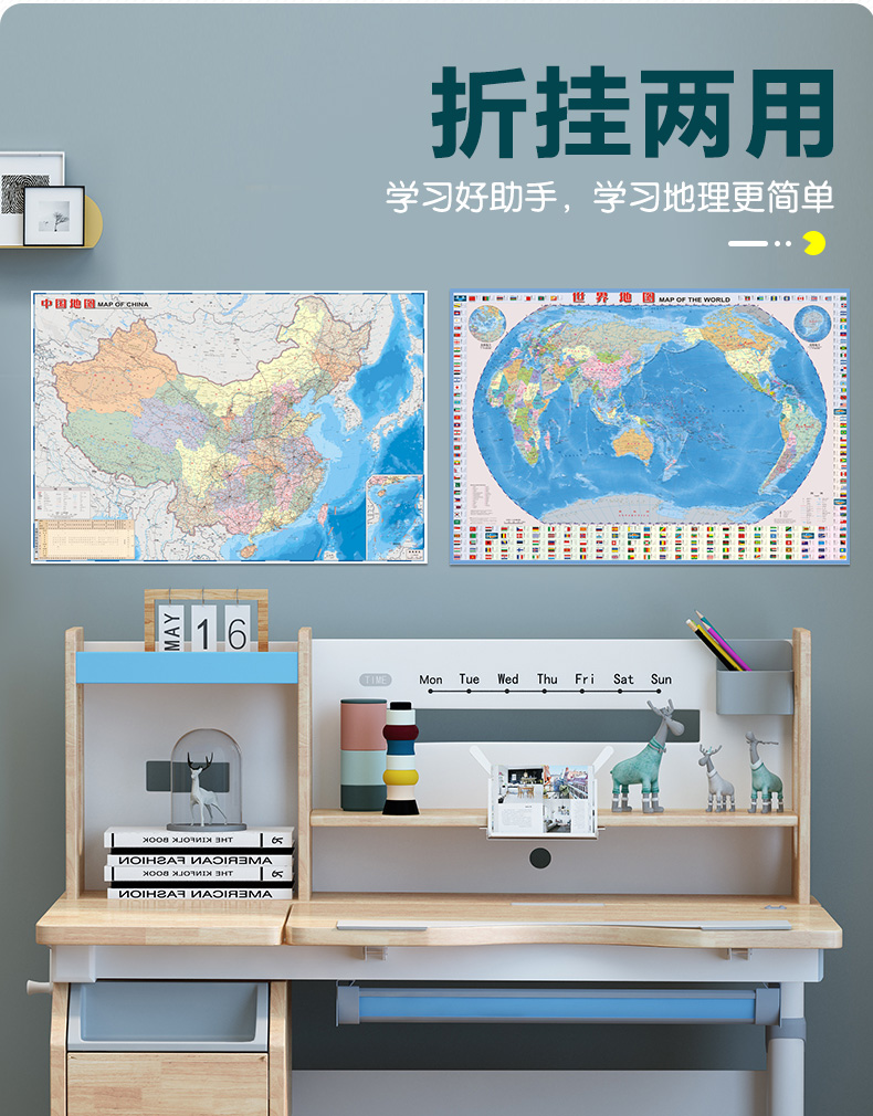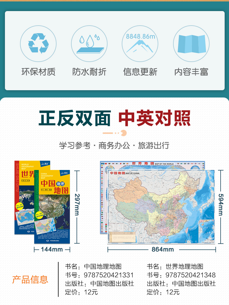 (仓发) 全新修订 北斗地图中国·世界地理地图 大尺寸(学生地图 地理学习知识 政区+地形图 套装全2册 防水 耐折 撕不烂地图 中国地图世界地图)0./9787520421331