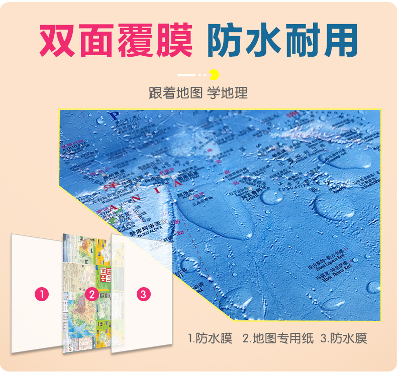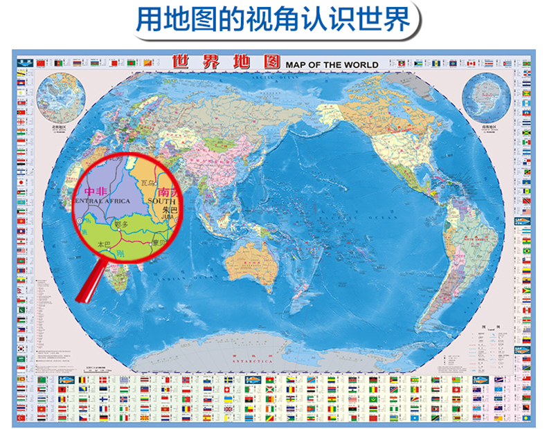 世界地图的正面(《世界地图》)采用中、英文对照的形式,详细介绍了世界200多个国家和地区的版图位置、首都、首府、主要城市、交通、水系等内容。地图四周排有世界各国的国旗,并以简表的形式介绍了世界各国的面积、人口、货币和主要语言等信息,以及国家和首都的地理位置索引等内容; 反面以大幅面的“世界地形”图为中心,详细介绍了各大洲知名的河流、山脉、高原、盆地的地理分布及其概况,各大洲地理知识集锦等内容。是了解世界的实用地图“工具书”。