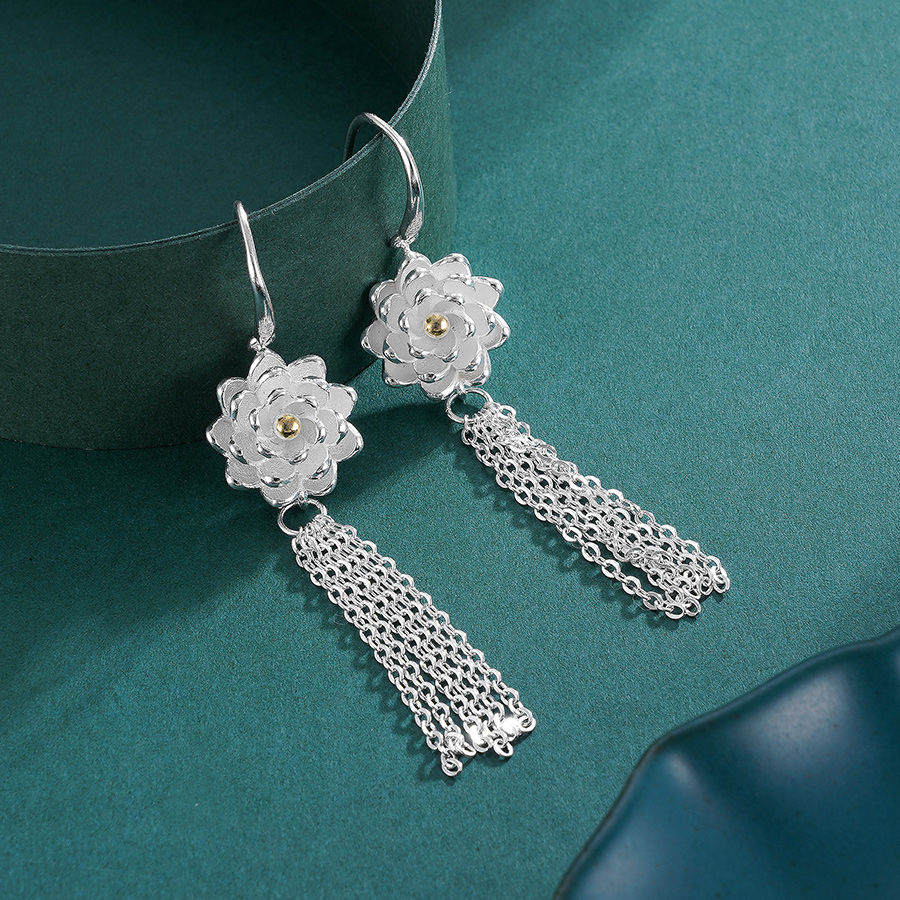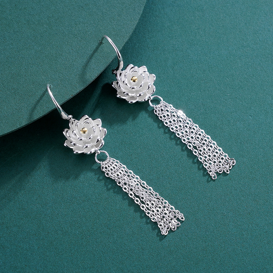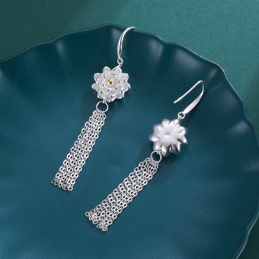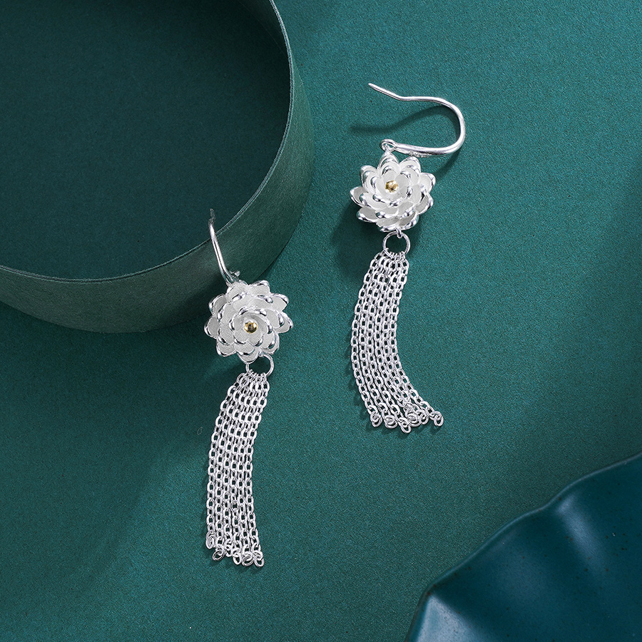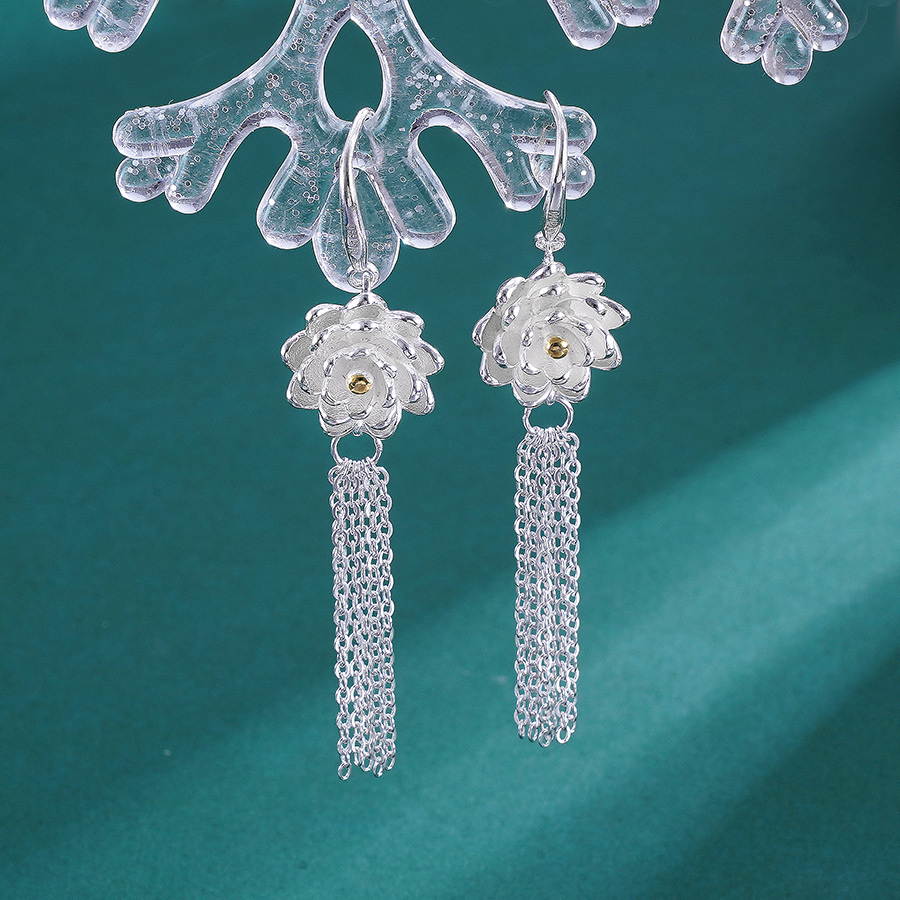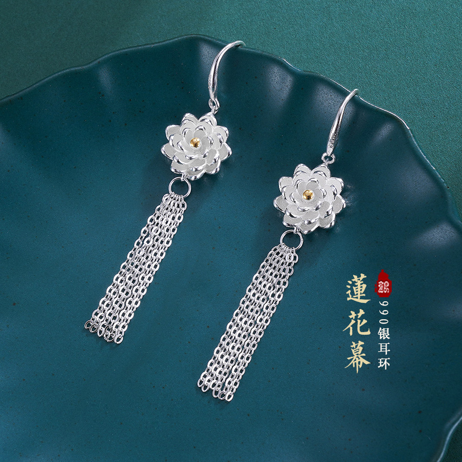 【寓意】:出淤泥而不染,濯清涟而不妖。耳饰以莲花为灵感设计,借银花丝婷婷编织,寓意好运连连,福气绵绵。
