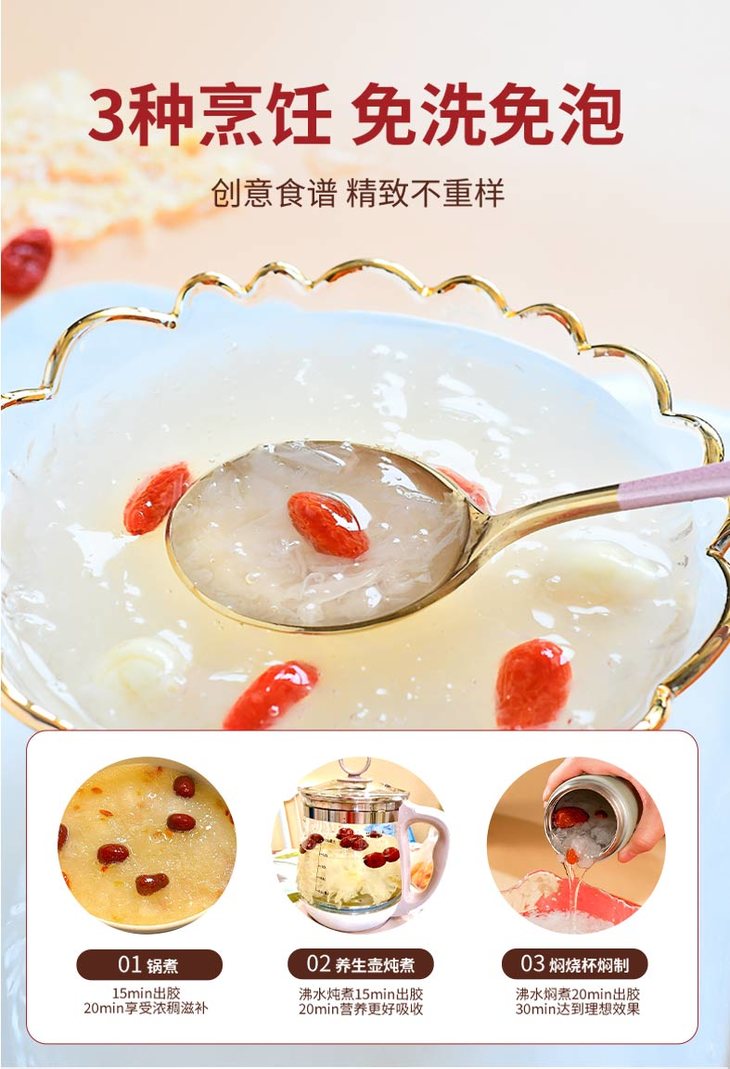 煮制过程中需要全程开盖,煮20分钟即可。每1g本草银耳配比110-150ml水,加入适量糖、银耳伴侣,搅拌至融化后出锅,可酌情添加其他食材。