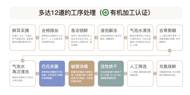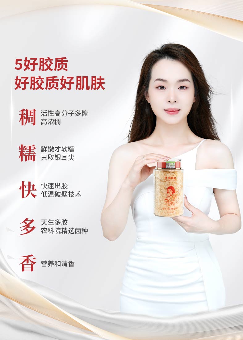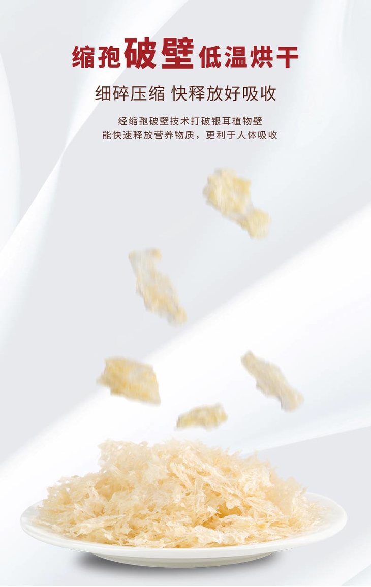 【品种特性】本品甄选优质新鲜银耳,人工去除蒂头,仅保留胶质丰富的耳瓣部分,因此本草银耳形态较碎。