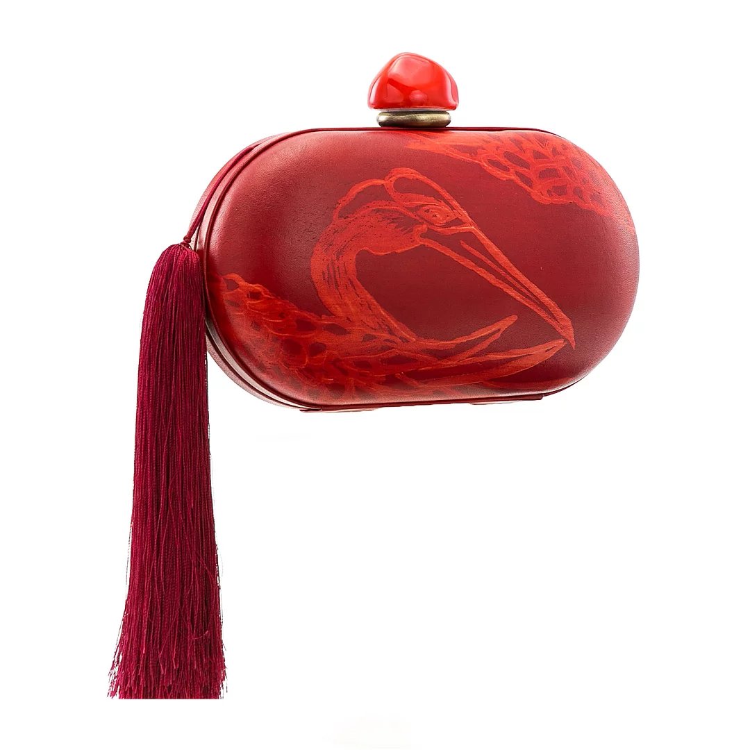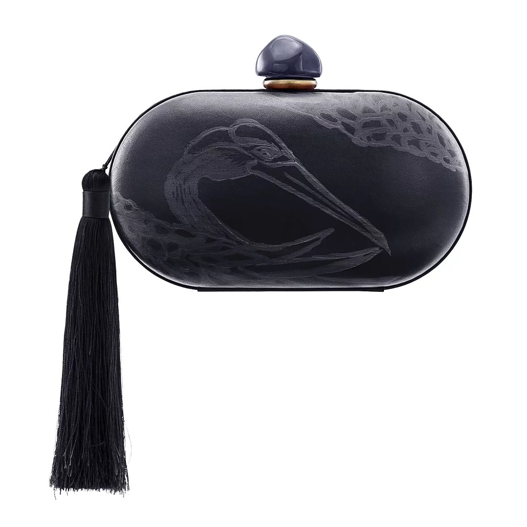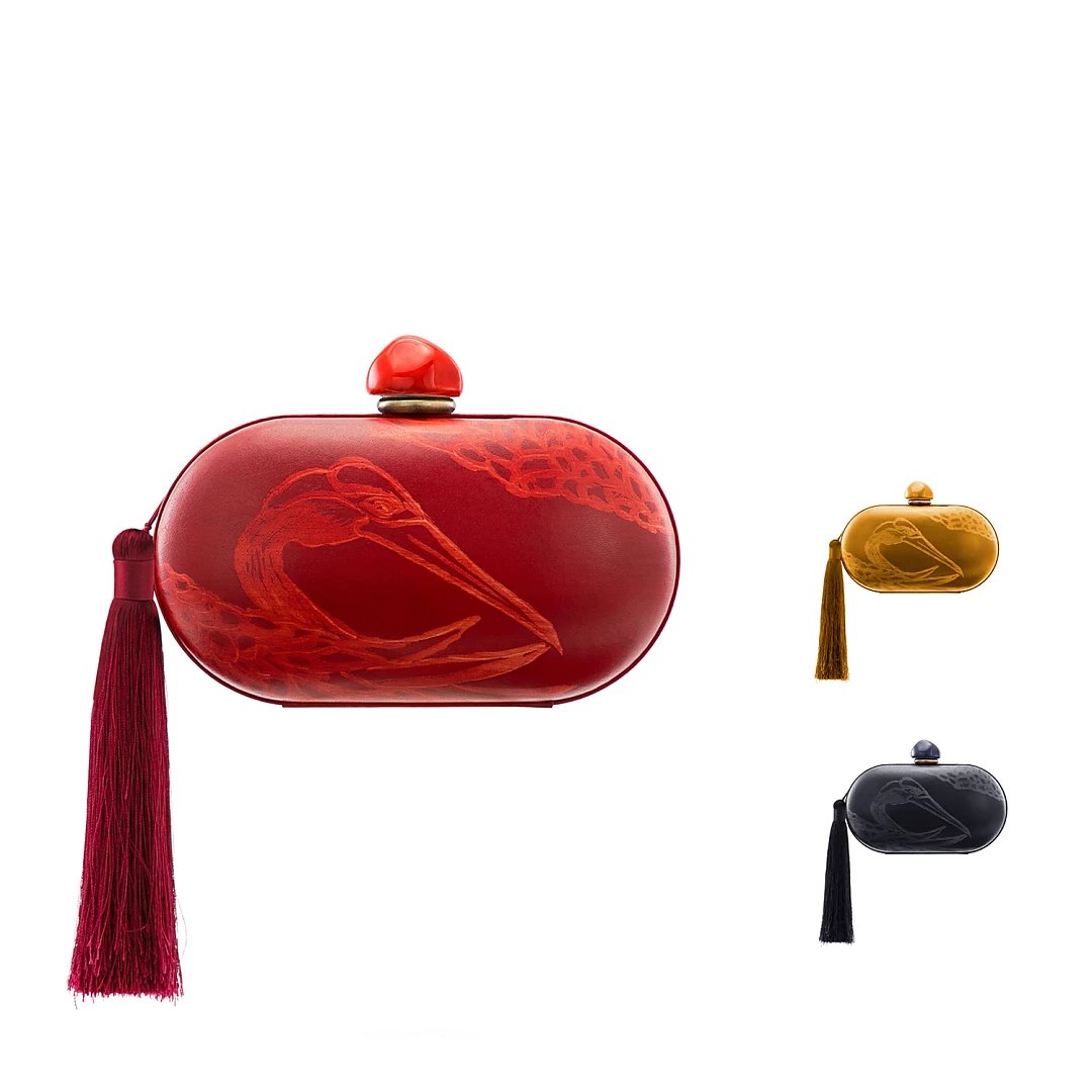 材质:牛皮(牛皮内里) 颜色:沙姜黄、墨蓝、朱红 尺寸:L19*W10.5 *D8cm 采用真皮上手绘、手擦、蜡染,当在寻找材料创作作品的时候,遍寻不着心仪的颜色,我们想到了亲手调配颜料,这组作品,都选用来自意大利的头层植鞣树羔皮,**的植物制革过程,保留了最天然的皮面状态,最佳的吸色效果,再加上每一幅都是艺术家手绘作品,每一只仙鹤都是独一无二的存在!值得一提的是,“皮上手绘蜡染工艺”是熙上团队独创的特殊工艺,体现了品牌孜孜不倦地在皮革领域的突破与创新,加上微妙的后处理,带来艺术又复古的气质,尤其是随着使用习惯、使用时间及使用方式的不同,逐渐养出包浆与痕迹,这才是高端玩家最为着迷之处。 此款晚礼包,运用羊皮手工包裹硬壳设计,玲珑小巧,内里运用羊皮内里,柔软细腻,可轻松容纳随身小物。适合各种时尚聚会晚宴场合,手打真丝流苏摇曳灵动,高贵且轻灵。瓷珠为景德镇手工匠人专属定做,出品极低(出产量),色泽别致,每件都如艺术品般珍贵,顾客享受到独一无二的别致体验。