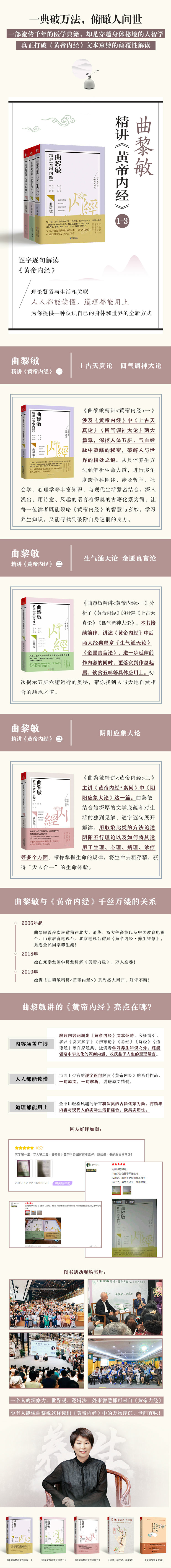 曲黎敏,北京师范大学文学学士,北京中医药大学医学硕士,曾任北京中医药大学副教授、硕士生导师。著有广受好评的《从头到脚说健康》《从字到人》《中医与传统文化》《生命沉思录》《诗经:越古老,越美好》《诗经2:情到深处是中庸》《曲黎敏精讲<黄帝内经>》系列等。