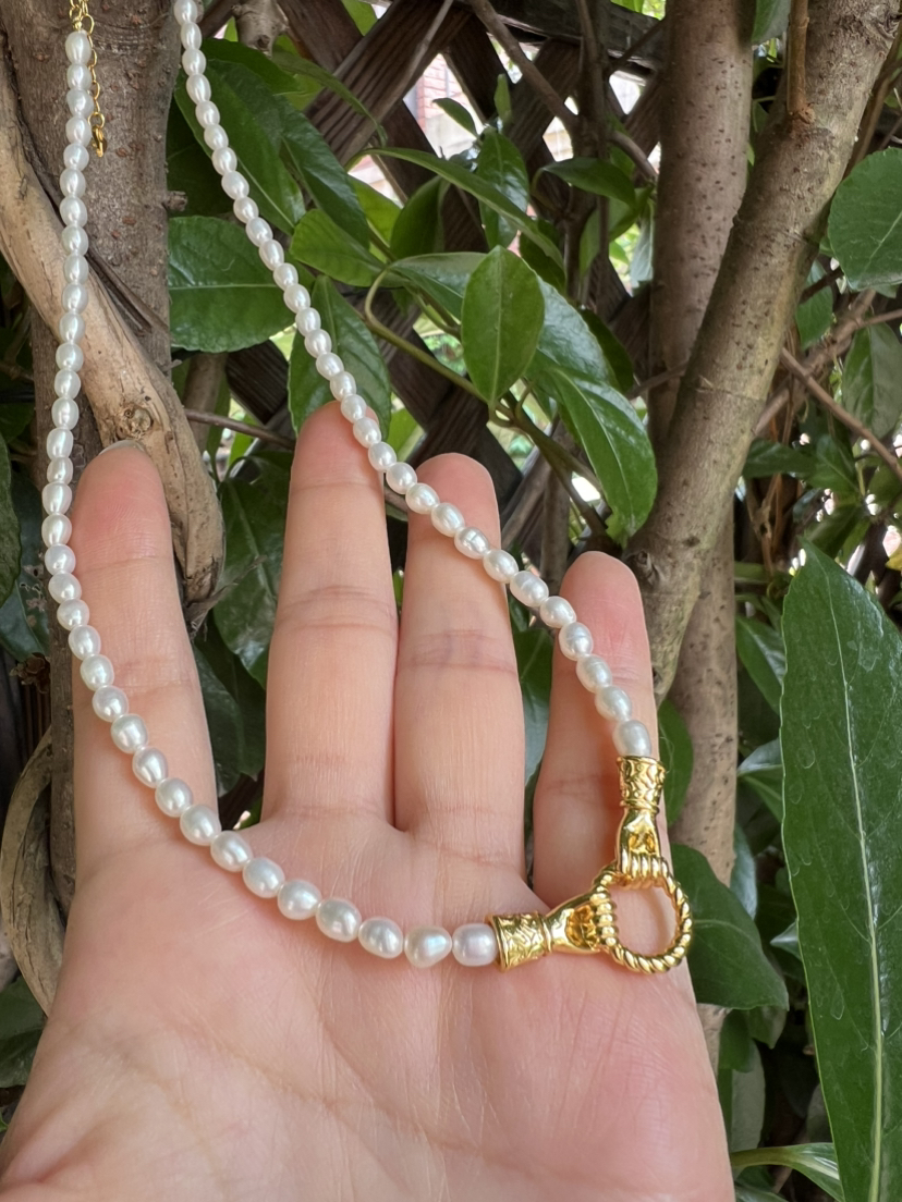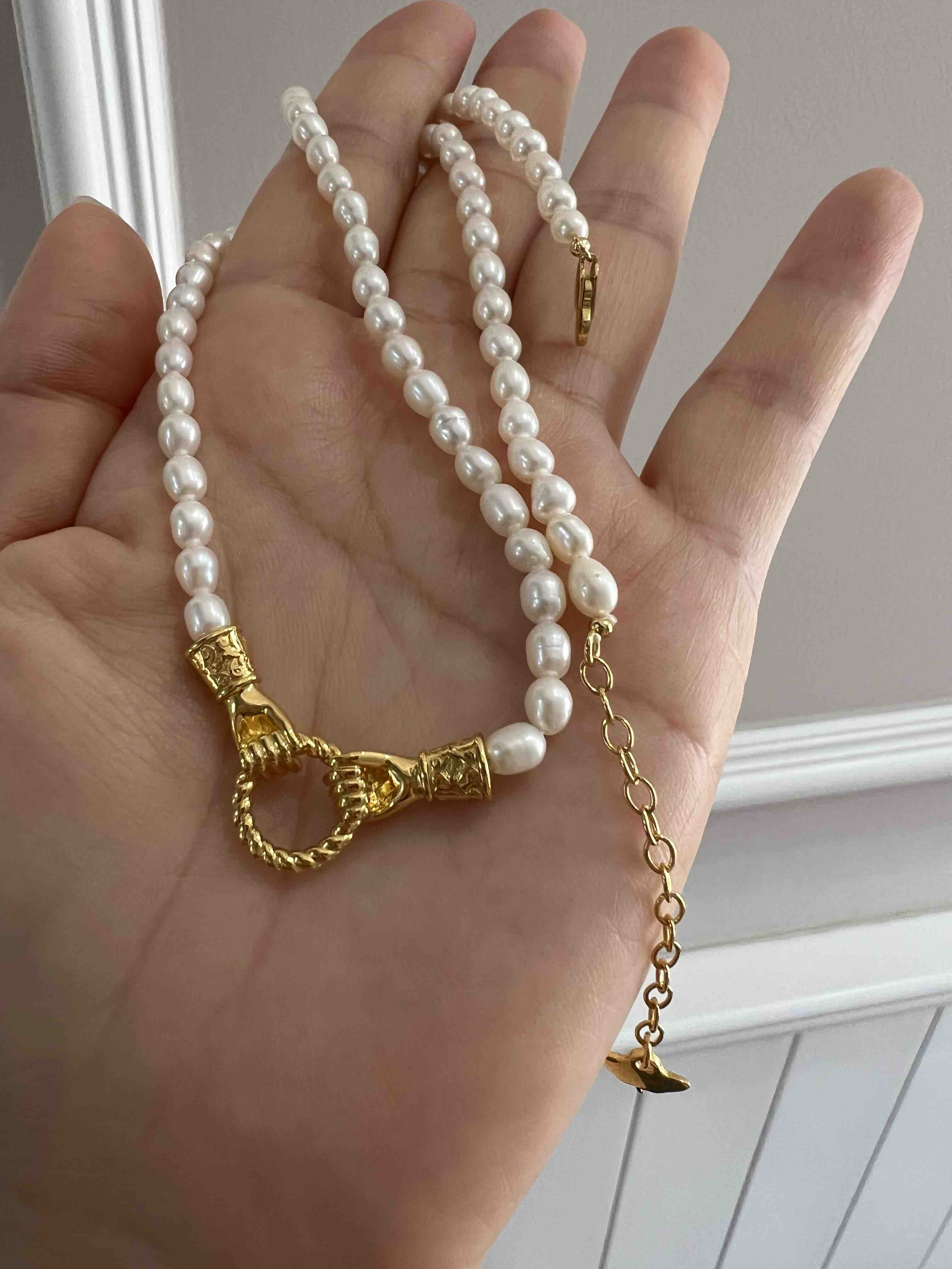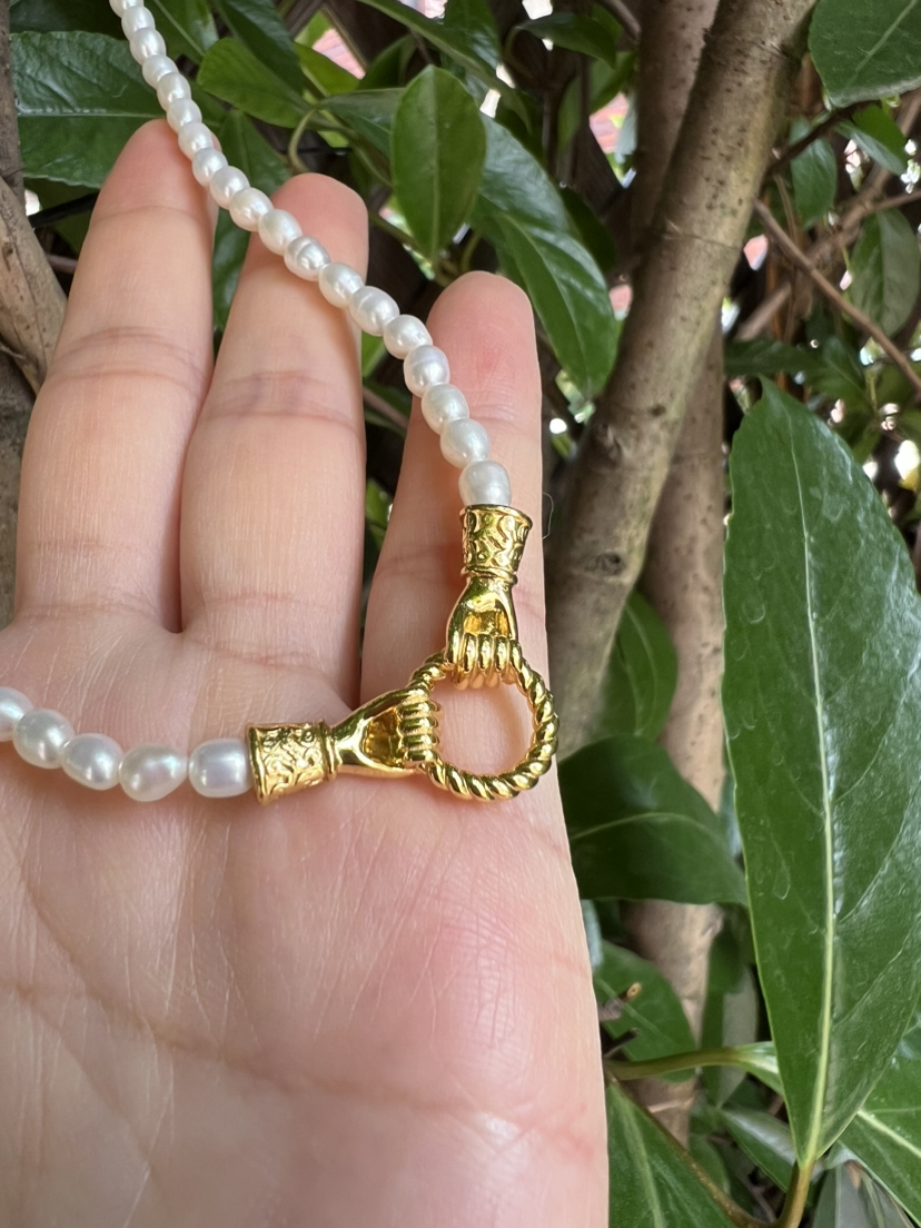 Mis英国小众 执子之手 天然小米珠 设计感珍珠项链。这个双手牵手的五金双环自己看,一定要仔细看,就是男女的手,牵上一个环,mis的设计感一直都是在线的,执子之手与子偕老,这个不重要,项链咱们自己买,不过这个设计确实点睛之笔。天然小米珠起码夏天的体感式很温润舒适的,一毛一样925银镀金材质,性价比max