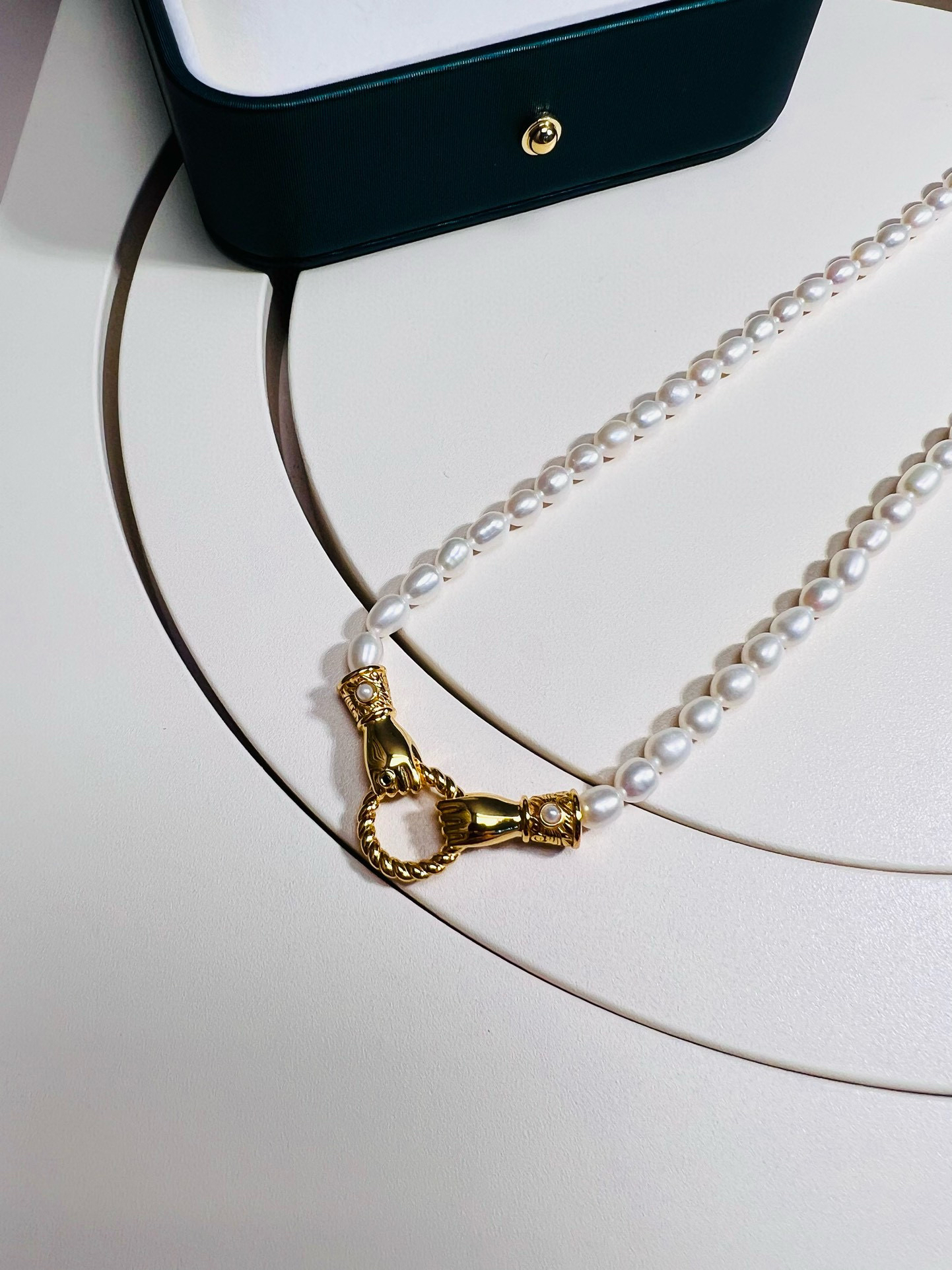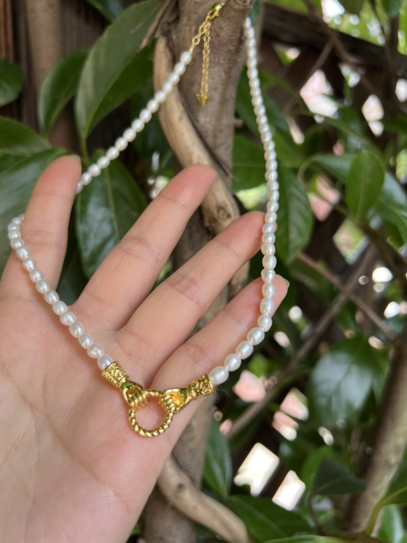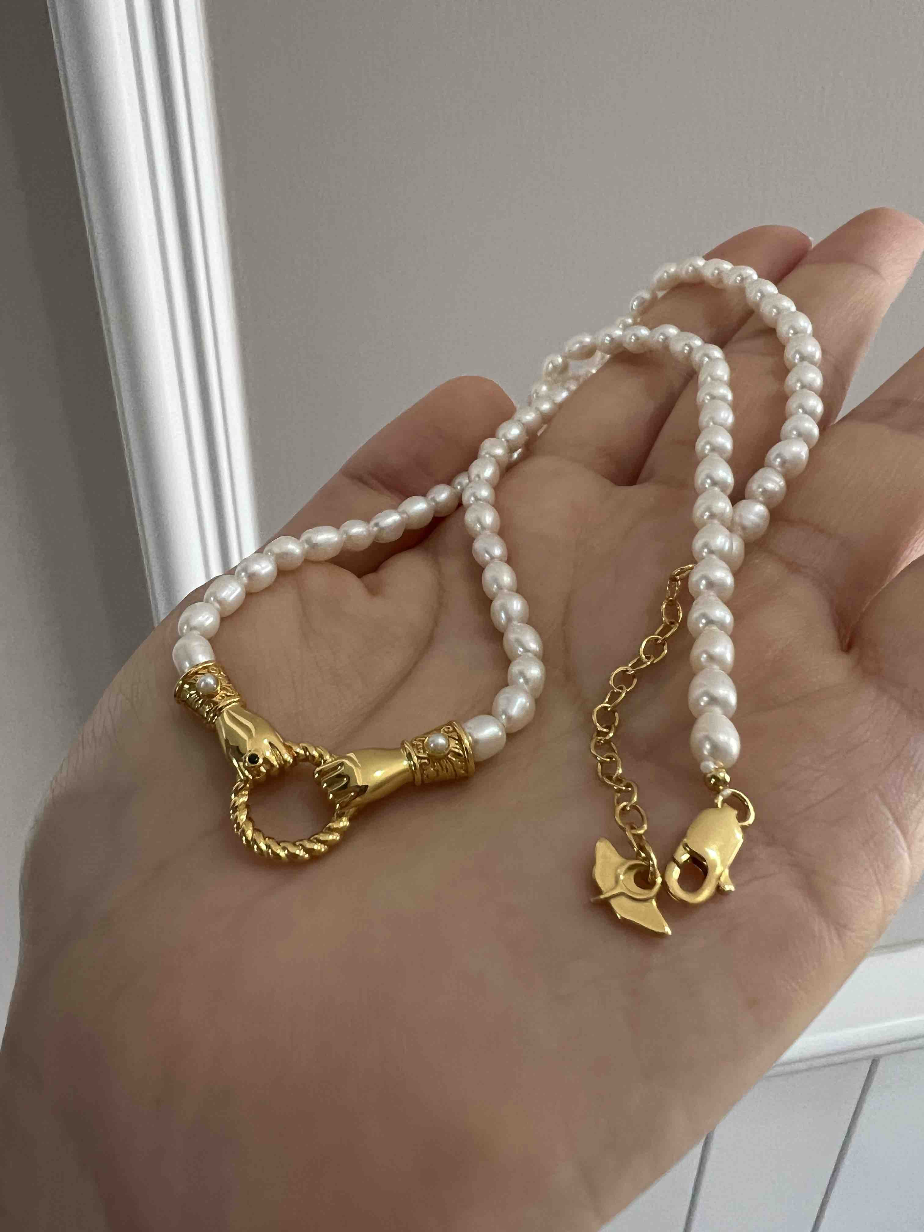 Mis英国小众 执子之手 天然小米珠 设计感珍珠项链。这个双手牵手的五金双环自己看,一定要仔细看,就是男女的手,牵上一个环,mis的设计感一直都是在线的,执子之手与子偕老,这个不重要,项链咱们自己买,不过这个设计确实点睛之笔。天然小米珠起码夏天的体感式很温润舒适的,一毛一样925银镀金材质,性价比max