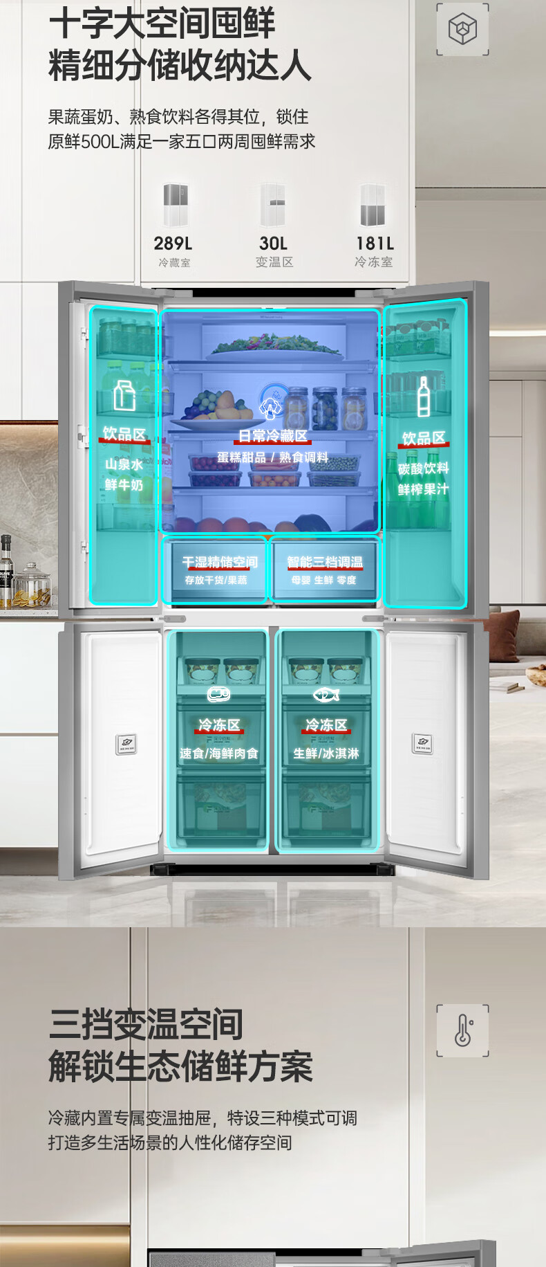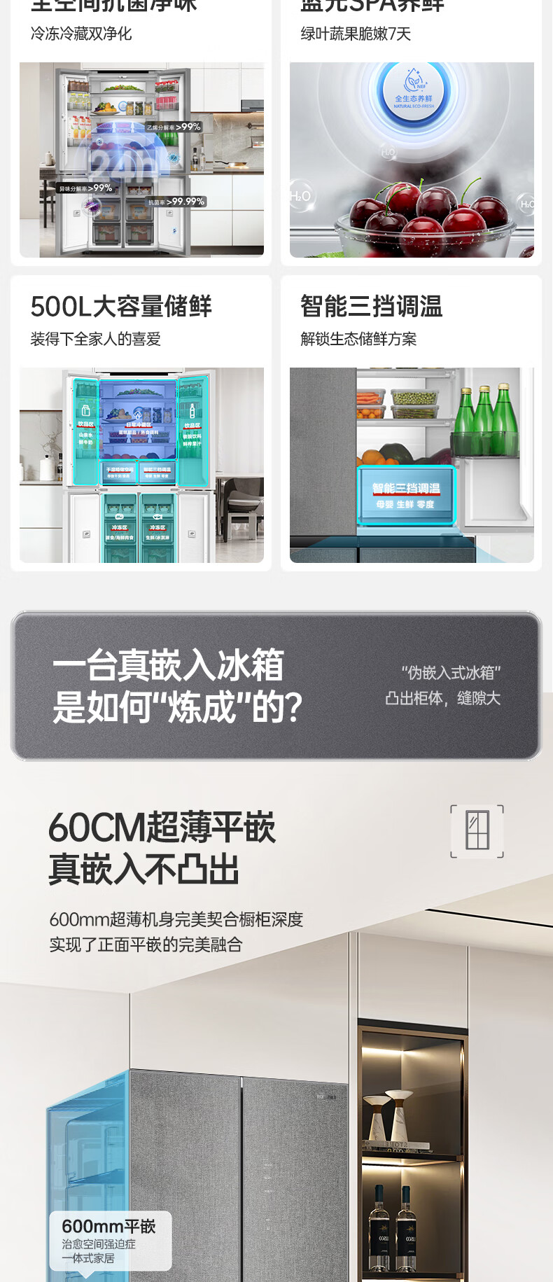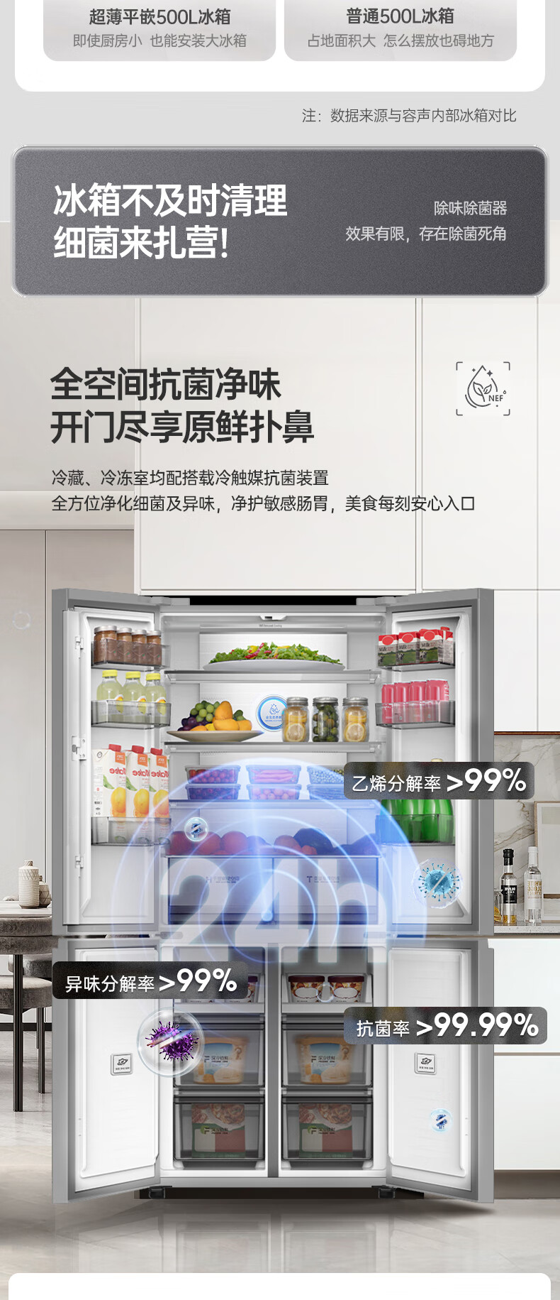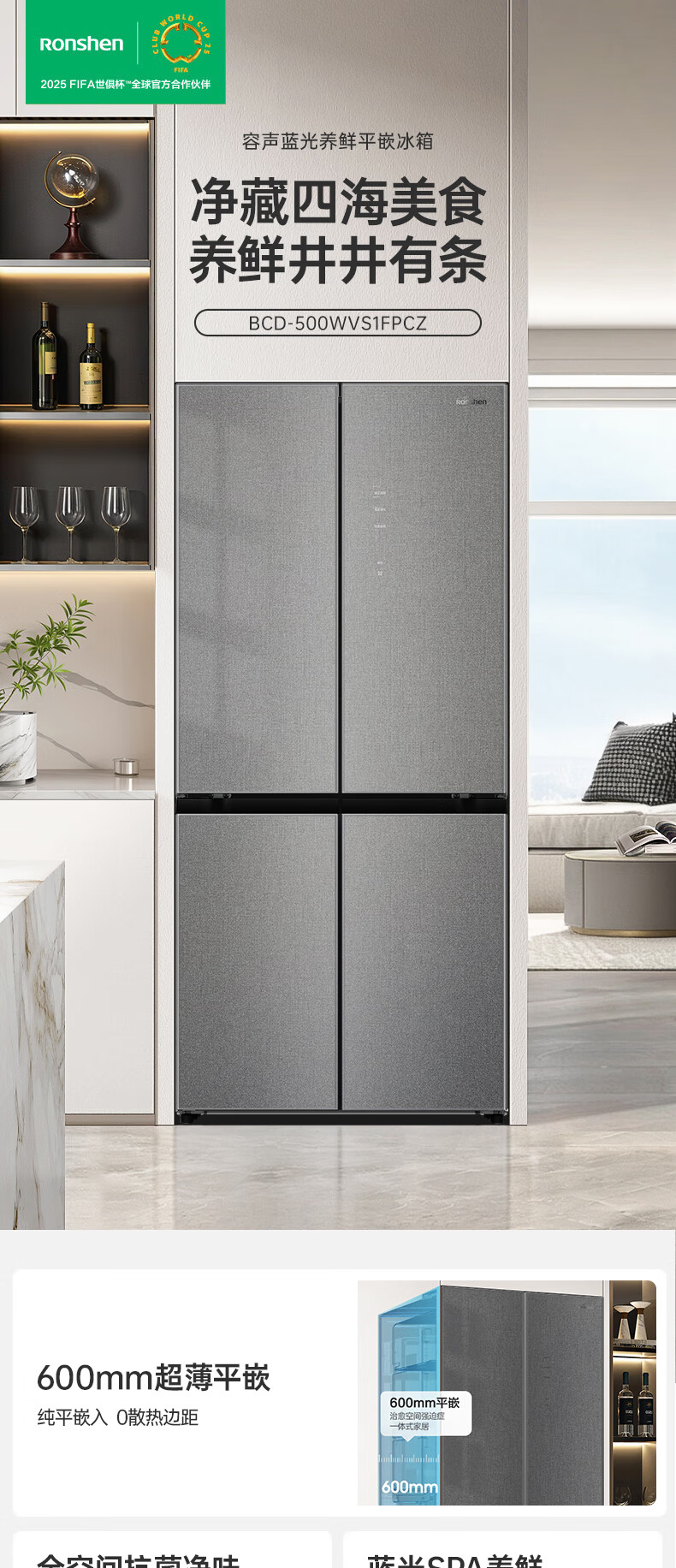 容声(Ronshen)500升 双净·超薄平嵌 十字四门冰箱 全空间抗菌净味 蓝光SPA养鲜 AI智慧温控 远程控制 一级变频 玻璃面板 风冷无霜BCD-500WVS1FPCZ
