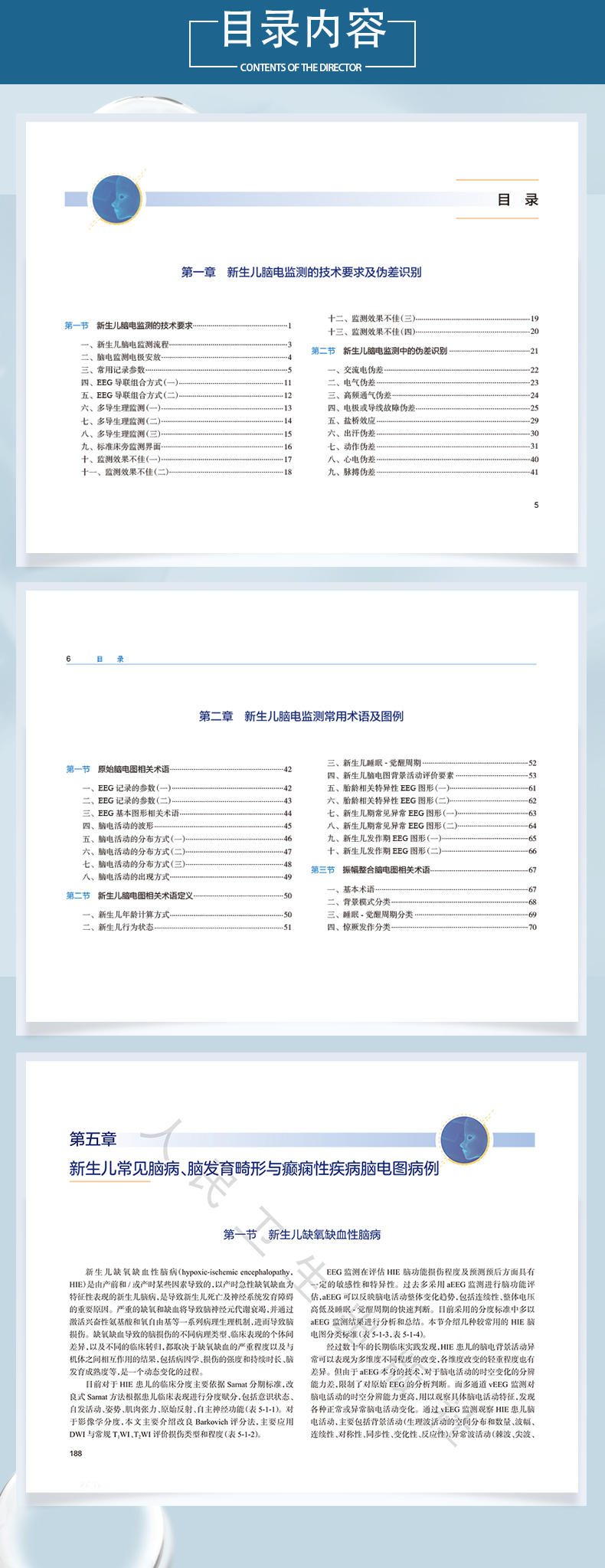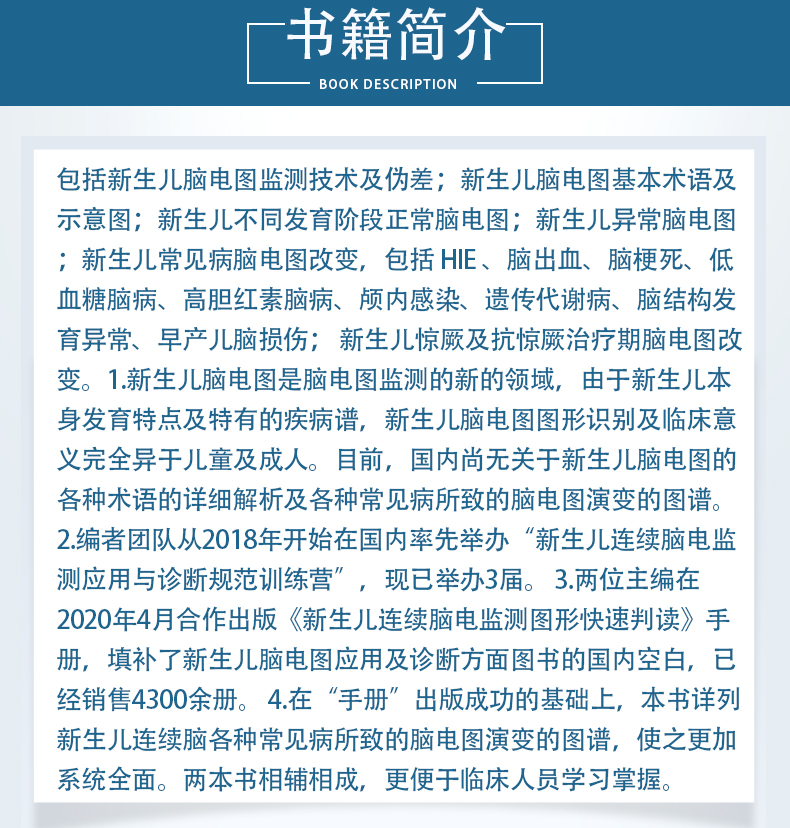 包括新生儿脑电图监测技术及伪差;新生儿脑电图基本术语及示意图;新生儿不同发育阶段正常脑电图;新生儿异常脑电图;新生儿常见病脑电图改变,包括 HIE 、脑出血、脑梗死、低血糖脑病、高胆红素脑病、颅内感染、遗传代谢病、脑结构发育异常、早产儿脑损伤; 新生儿惊厥及抗惊厥治疗期脑电图改变。1.新生儿脑电图是脑电图监测的新的领域,由于新生儿本身发育特点及特有的疾病谱,新生儿脑电图图形识别及临床意义完全异于儿童及成人。目前,国内尚无关于新生儿脑电图的各种术语的详细解析及各种常见病所致的脑电图演变的图谱。2.编者团队从2018年开始在国内率先举办“新生儿连续脑电监测应用与诊断规范训练营”,现已举办3届。3.两位主编在2020年4月合作出版《新生儿连续脑电监测图形快速判读》手册,填补了新生儿脑电图应用及诊断方面图书的国内空白,已经销售4300余册。4.在“手册”出版成功的基础上,本书详列新生儿连续脑各种常见病所致的脑电图演变的图谱,使之更加系统全面。两本书相辅相成,更便于临床人员学习掌握。