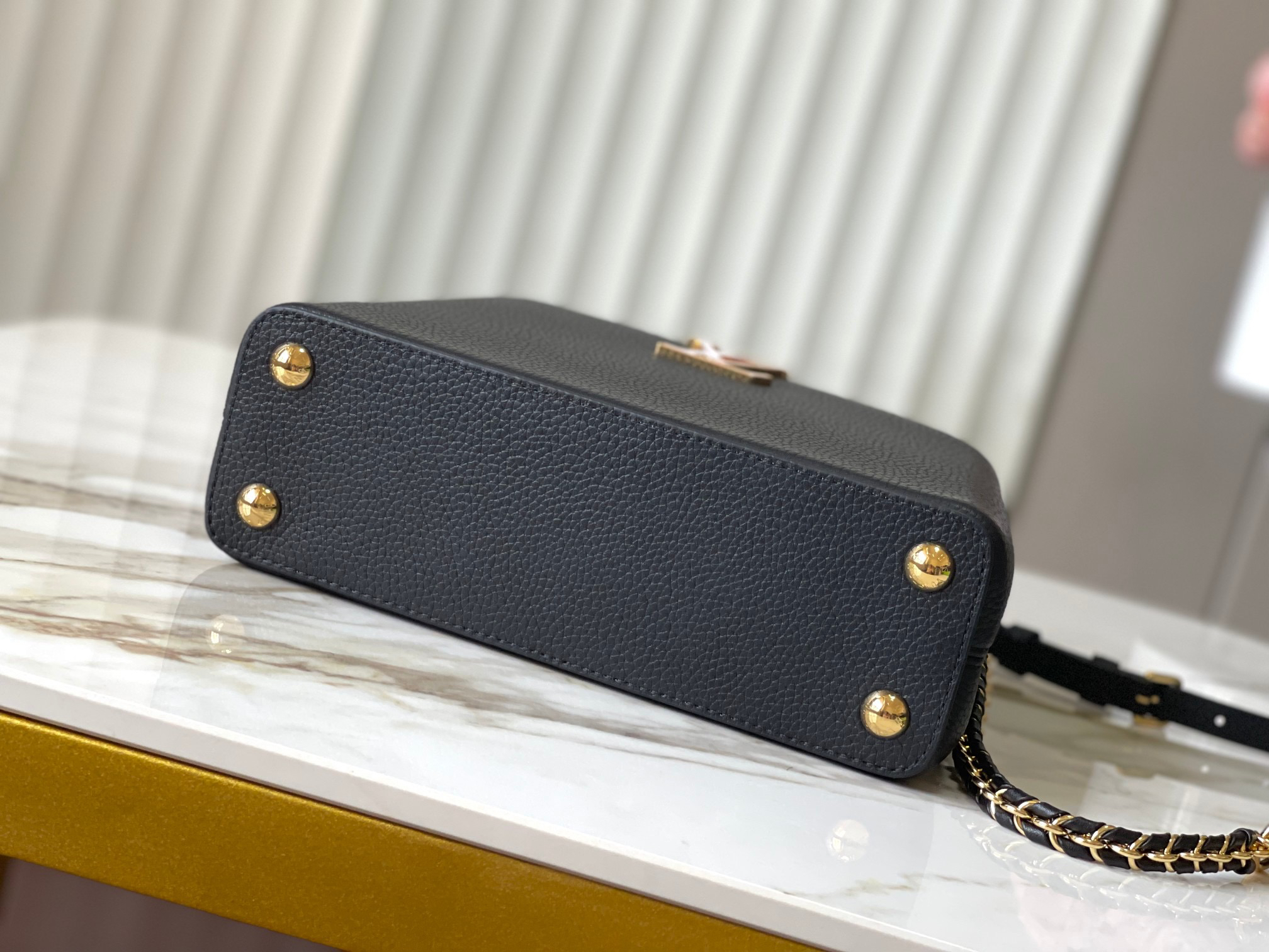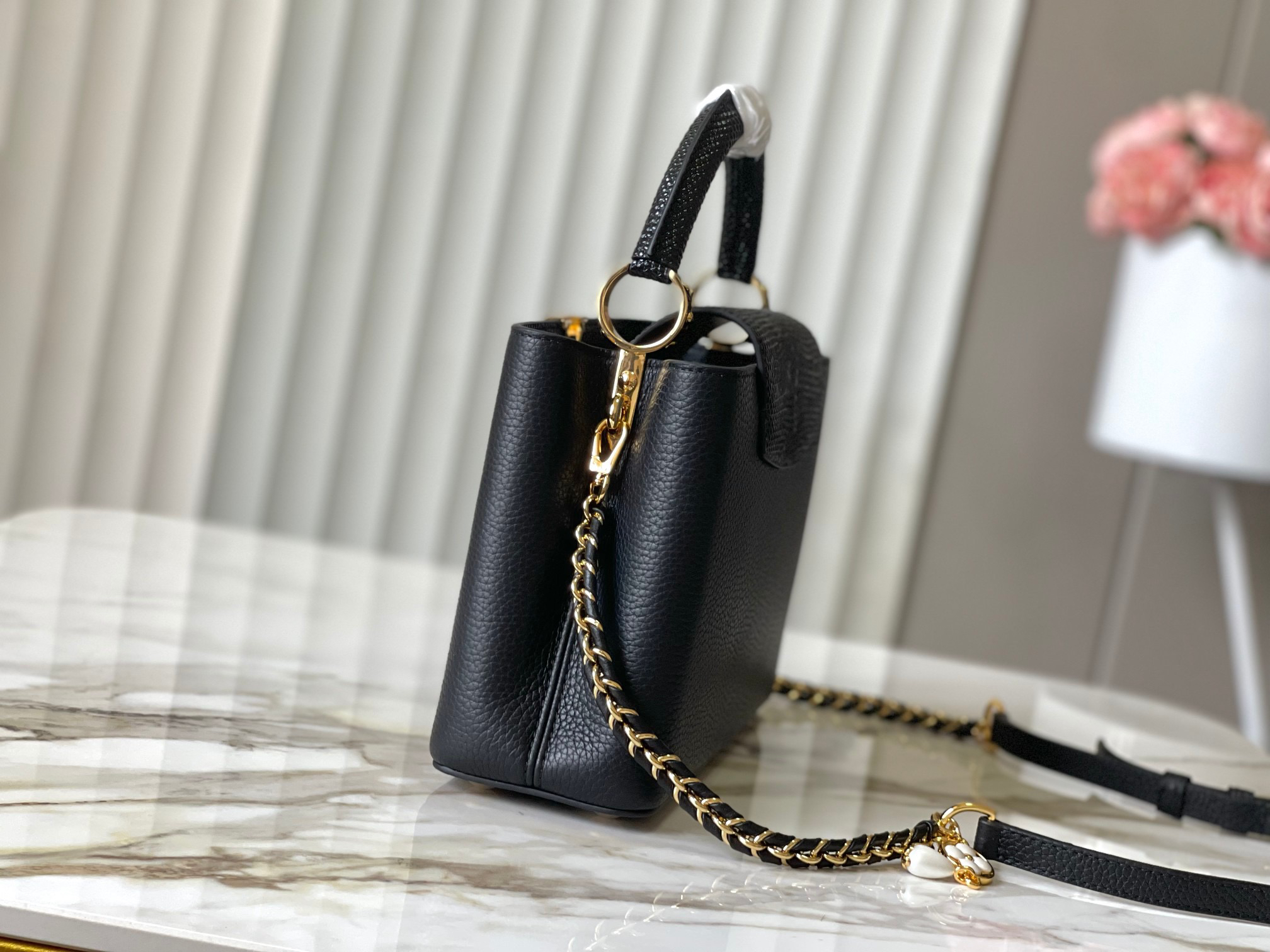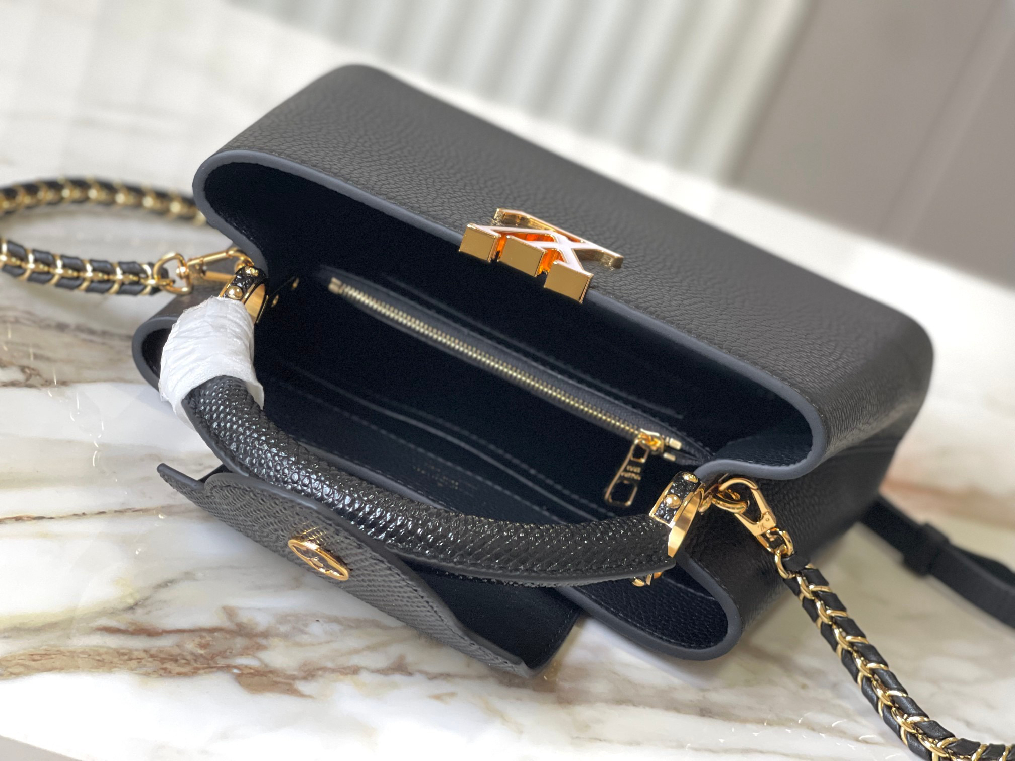 秋冬特惠💰1700 渠道级LV 新品 te级LV 动态芯片 M25611/M48865黑蜥蜴贝母珍珠链条 本款手袋出自Capucines Daydream系列 为Taurillon 牛皮革浸染摩登色调 搭配贝壳质感元素、标志性LV字母和可拆卸编织链条 牛皮革和蛇皮革饰边营造撞色反差 翻盖提供外置或内收两式风尚 可轻松收纳短款钱夹和随行小物 Size : 27 * 18 * 9 CM