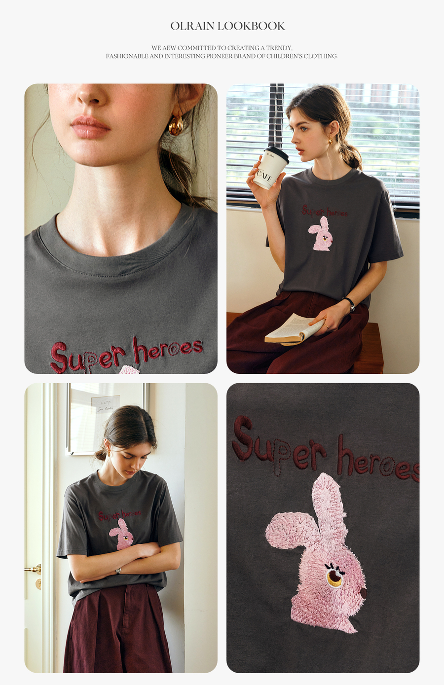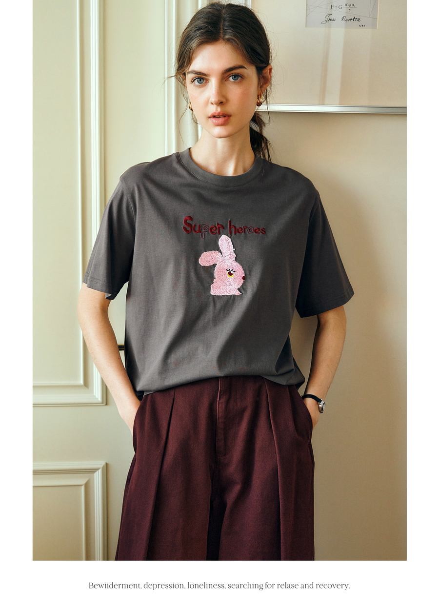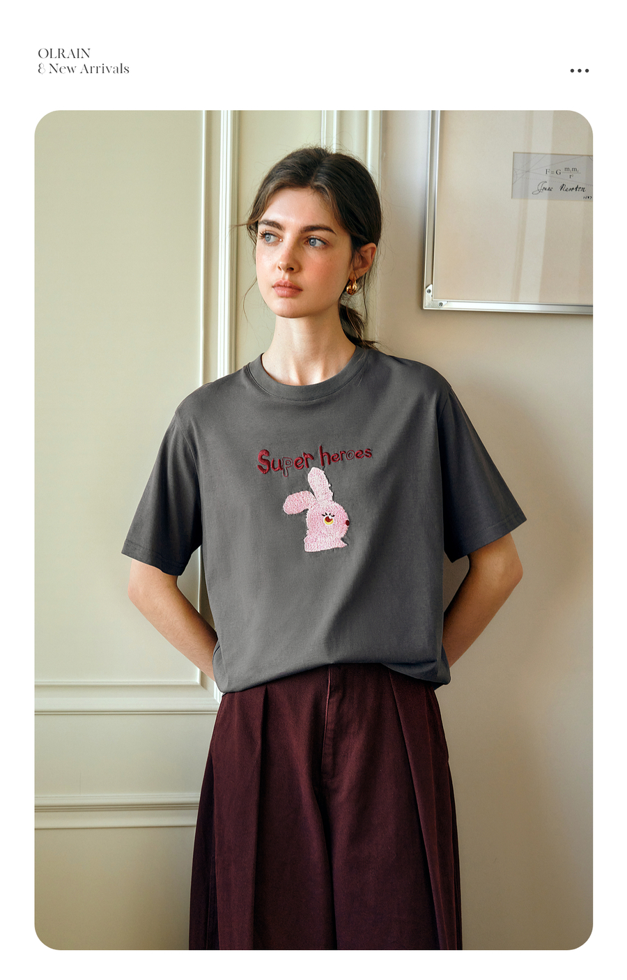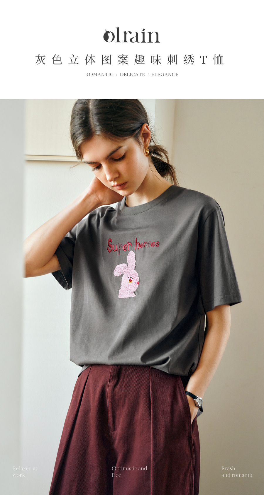 OLrain欧芮儿灰色短袖T恤女夏季2025年新款立体趣味宽松长袖上衣