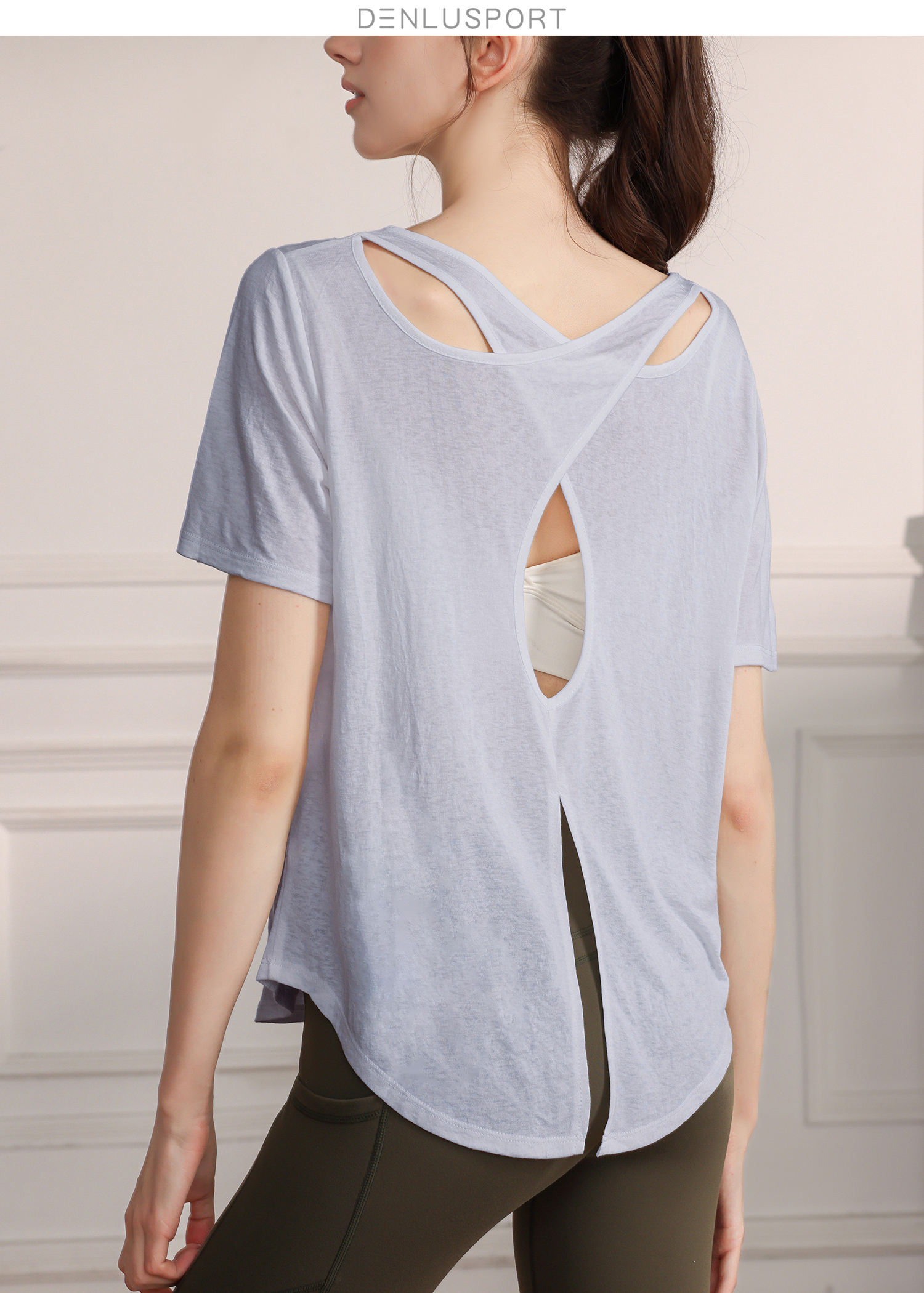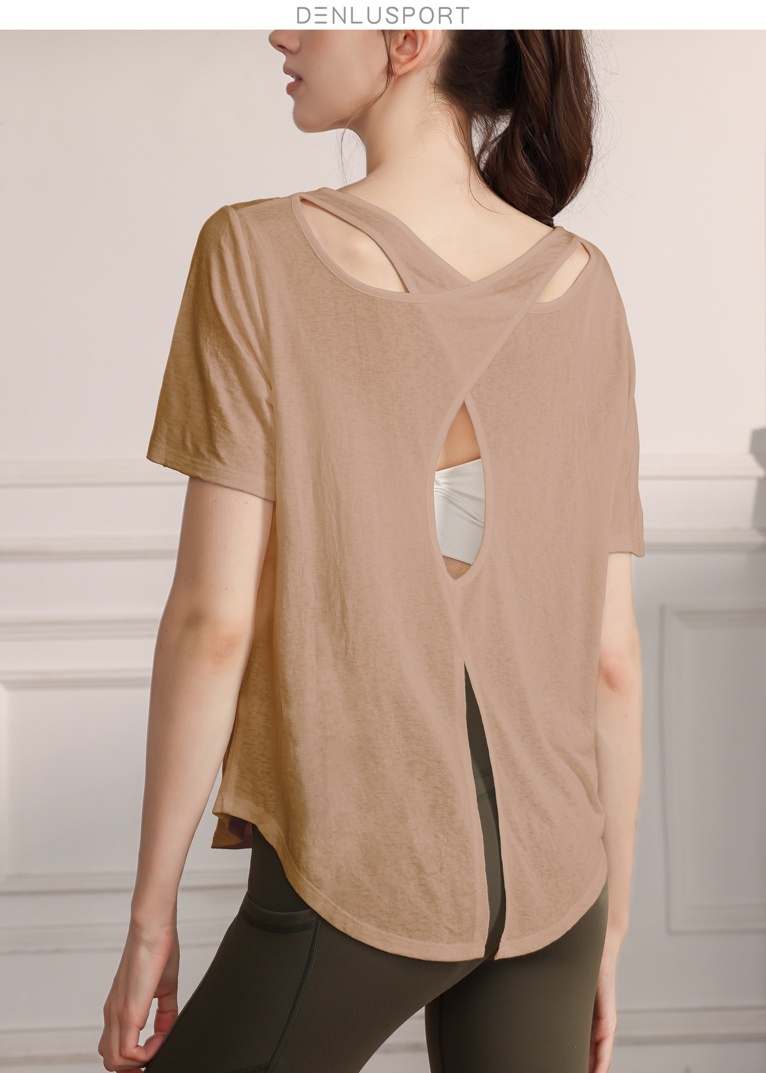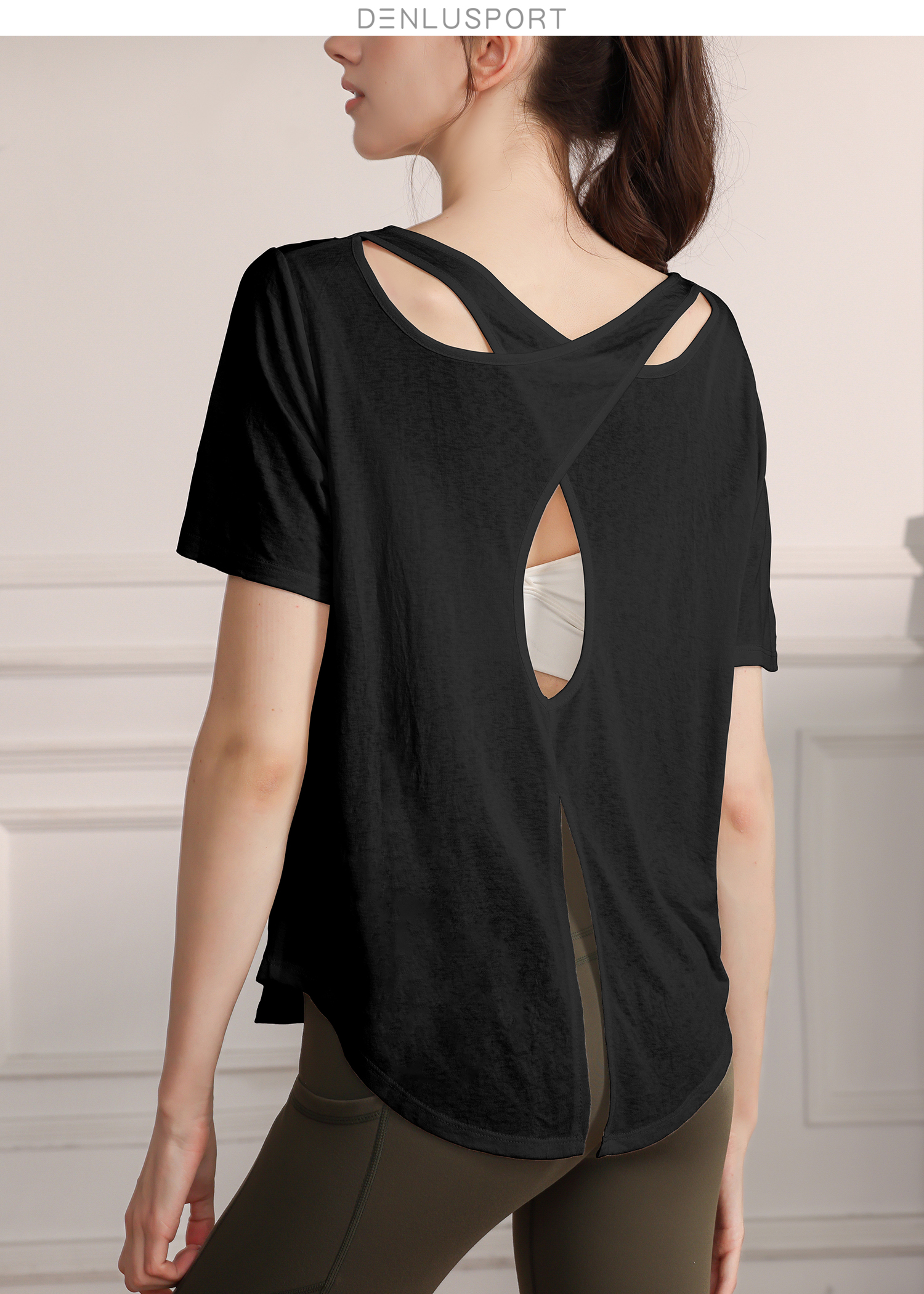 DENLUS新品天丝雪花美背瑜伽服罩衫 纯色镂空圆领短T DY66177#