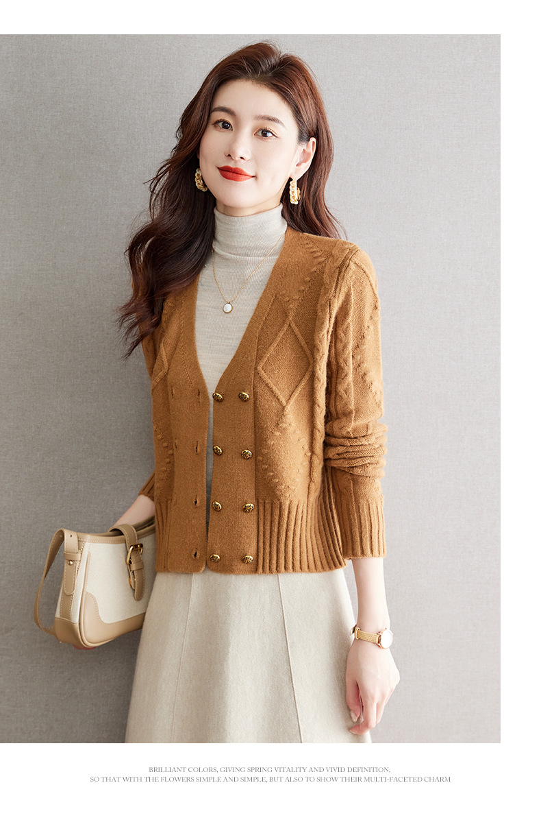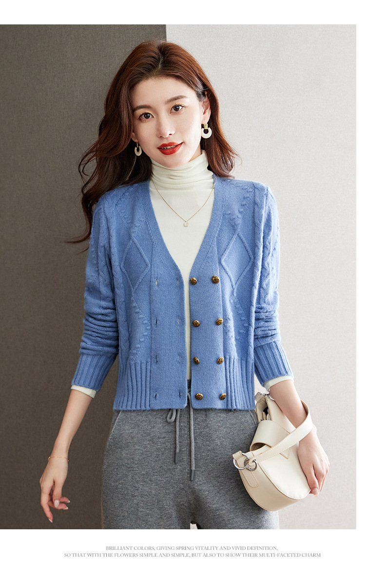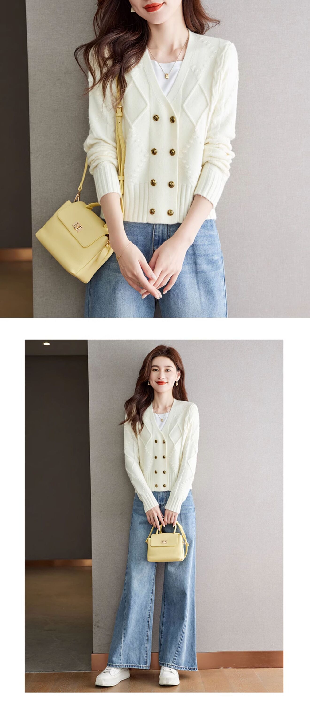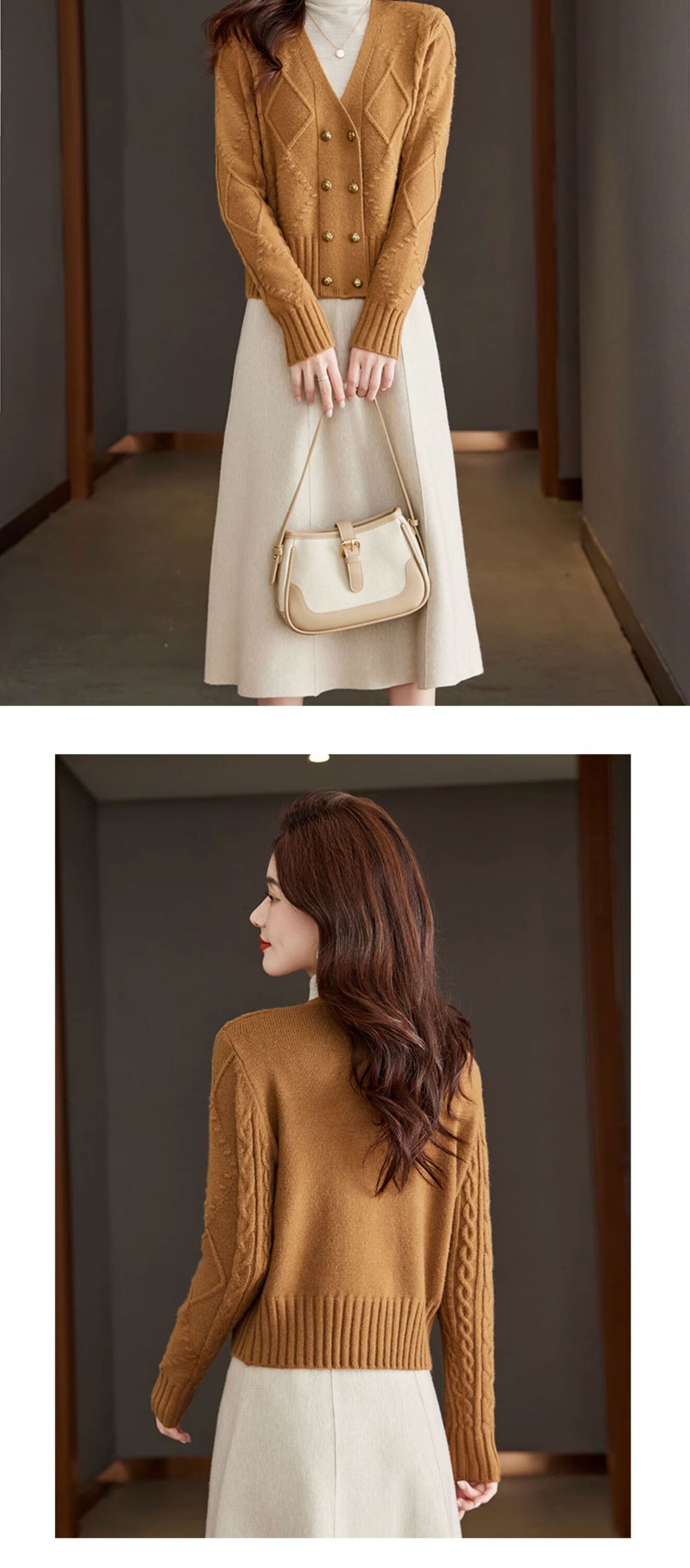 双排扣v领针织开衫,春秋新款早秋高腰外搭上衣毛衣外套CC-J237