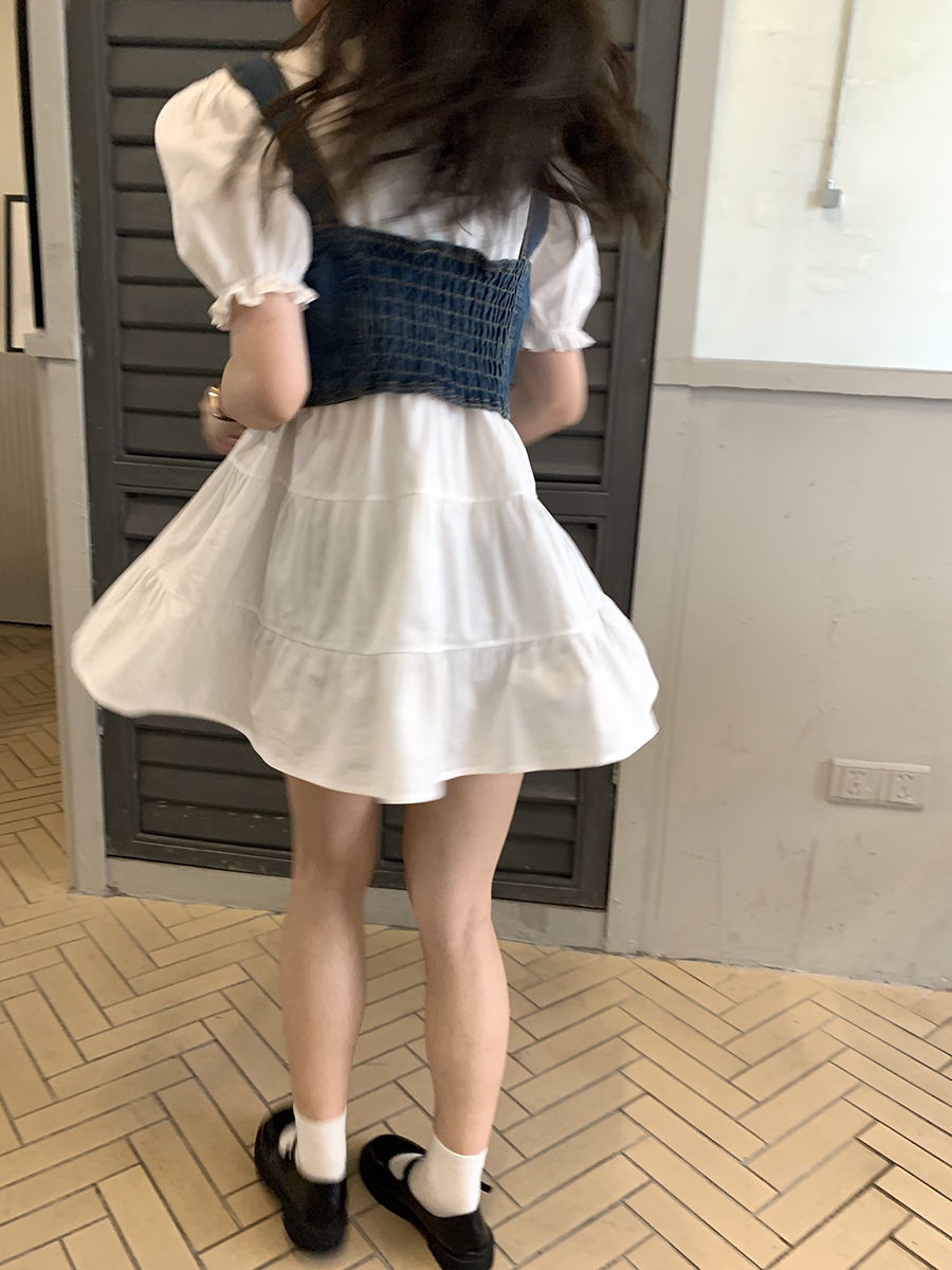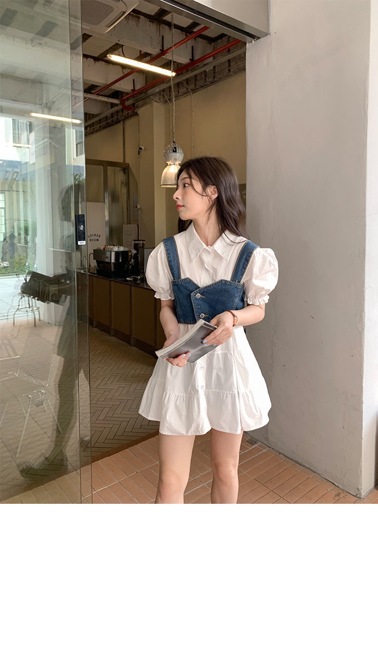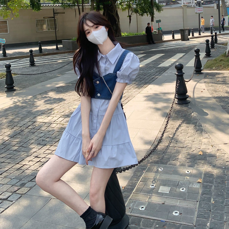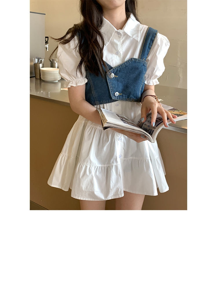 【G商品推广】夏季甜辣风牛仔吊带泡泡袖衬衣套装