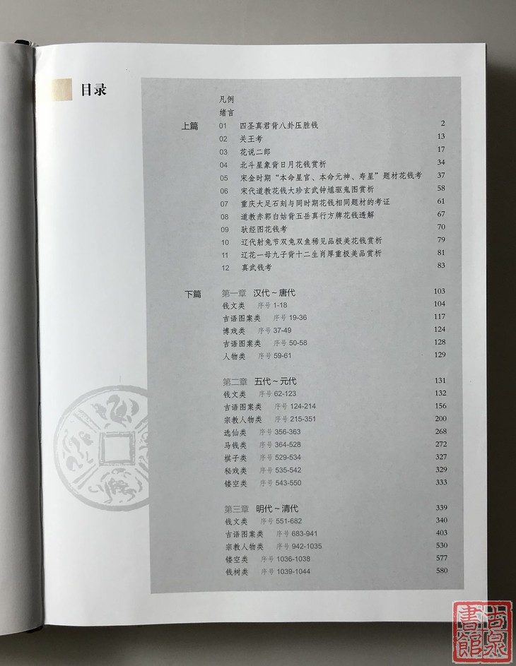 本书以中国古代厌胜钱断代为线索,完整梳理了厌胜钱发展体系,将钱币分为七个等级,收录钱币包括青铜、铜、金、银等材质,亦有钱范、币模等珍贵藏品,且多为刊布实物资料,具有定的历史价值和艺术价值。 书中钱币收藏相关的文章由民间收藏家王宁、刘源主笔,从收藏家的视角以亲身收藏实践揭示收藏万象,讲述古代厌胜钱的收藏人生。