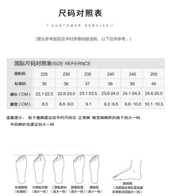 尺码表:关于尺码 : 鞋子瘦脚建议按平时尺码买 正常脚 略宽脚脚胖的妹子拍大一码 半码脚的也建议拍大一码 PS:刚试穿如果鞋子长度够的话脚感略紧的话真.皮穿穿就会合脚