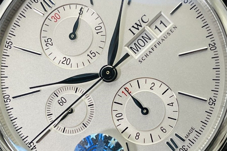 盘面上镶嵌有条钉形时标刻度,白钢刻度精致立体,固定在表盘上的工艺和正品一样;指针设计精妙,延续柏涛菲诺的柳叶形指针,经过ZF厂的专业处理,线条柔和亮眼,指针长短粗细和正品几乎一样,秒针尖端干净利索;三个小表盘布局一致,细节做工同步;十二点钟方向设有三十分钟计时,六点钟方向设有十二小时计时,并在九点钟方向设有小秒盘。此外,三点钟设有日历星期视窗,功能简单实用。ZF秉承典雅气质,将此腕表复刻到顶级水平。