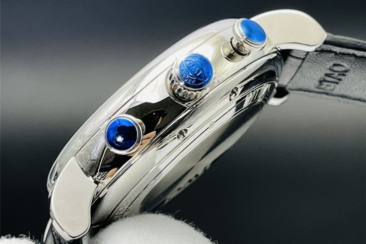 表冠采用了ZF顶级打磨抛光的工艺,效果追赶正品,表冠采用三角抗纹设计,防滑齿纹间距适中,倒角打磨光滑。表冠调节手感与正品相同,顶部万国logo十分清晰显眼。表壳背部切割层次分明,表耳与中壳搭配得体。表壳侧部上方是计时开始与暂停的把头,下方是归零把头,ZF厂将功能还原的宛如正品。