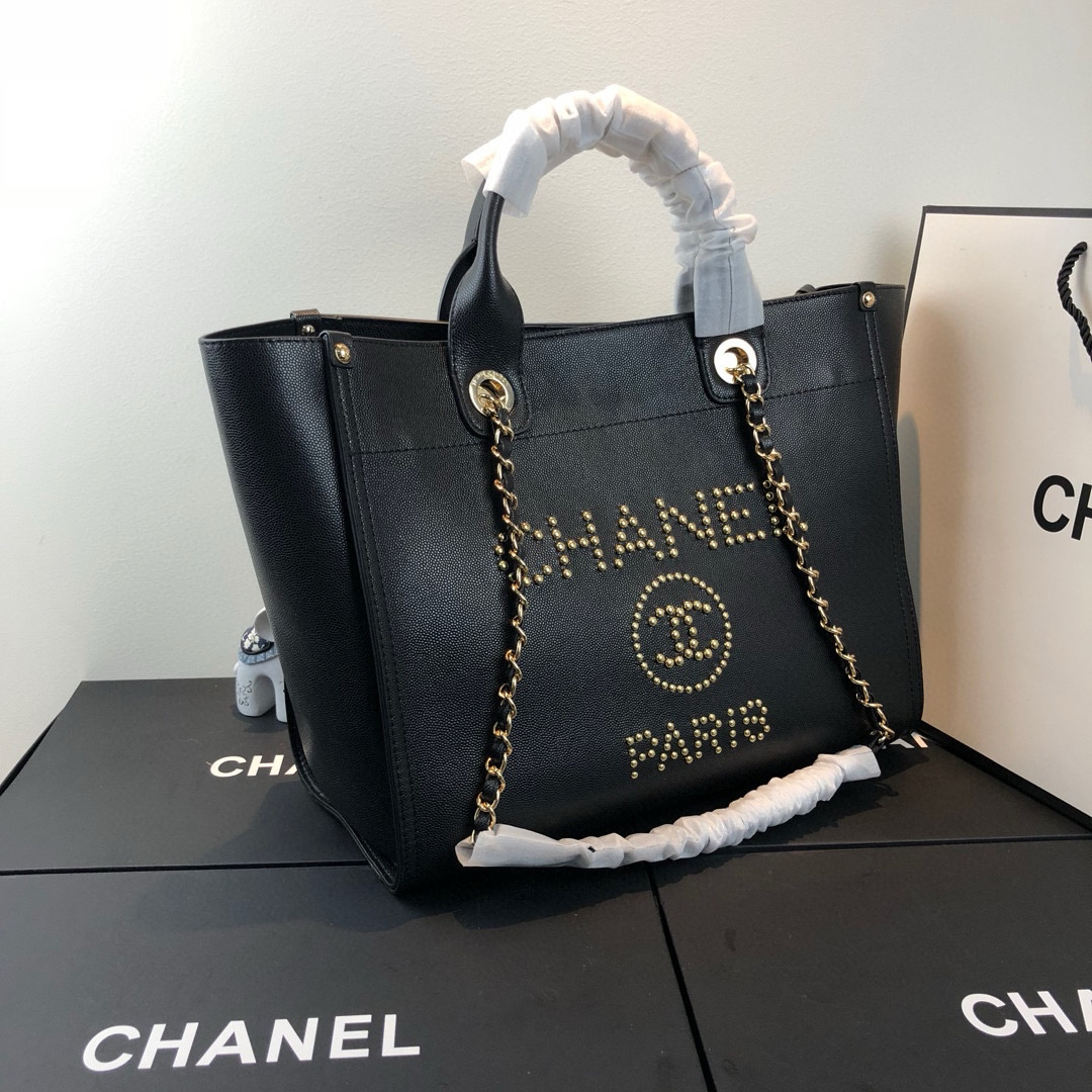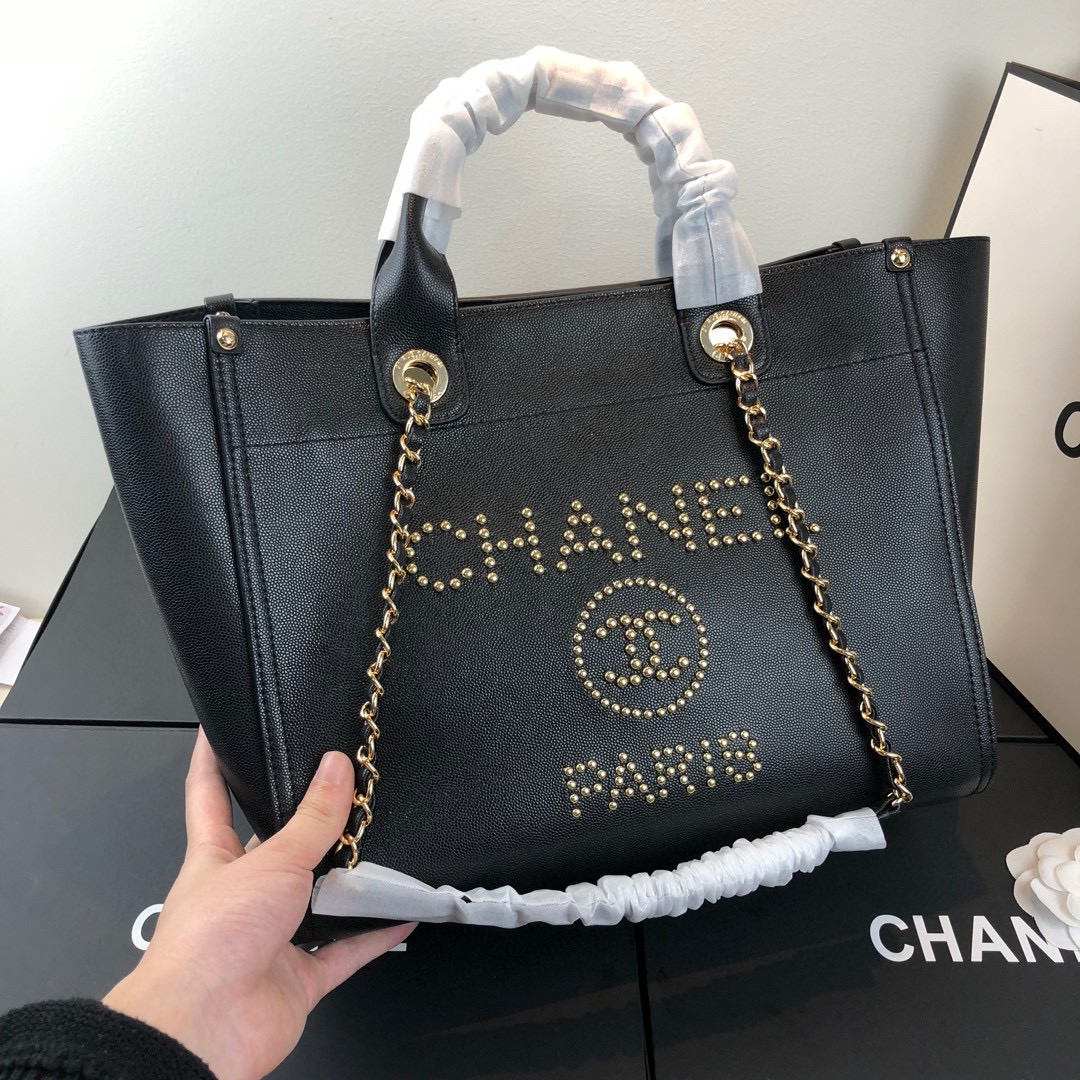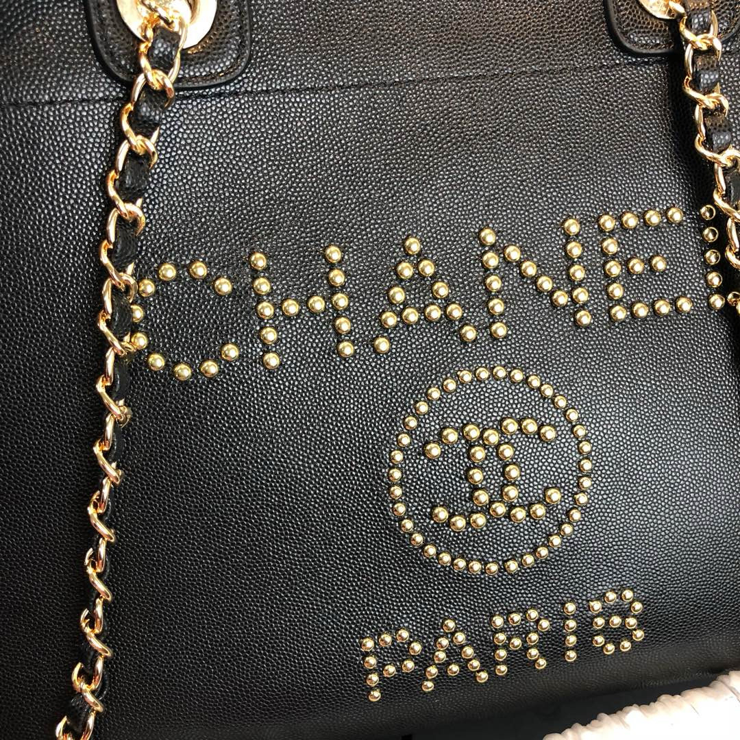 夏季特惠💰1200 原单香奈儿57067 Coco 早春走秀款 金属钉珠鱼子酱牛皮购物袋 钉珠大LOGO字母装饰 金属钉珠全手工定制 容量大 底部配有脚钉 上身超级好看 亦可手提肩背两用包 size:33*27.5*16cm