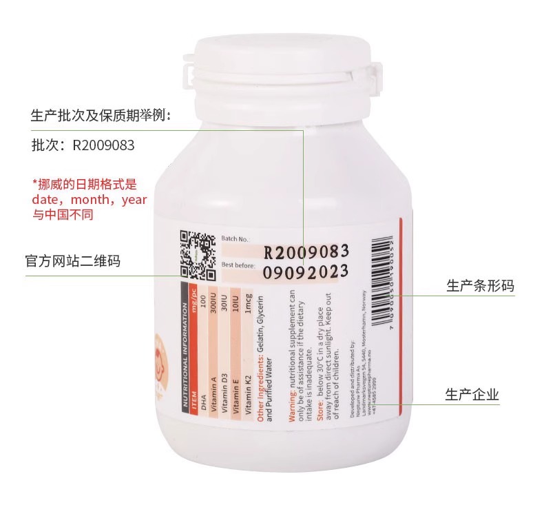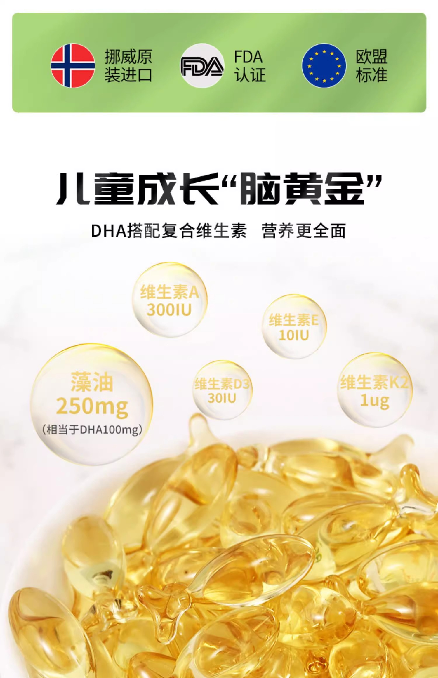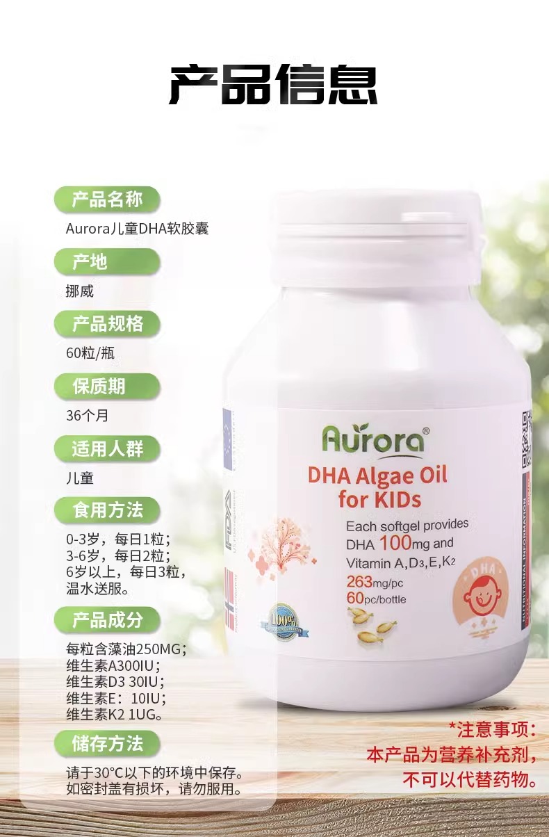 (菜鸟)Aurora儿童DHA藻油复合维生素胶囊进口维他命60粒婴幼儿专用补脑