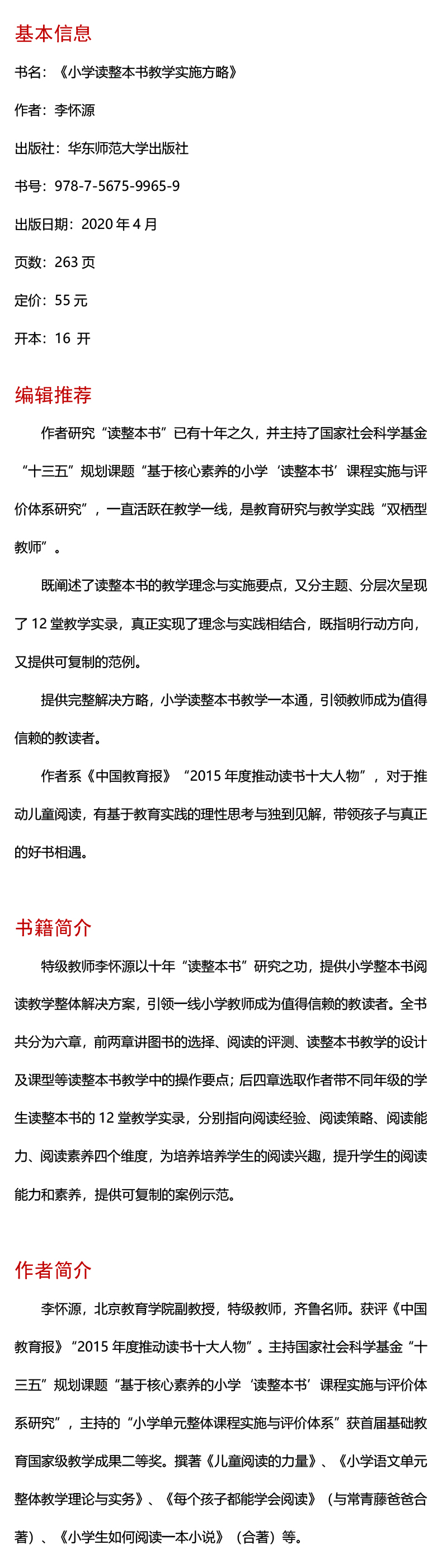 特级教师李怀源以十年“读整本书”研究之功,提供小学整本书阅读教学整体解决方案,引领一线小学教师成为值得信赖的教读者。全书共分为六章,前两章讲图书的选择、阅读的评测、读整本书教学的设计及课型等读整本书教学中的操作要点;后四章选取作者带不同年级的学生读整本书的12堂教学实录,分别指向阅读经验、阅读策略、阅读能力、阅读素养四个维度,为培养培养学生的阅读兴趣,提升学生的阅读能力和素养,提供可复制的案例示范。