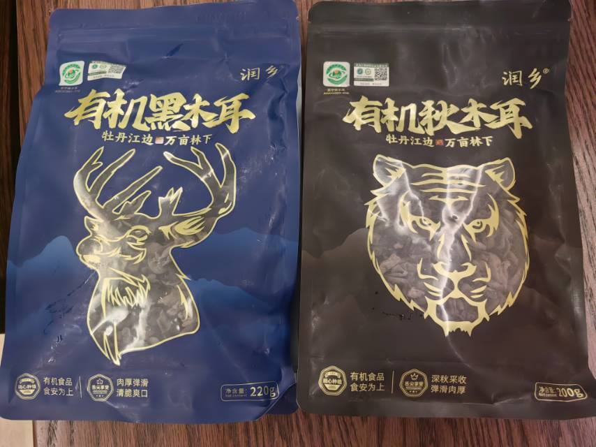 1. 双有机木耳,润乡秋木耳能达到一级标准:黑褐色,有光泽,背部灰色,朵片完整,含水量≤12%,耳片厚度1mm以上,杂质低于0.3%。新鲜打包,开袋没有酸、臭等异味。