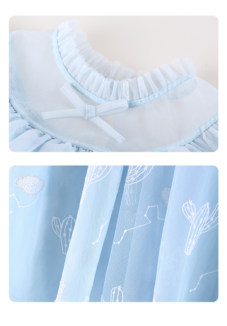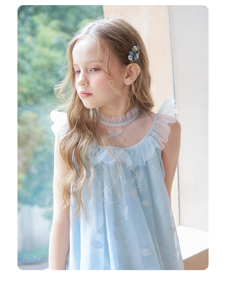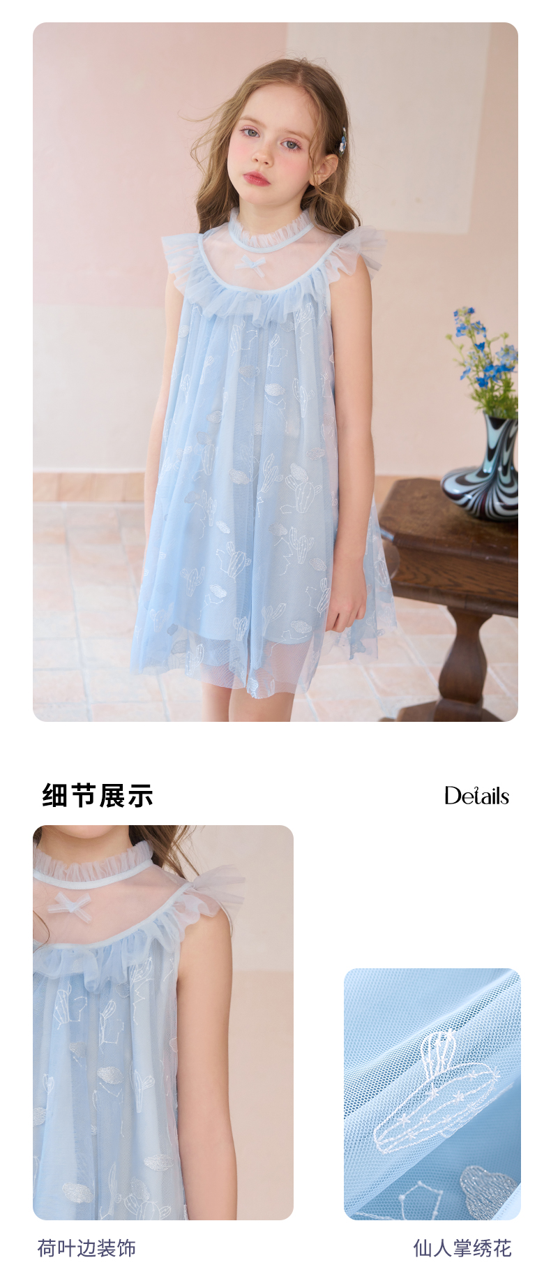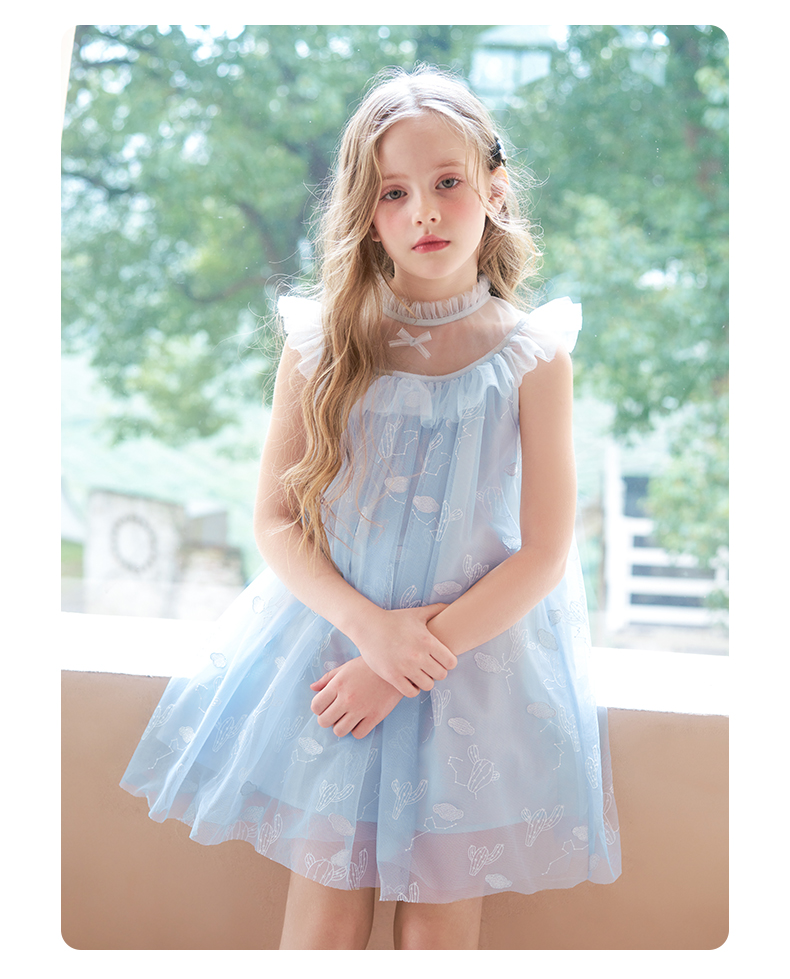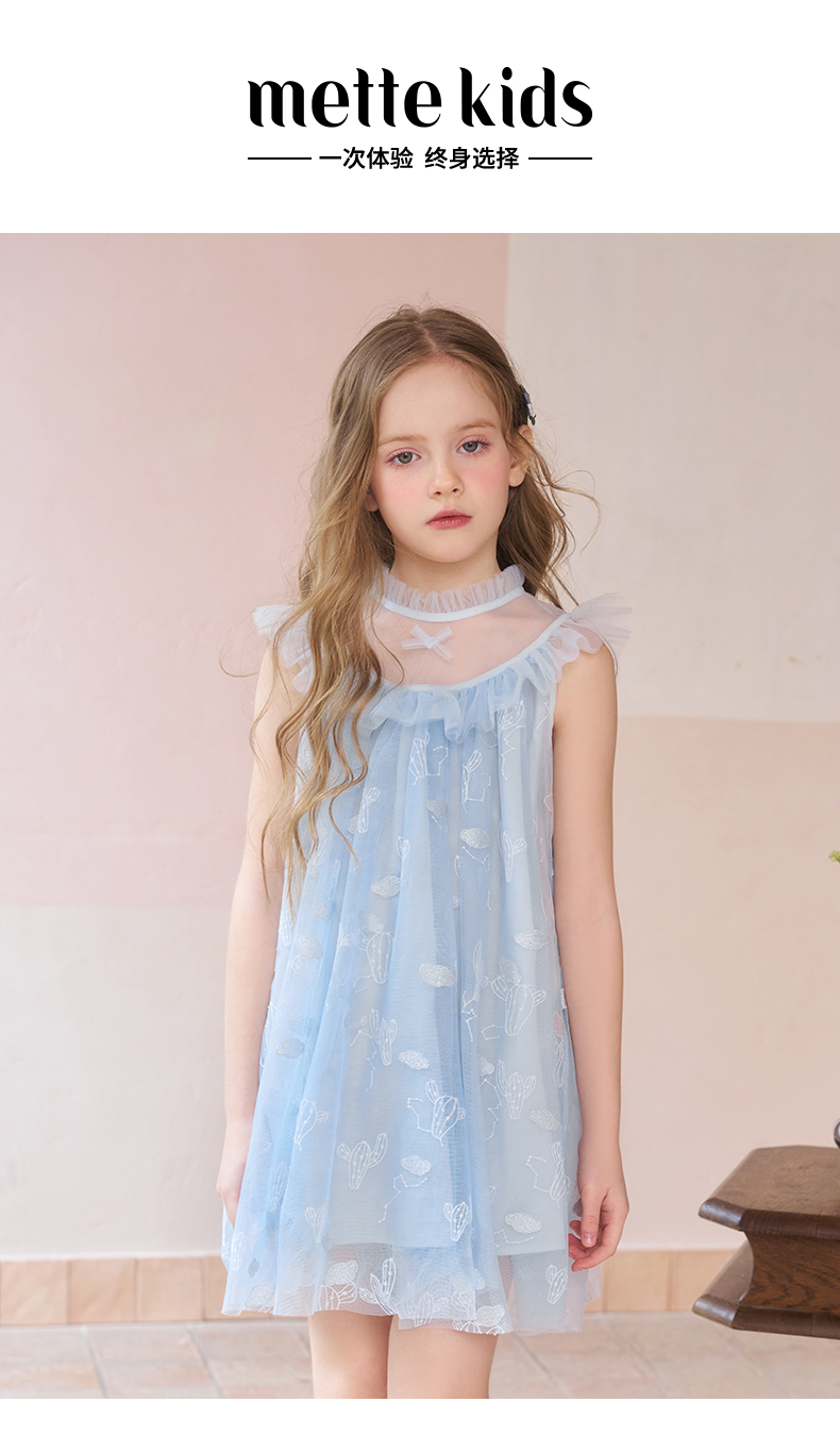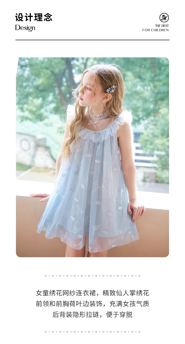 mettekids女童连衣裙夏季女孩甜美网纱公主裙儿童蓝色绣花裙子