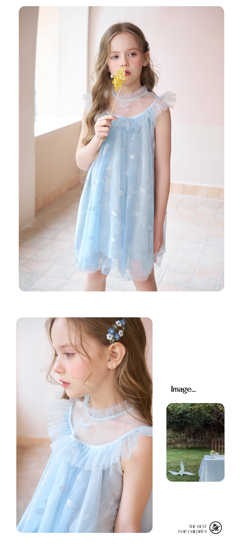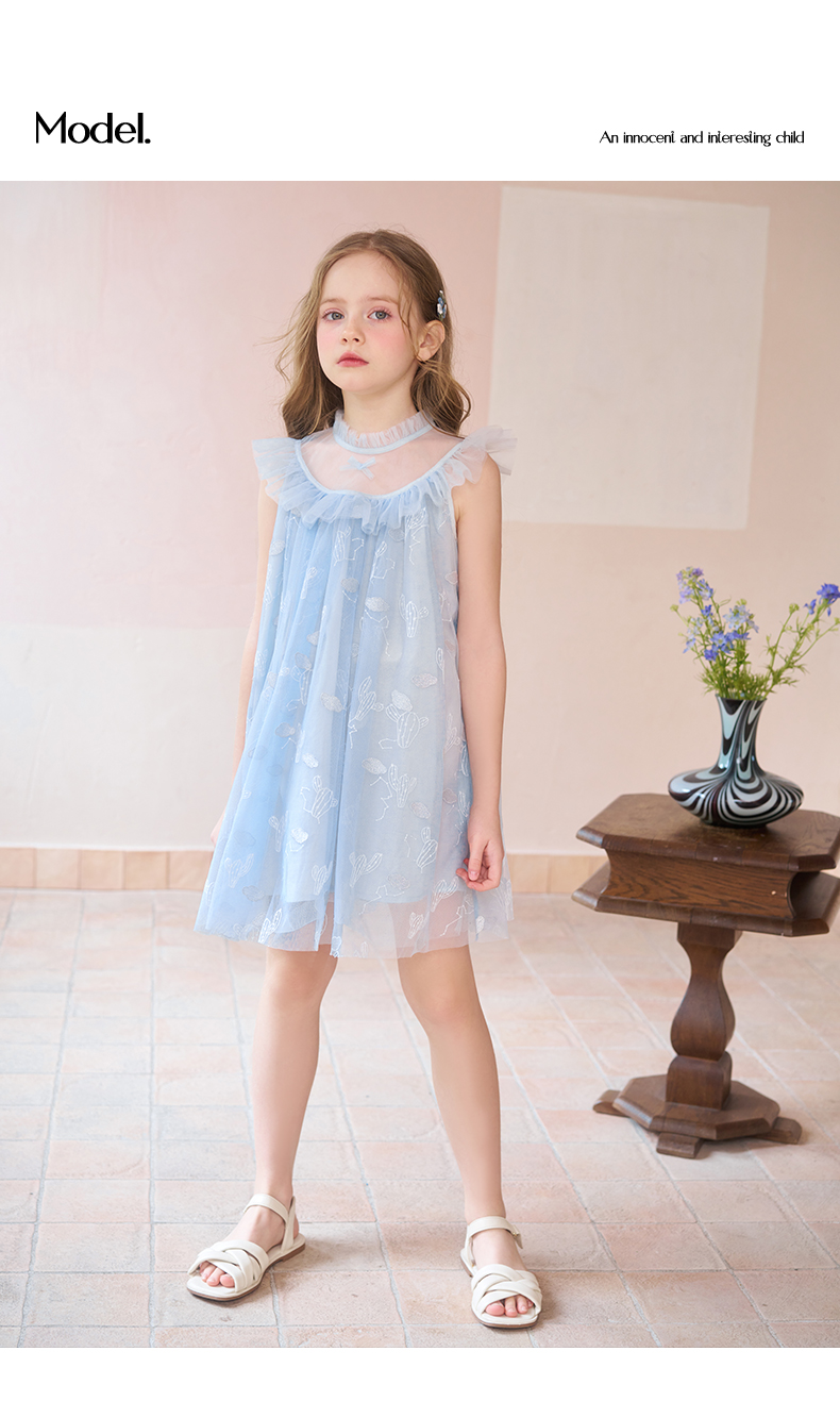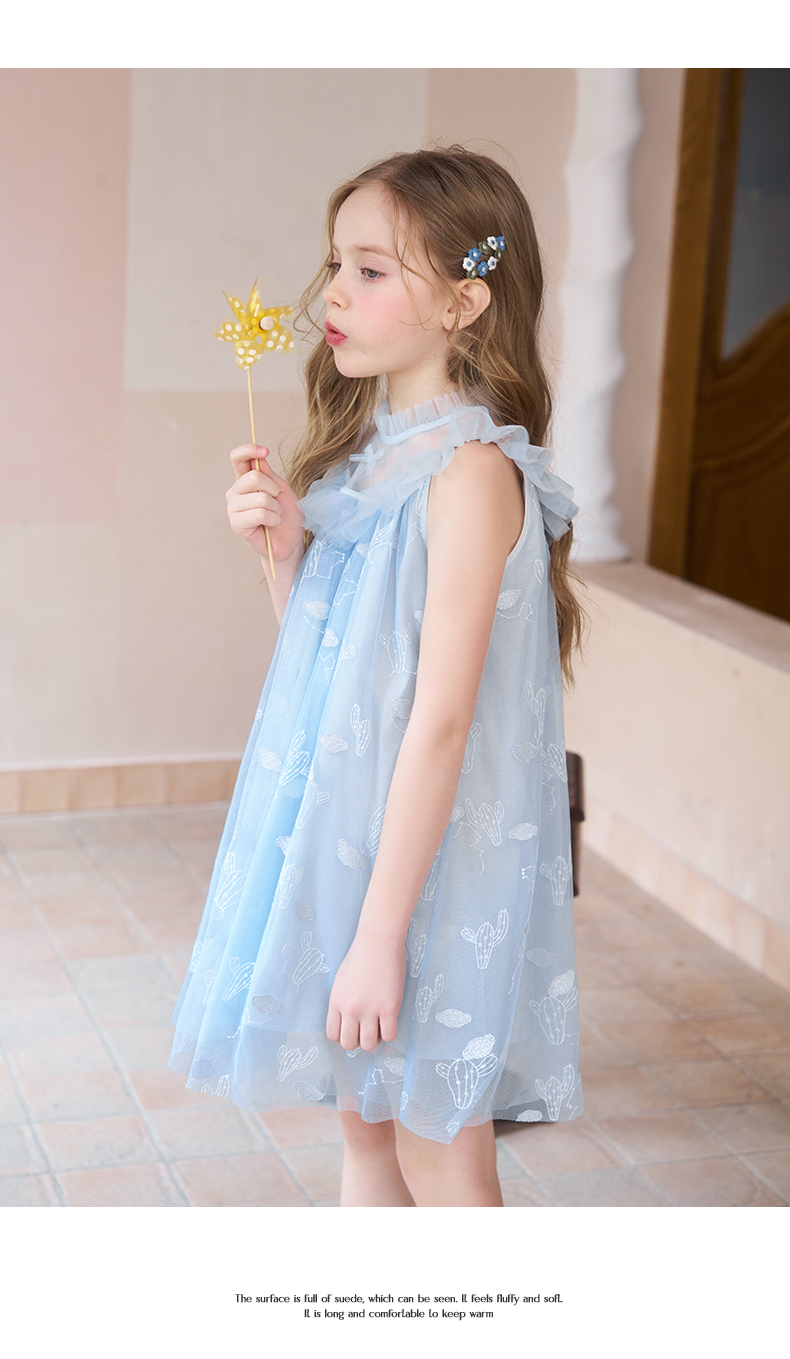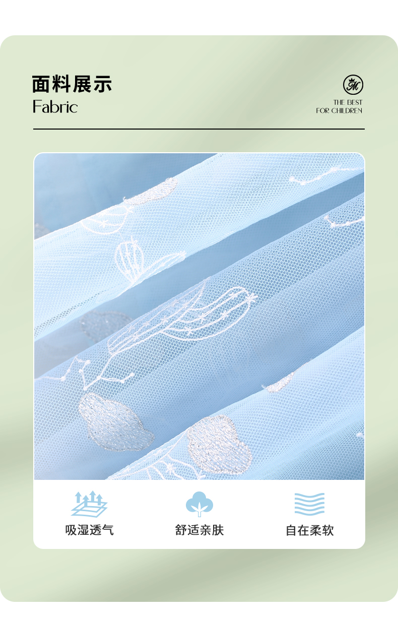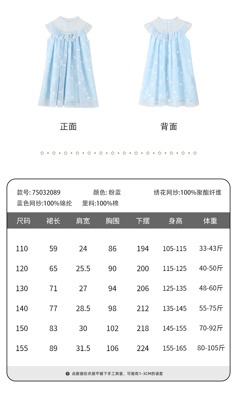 mettekids女童连衣裙夏季女孩甜美网纱公主裙儿童蓝色绣花裙子