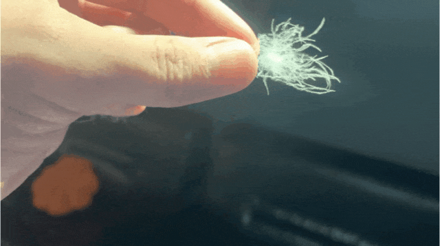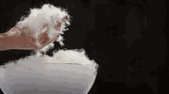 从衣服中选取了一丝鹅绒,每一朵绒都是一个立体的球状纤维,飘在空气中像蒲公英一样轻柔。