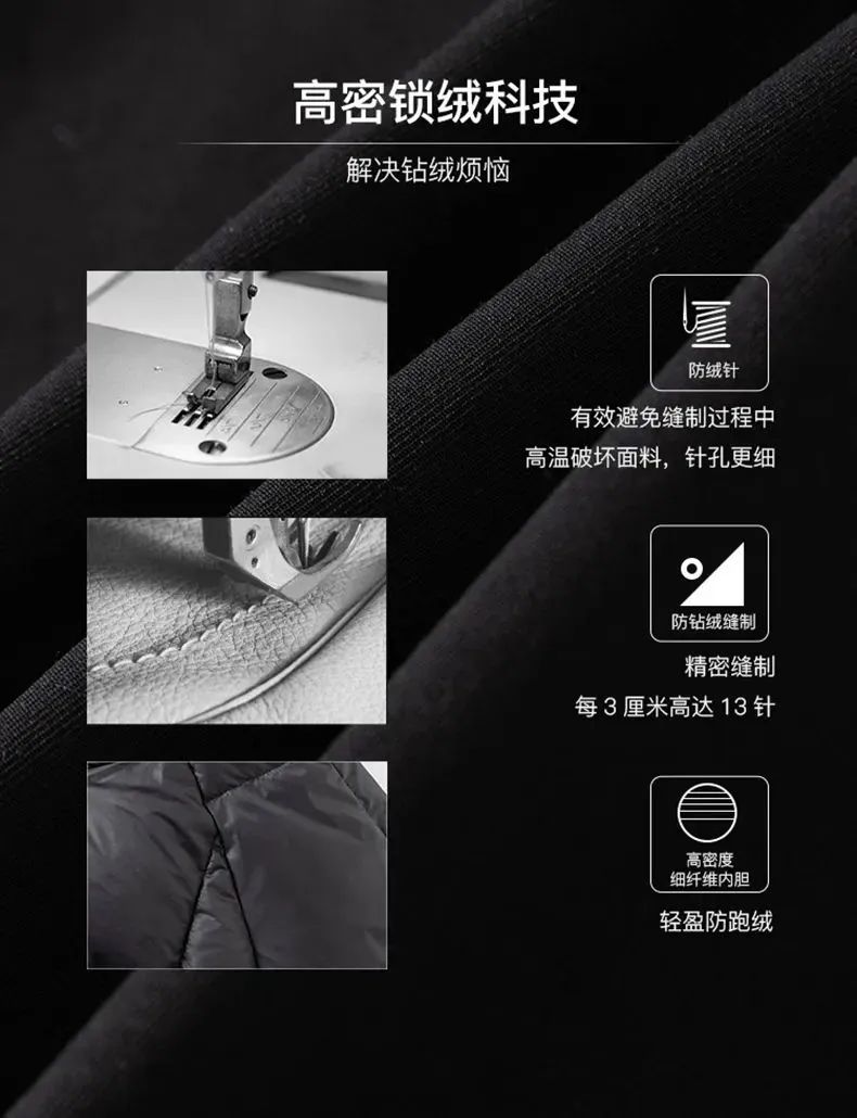四层锁绒工艺,双层锁边,进口防绒针,有效防钻绒