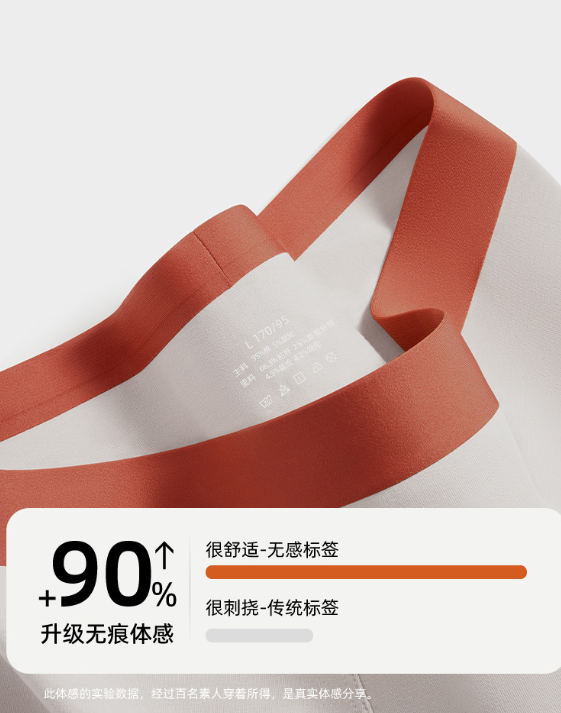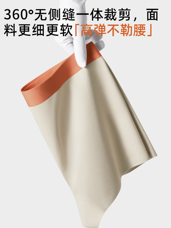 360度°无侧缝一体裁剪, 高弹不勒腰体感升级,无感水洗标取代传统硬标签,更裸感~无感标签穿洗颜色褪淡,提醒及时更换内裤!