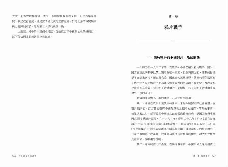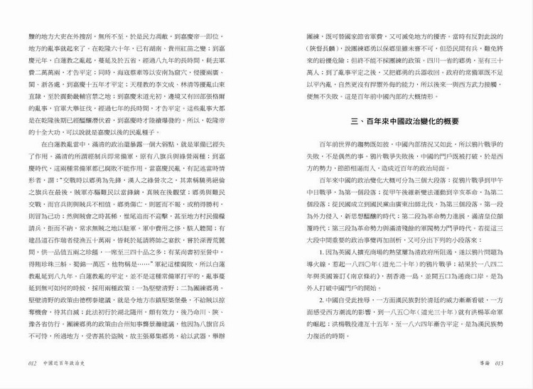 本書起自鴉片戰爭,止於北伐戰爭,將這近百年來中國的政治變化分為三個段落:第一個段落為鴉片戰爭到甲午戰爭,這是列強入侵、新思想醞釀的時代;第二個段落為戊戌維新到辛亥革命,這是革命勢力不斷發展、滿清王朝最終覆滅的時代;第三個段落為民國成立到北伐戰爭,這是革命勢力與清殘餘的軍閥勢力鬥爭的時代。作者不僅詳細闡述了近百年中國政治演進的過程及影響,而且從思想文化的角度,進行了深層解讀與審視。可謂一部中國近代政治通史。
