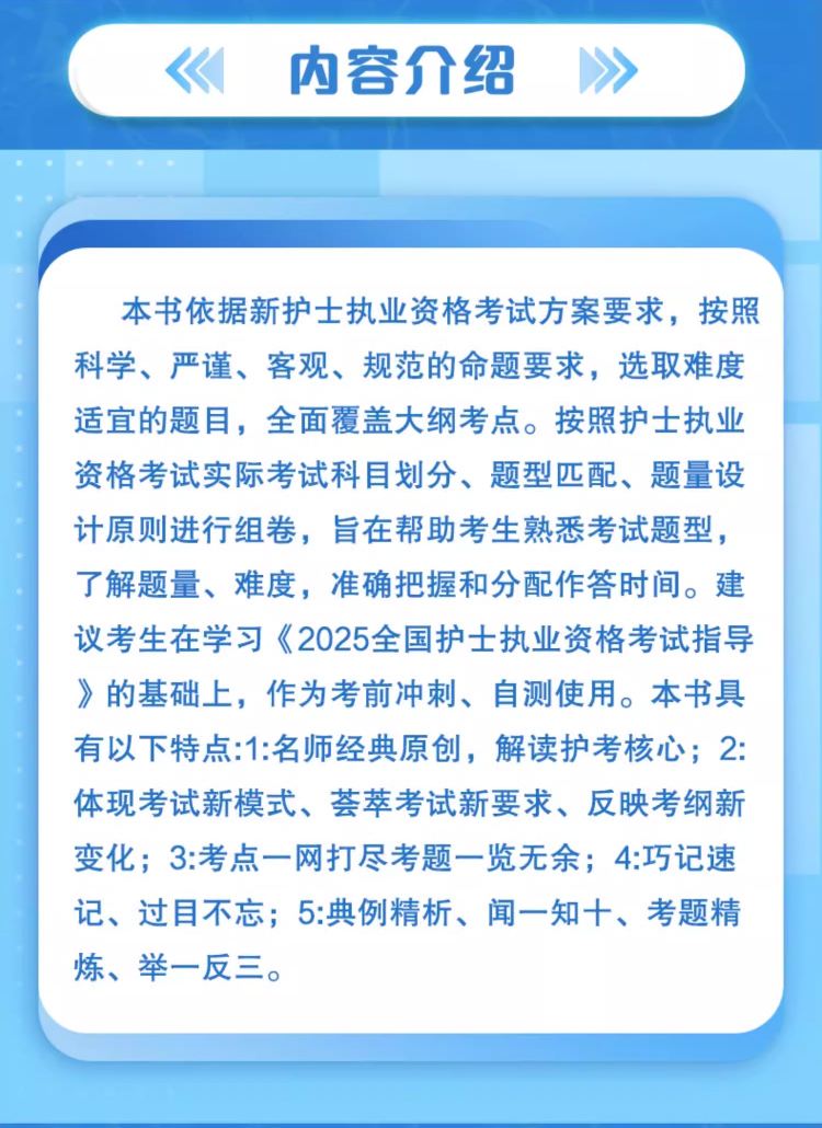 本书严格按照最新护士执业资格考试的具体要求,结合最新考试大纲,参考规划教材、国内外有关著作编写,作为国家卫生健康委人才交流服务中心唯一推荐的护士执业资格考试用书。本套系共有4本,包括“考试指导”“考试指导要点精编”“同步练习题集”“模拟试卷”方便不同复习阶段的考生复习备考,是国内最权、最具指导性的护士执业资格考试用书。本书依据最新护士执业资格考试方案要求,按照科学、严谨、客观、规范的命题要求,选取难度适宜的题目,全面覆盖大纲考点。按照护士执业资格考试实际考试科目划分、题型匹配、题量设计原则进行组卷,旨在帮助考生熟悉考试题型,了解题量、难度,准确把握和分配作答时间。建议考生在学习《2025全国护士执业资格考试指导》的基础上,作为考前冲刺、自测使用。