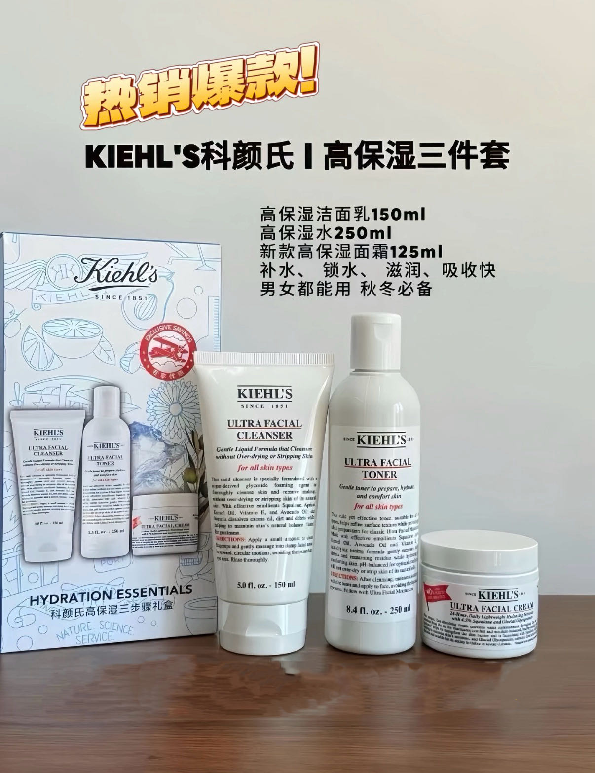 科颜氏高保湿三件套(洁面啫喱150ml+高保湿水250ml+高保湿面霜125ml)
