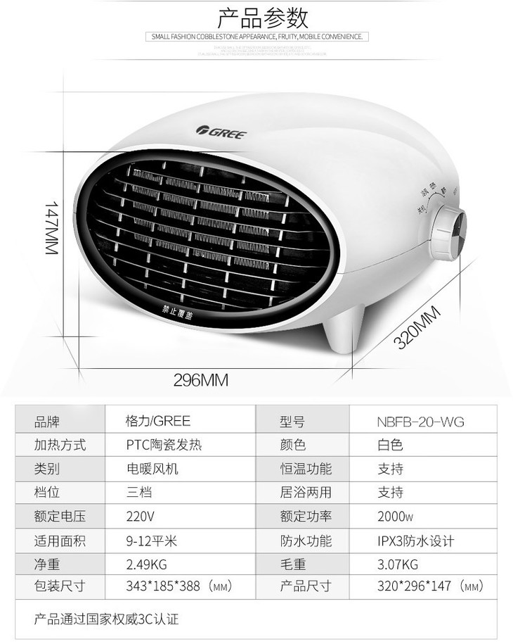 格力(508232)(GREE) 暖气机NBFB-20-WG暖风机 家用取暖器婴儿电暖气支持浴居两用 PTC防水陶瓷发热 2000大功率