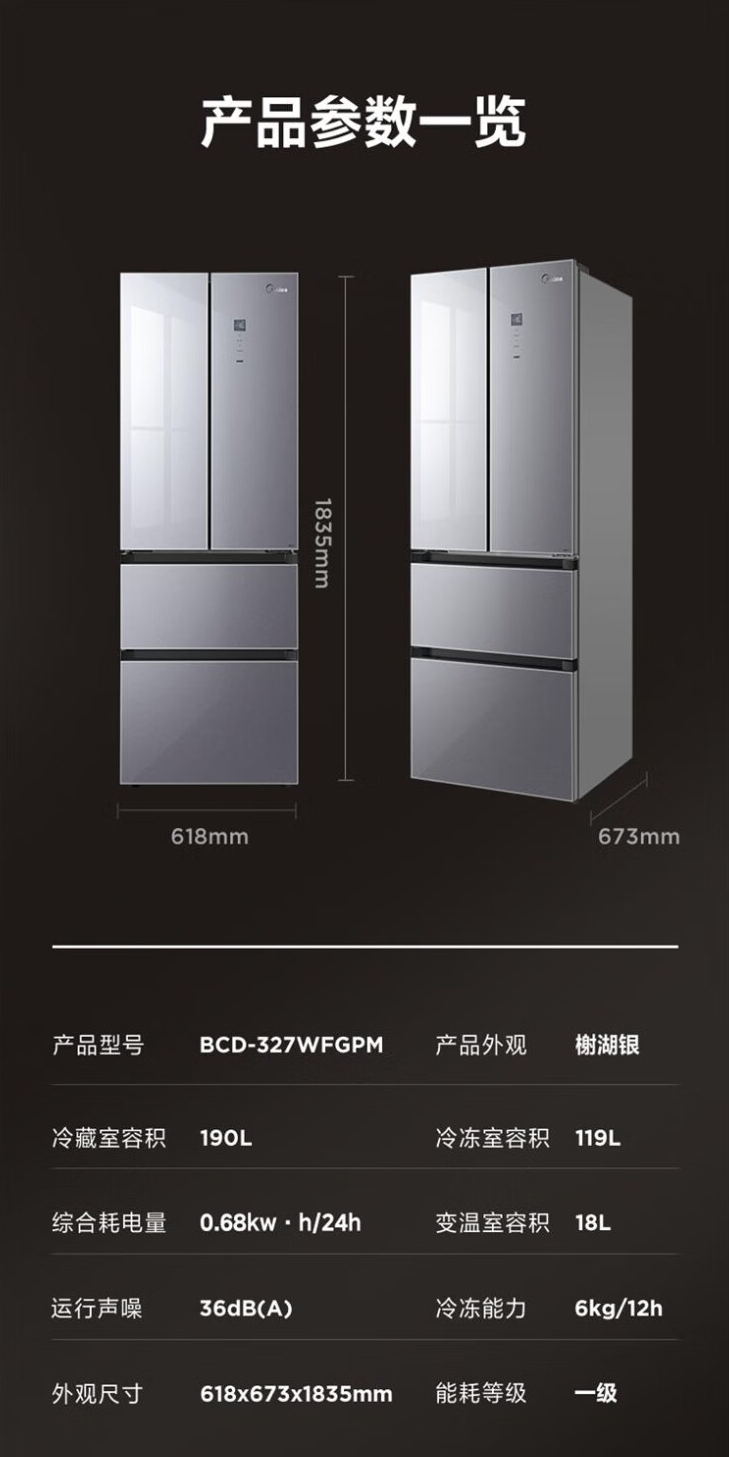 美的(Midea)(202660)327升法式多门冰箱 一级变频 风冷无霜 铂金净味 三循环 钢化玻璃面板 BCD-327WFGPM 榭湖银