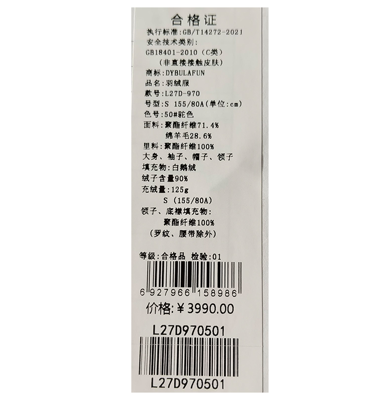 戴布拉芬羽绒服L27D970