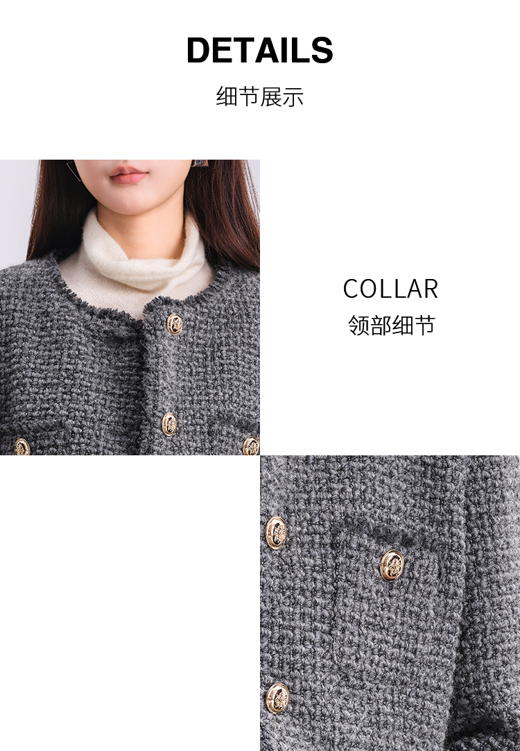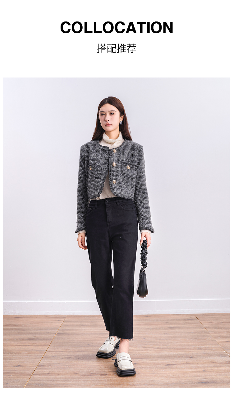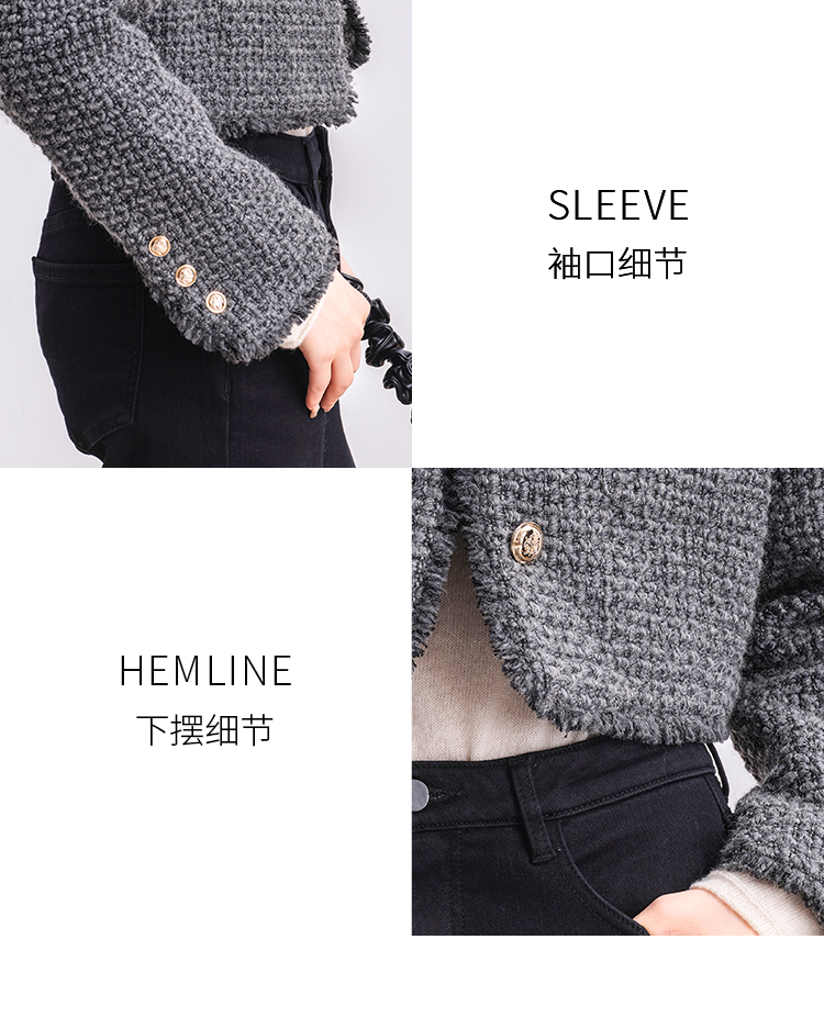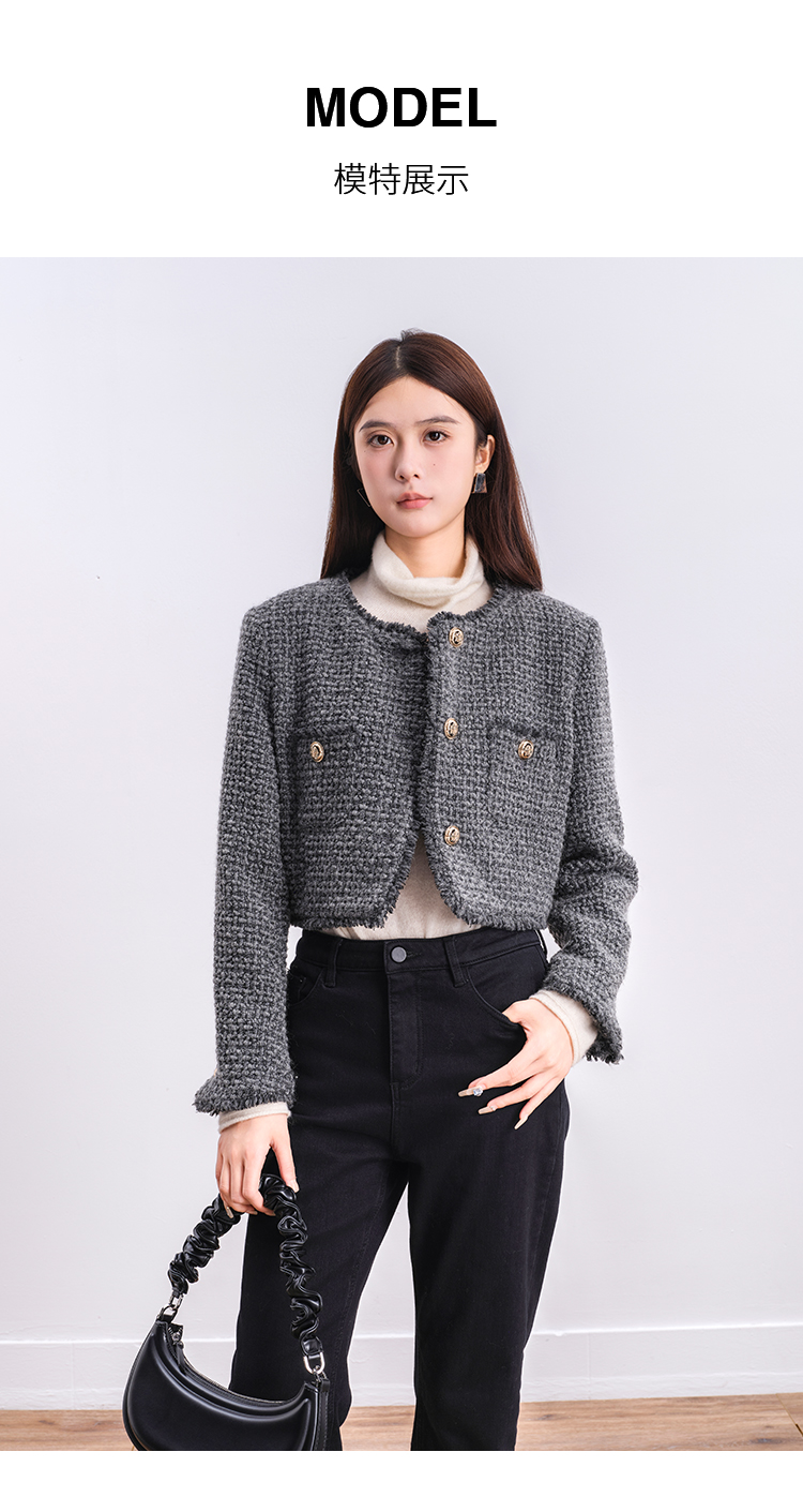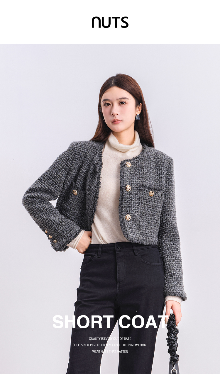 NUTS商场同款冬季时尚通勤灰色圆领毛边小香风短款外套女4480406A1