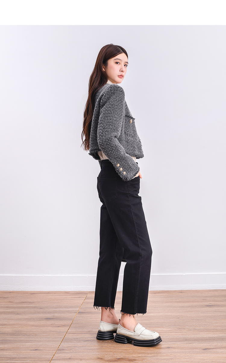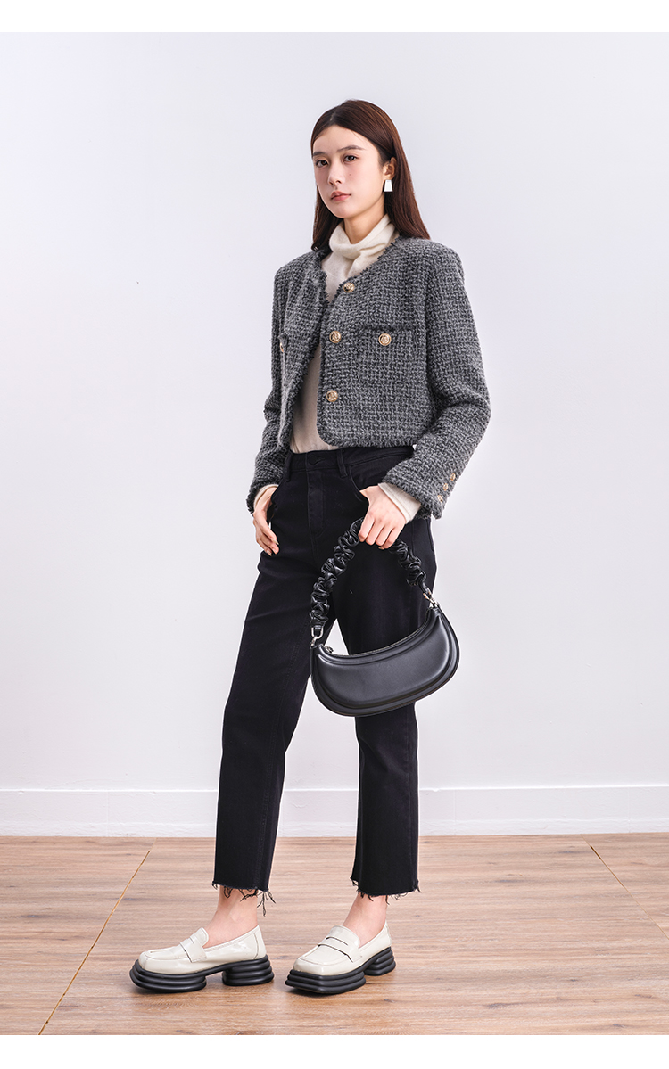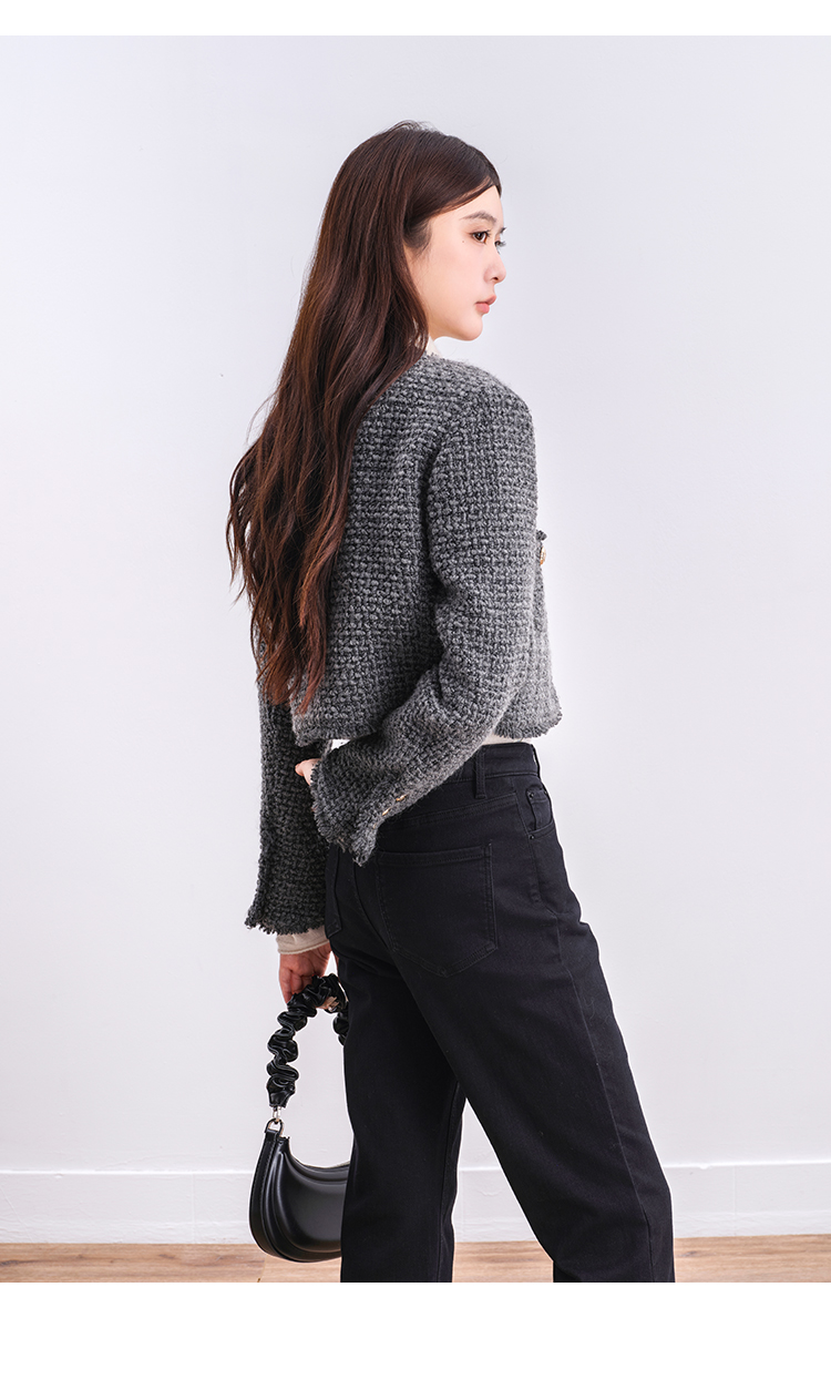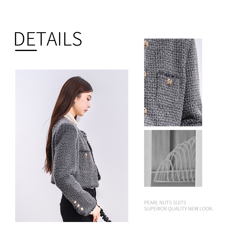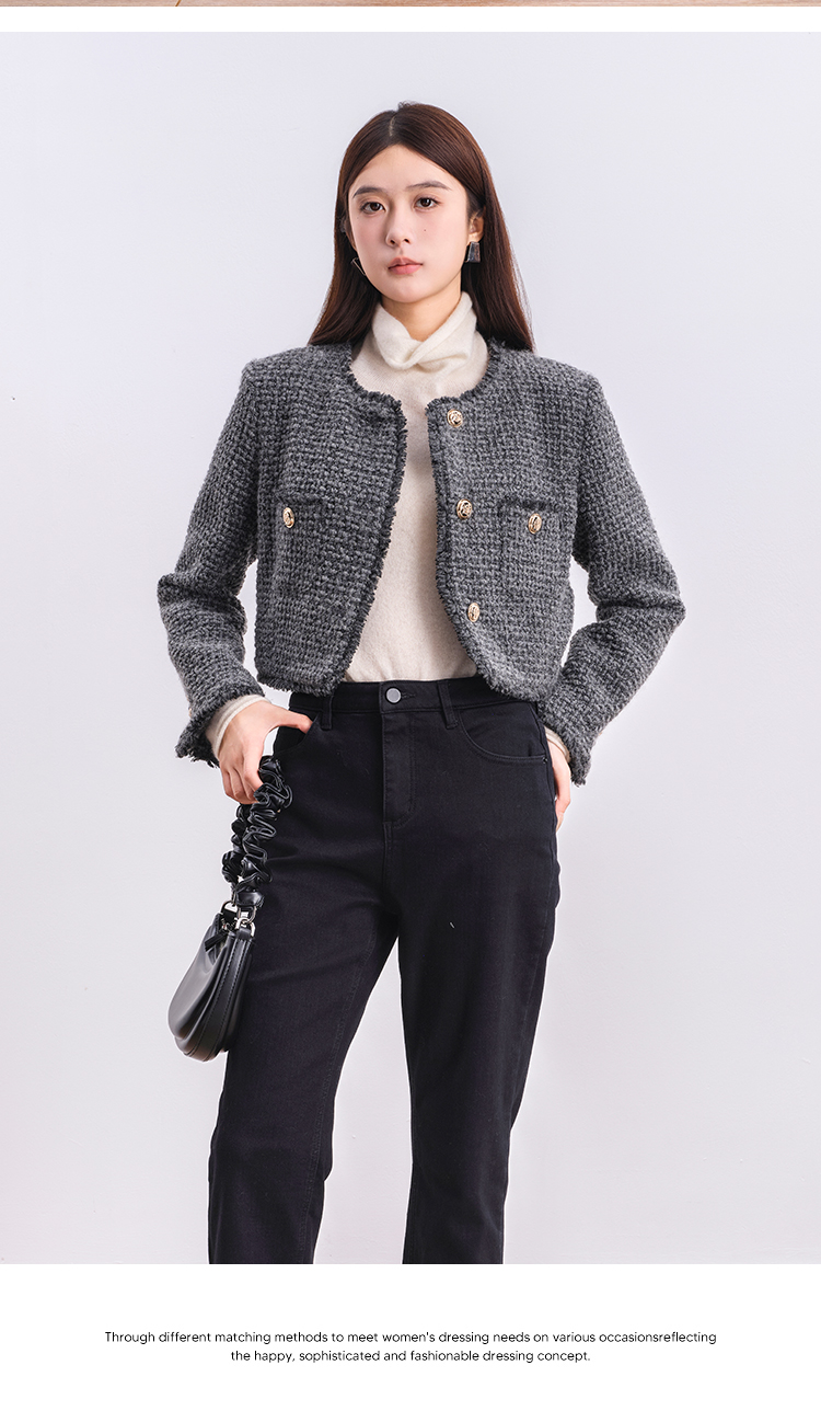 NUTS商场同款冬季时尚通勤灰色圆领毛边小香风短款外套女4480406A1