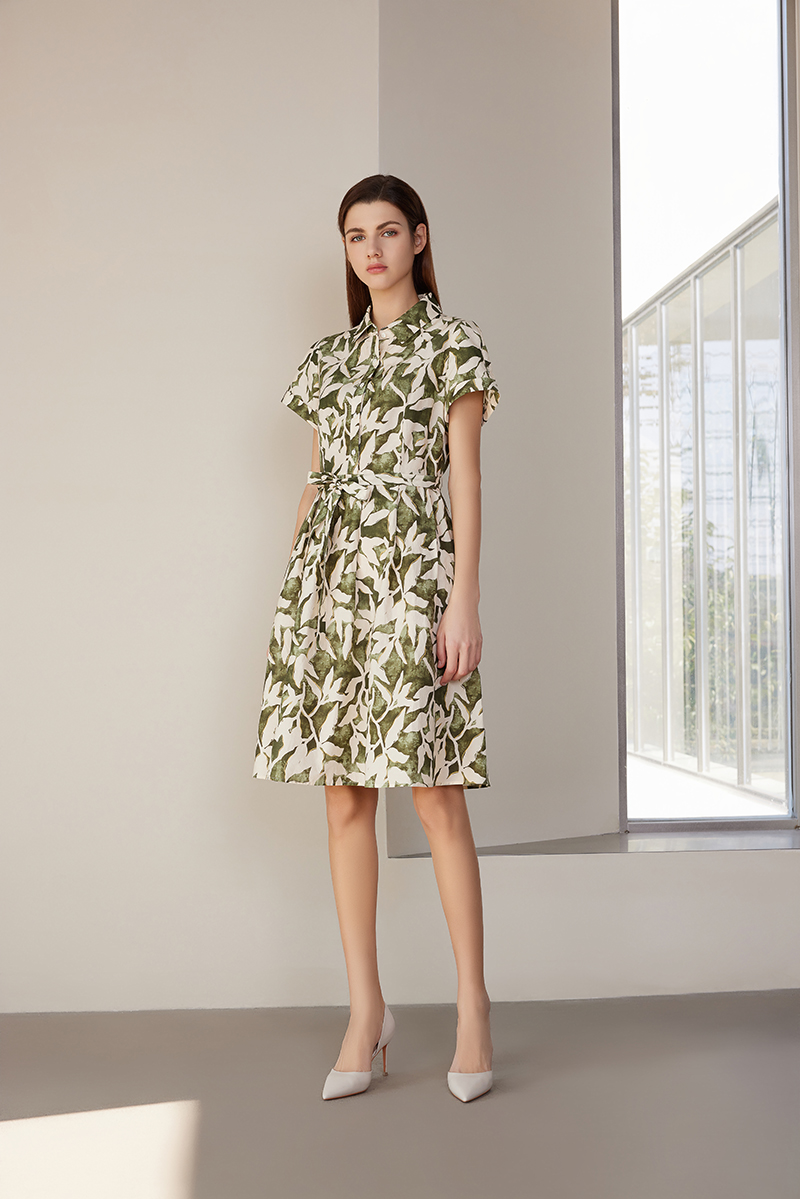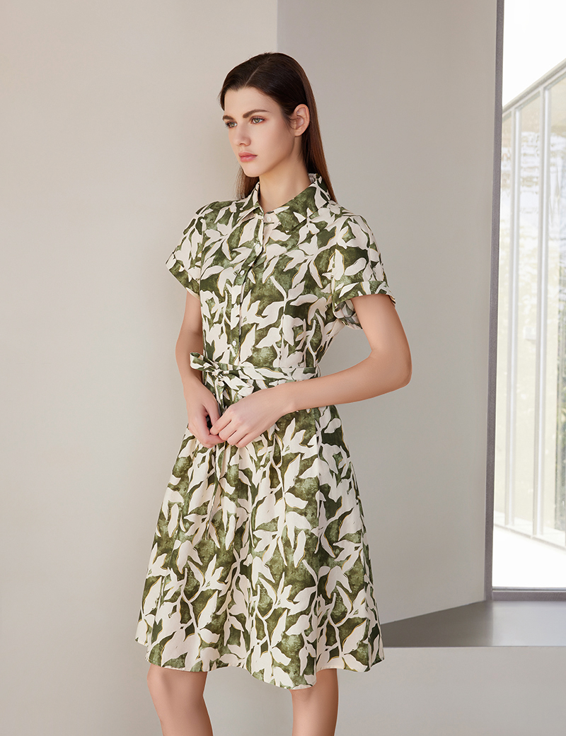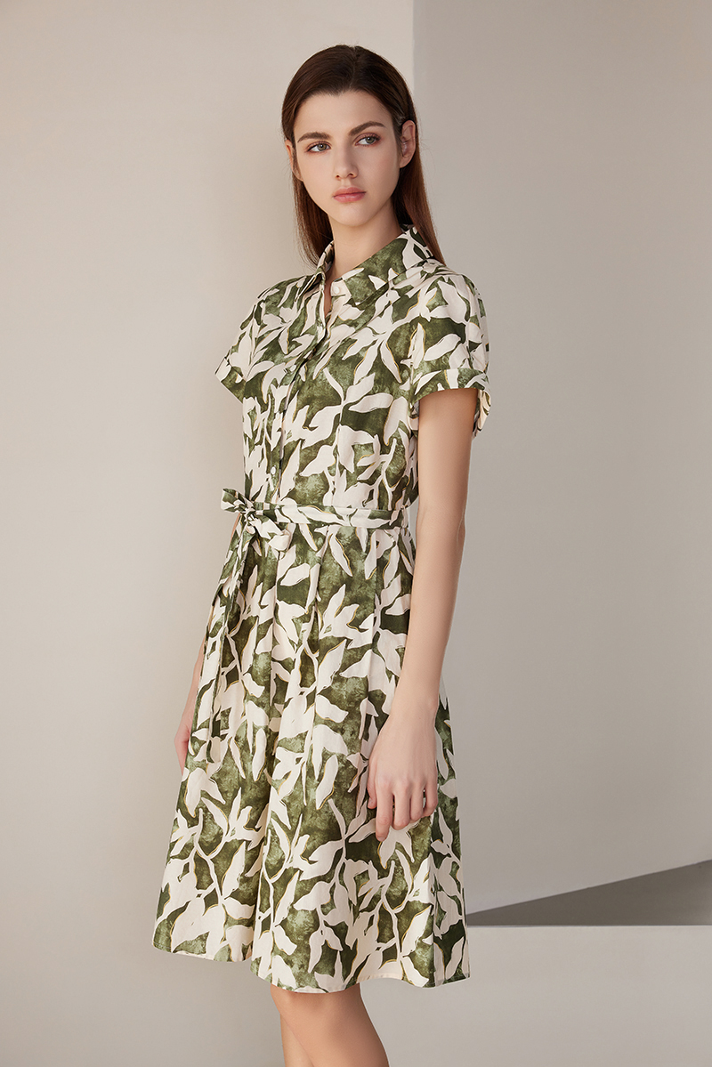 【棉质印花连衣裙】24年春夏新品女士时尚印花连衣裙系带收腰裙子