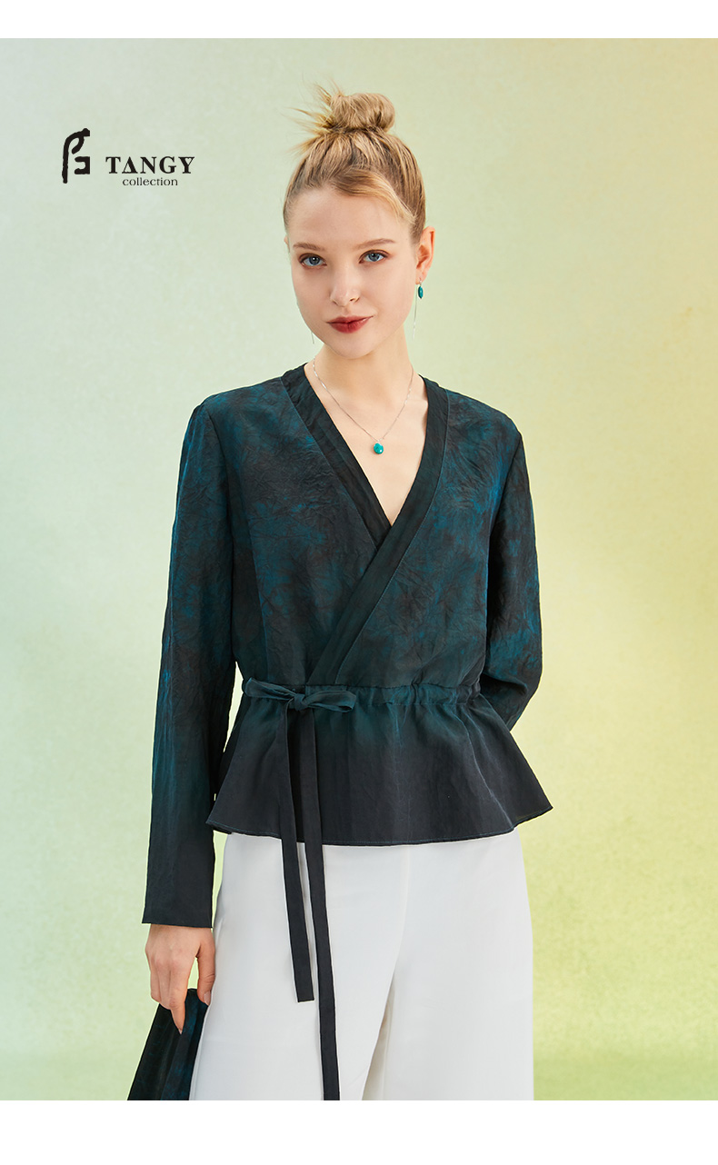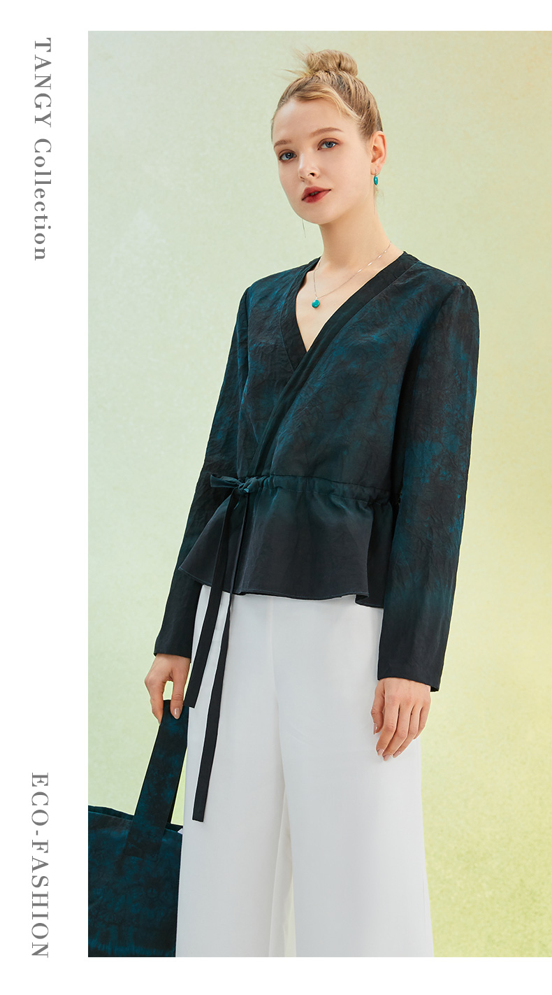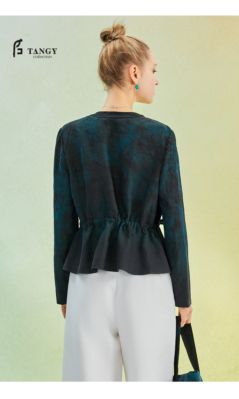 TANGY Collection/天意精品2022年春夏新品抽带收腰V领手工印染莨绸短外套