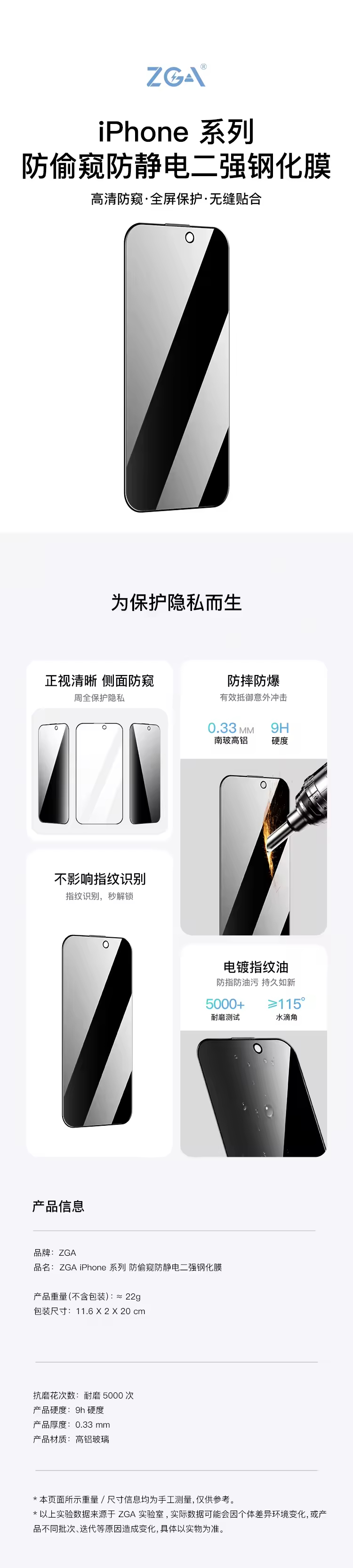 ZGA iPhone 系列 防偷窥防静电二强钢化膜-17 系列