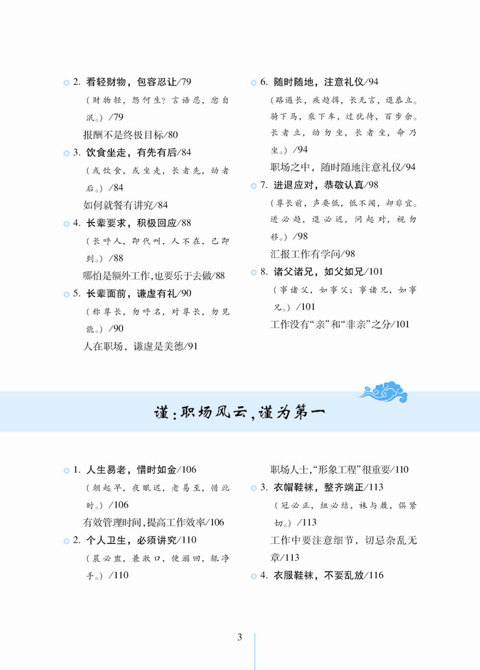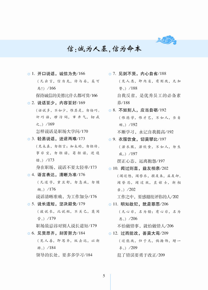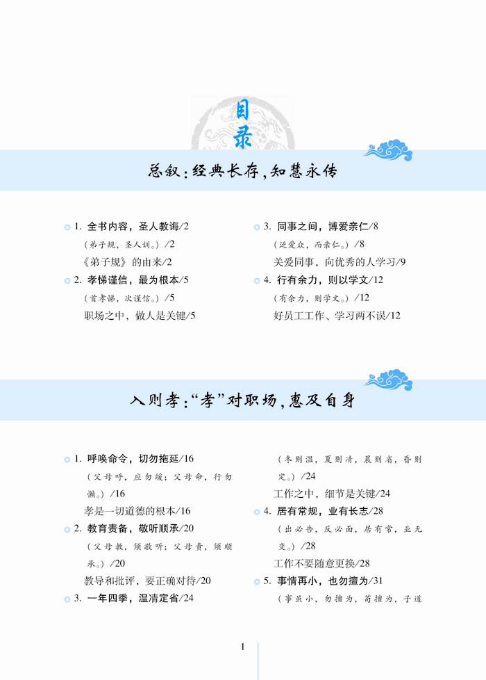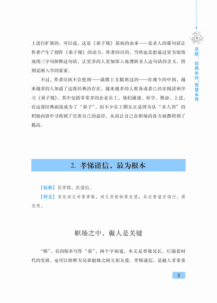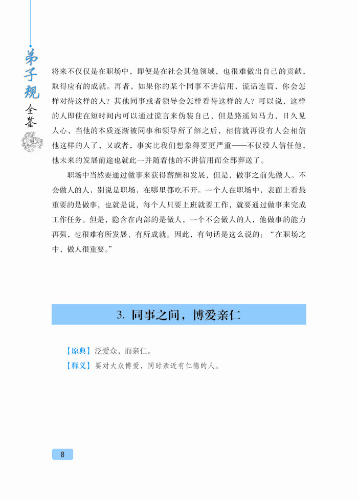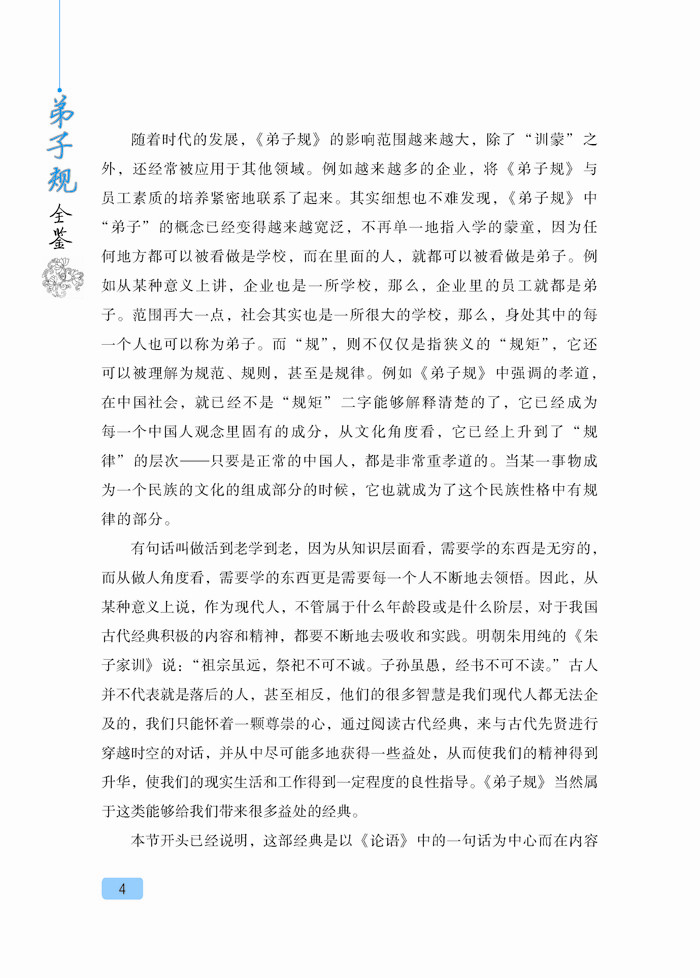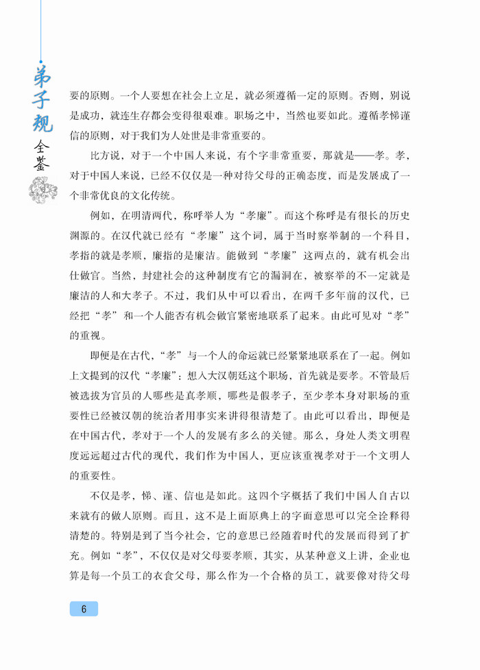 《弟子规全鉴》在全面阐释《弟子规》精华要义的基础上,以孝、悌、谨、信、泛爱众、亲仁和余力学文七个方面为人处世应有的基本理念和规范为纲,充分融入对现实的深层次思考,书中大量引用圣贤著作进行说理,穿插上百则历史故事和现实案件,将《弟子规》蕴涵的智慧与当下职场相结合,将传统文化的厚重感与当今鲜明的时代感相结合,是党政机关和企事业单位员工、国学爱好者以及青年学生塑造健全人格、培养良好习惯、提升个人修养的必备读物。
