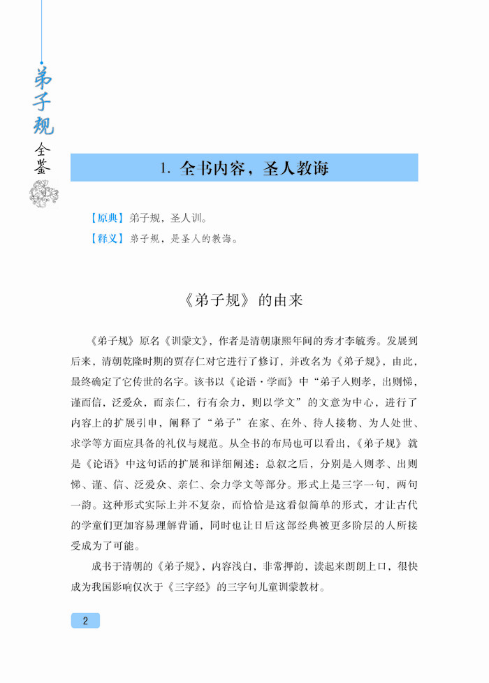 《弟子规》原名《训蒙文》,为清朝康熙年间秀才李毓秀所作,后经贾存仁修订,列出了为人子弟在家、外出、待人接物、求学应有的礼仪与规范,堪称启蒙养正的最佳读物。