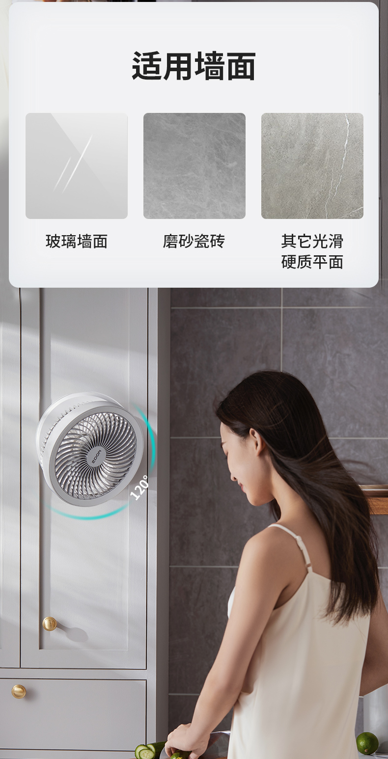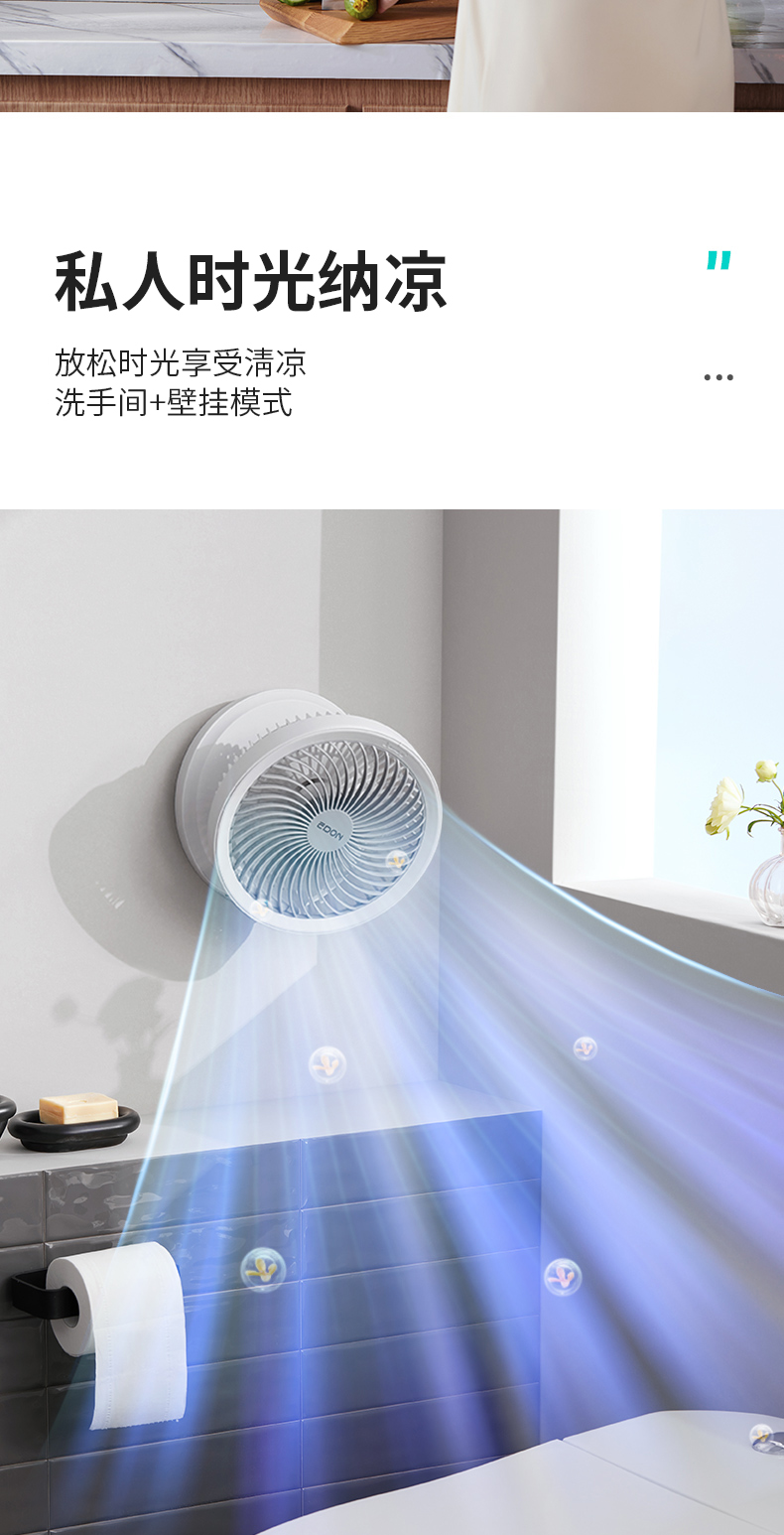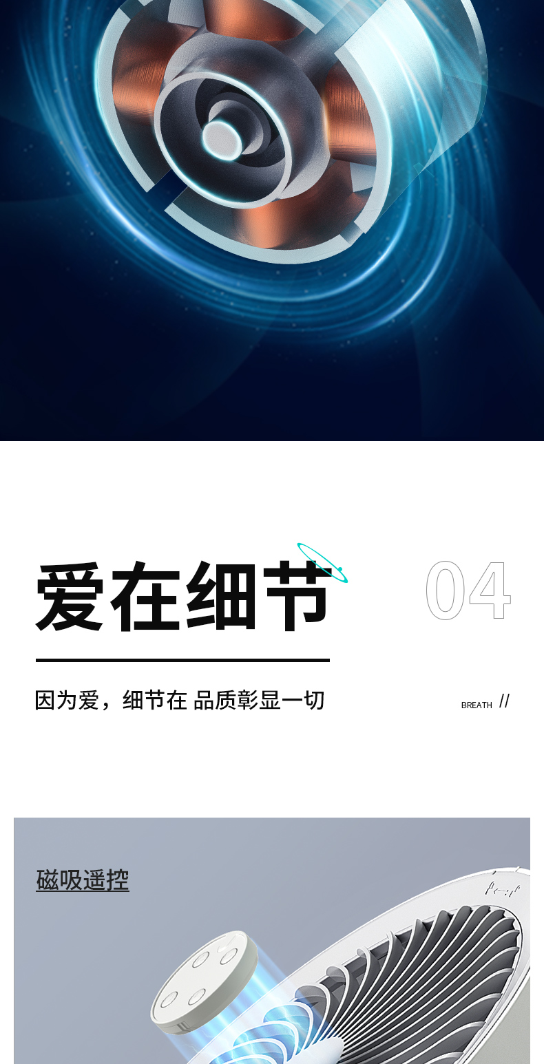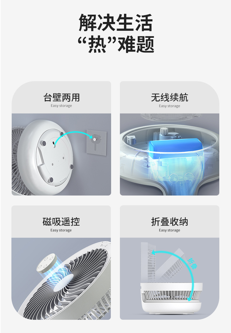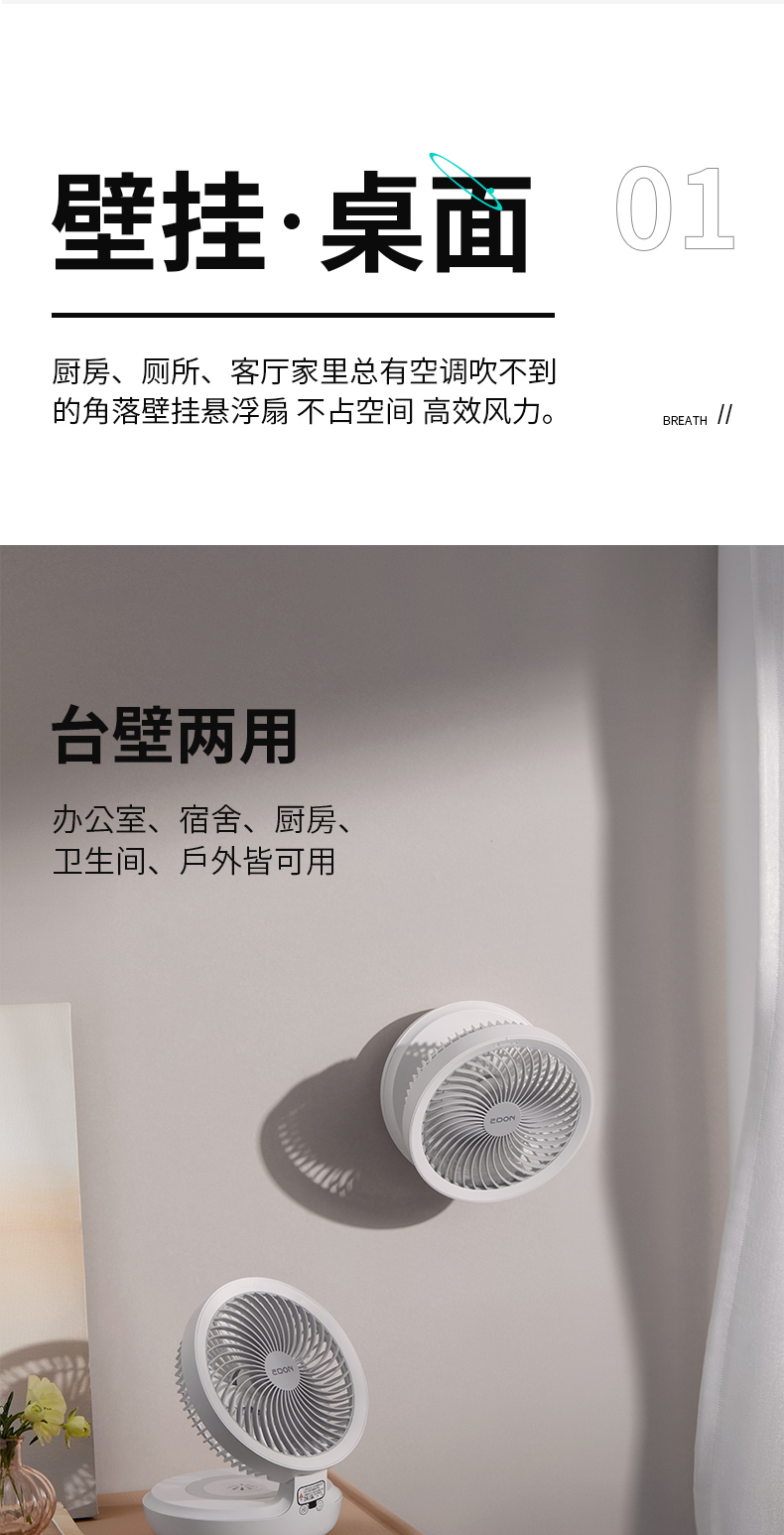 EDON爱登 无线循环可壁挂舒适扇 锂电款/遥控款 四档风力,悬浮120°摇头设计,广角送风空气循环覆盖整屋;免打孔壁挂,不占空间;夜灯功能柔和不刺眼,可折叠收纳,节约空间