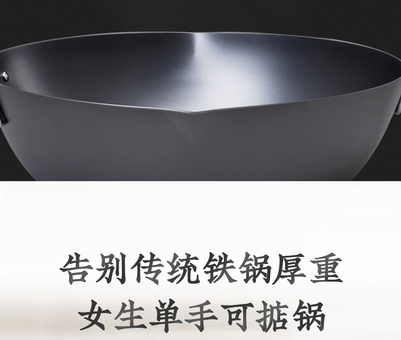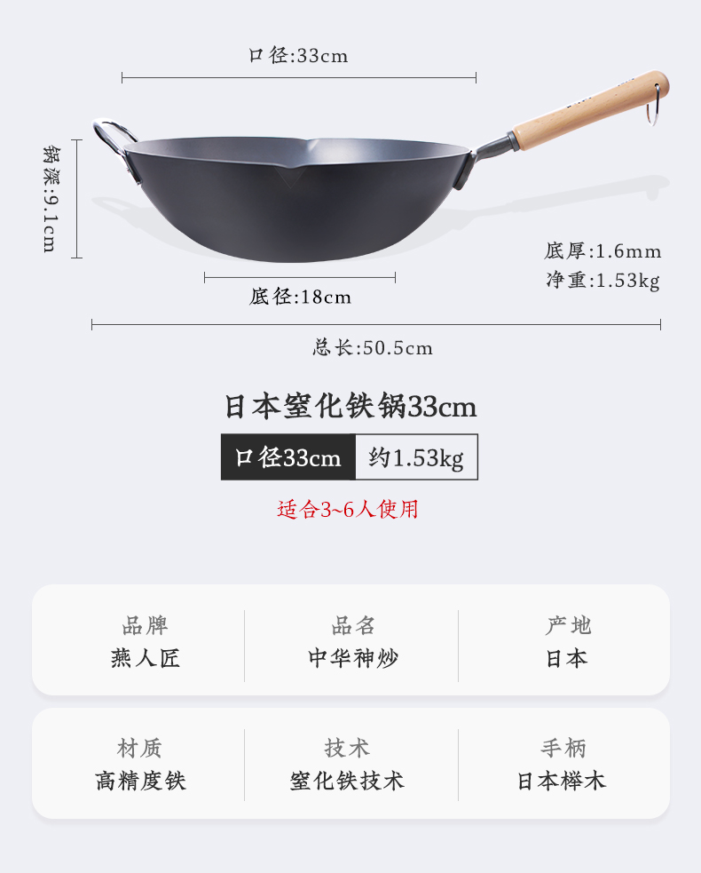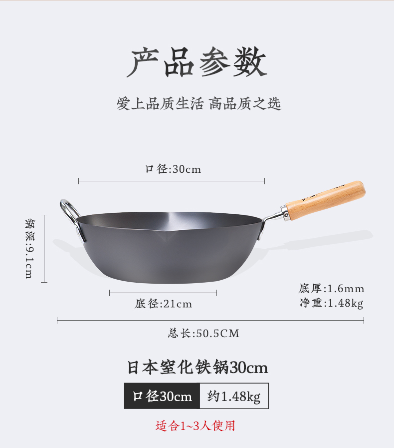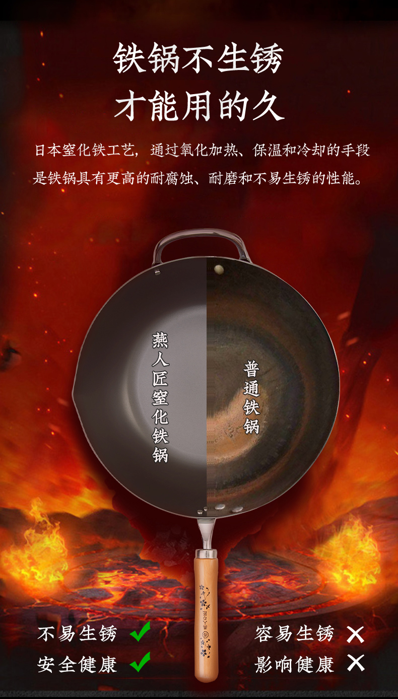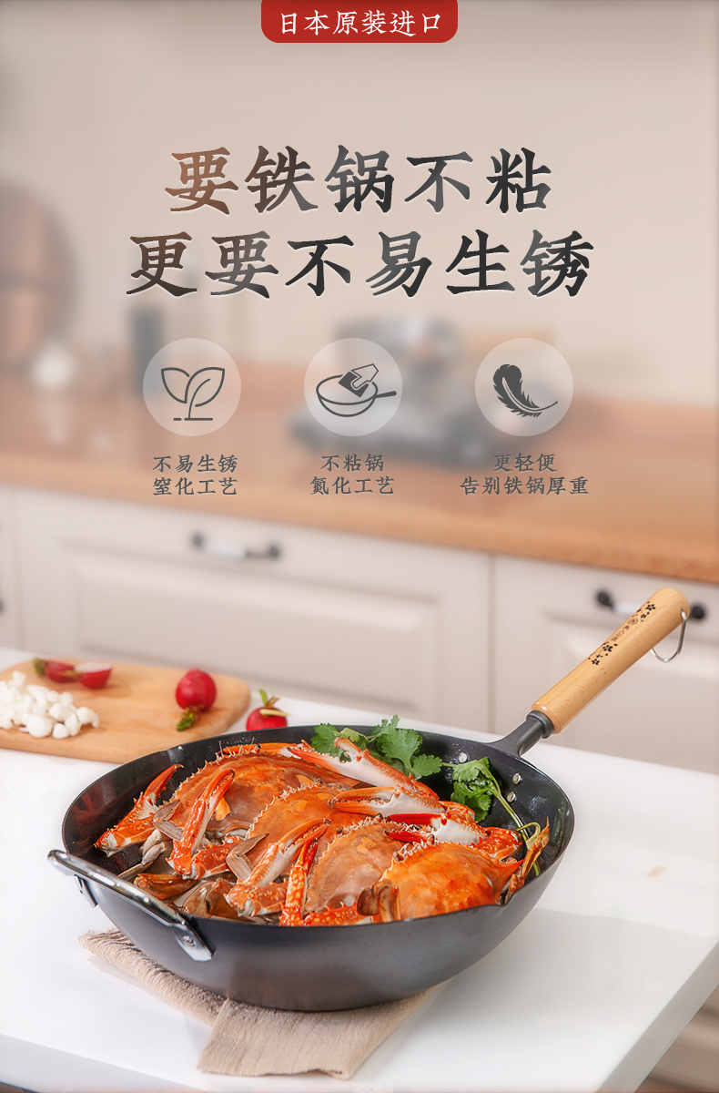 【日本进口100%无涂层】日本燕人匠原装进口无涂层铁锅/炒锅,窒化铁技术不生锈,附赠木质锅盖