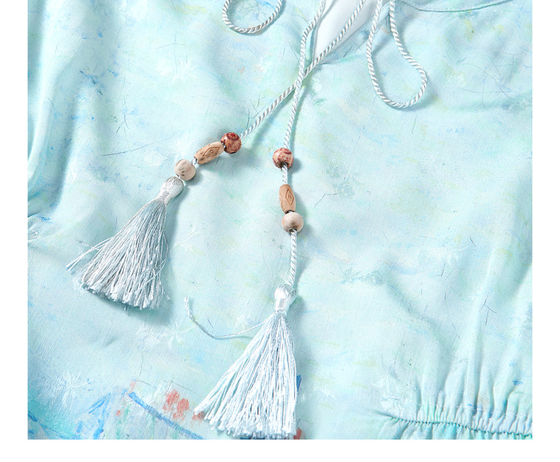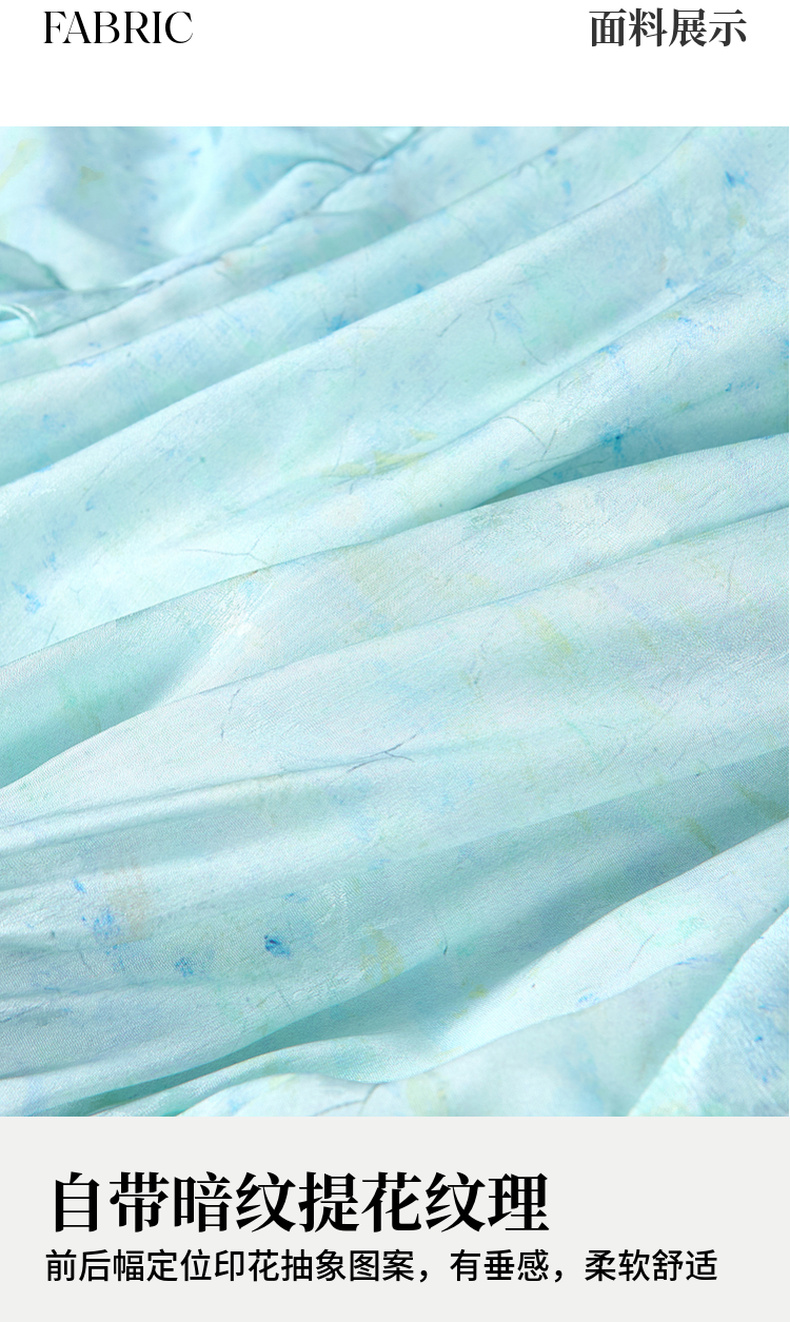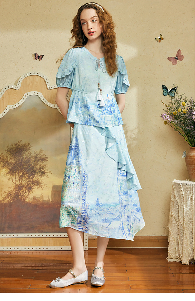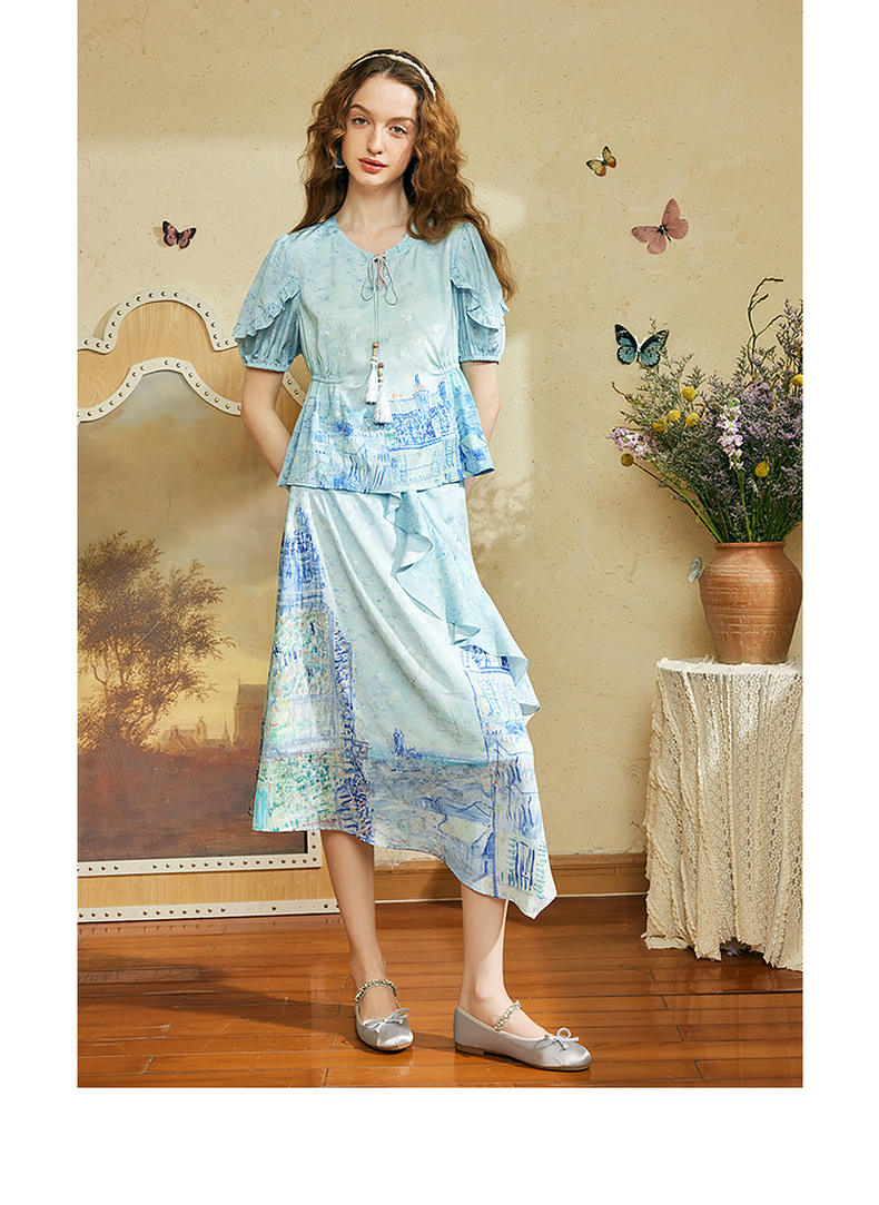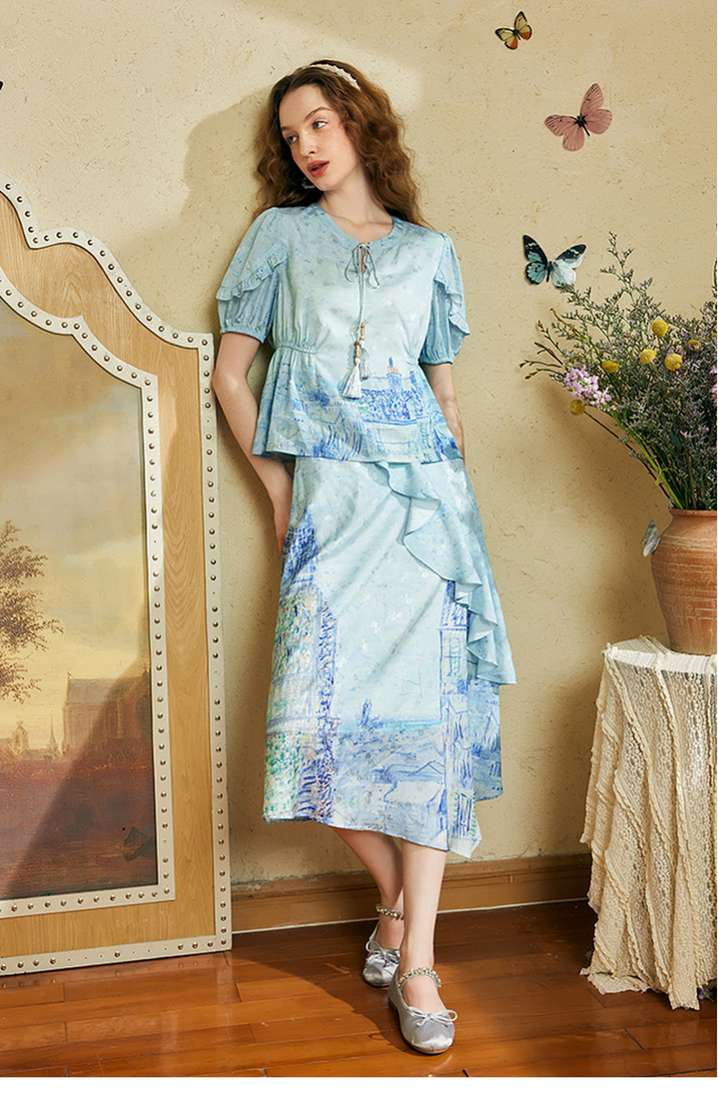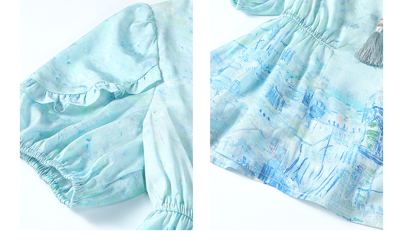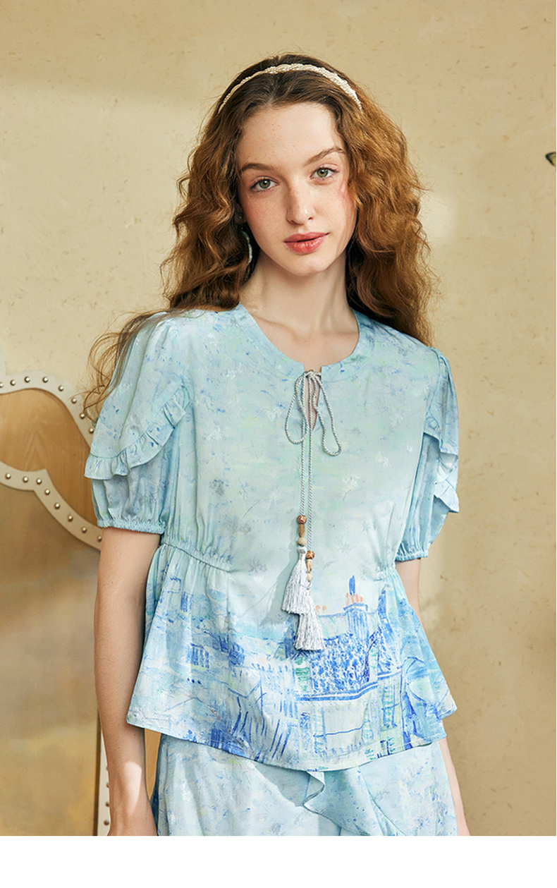 两三事梵高文艺星流羽絮2024夏新款复古印花流苏绑带泡泡袖衬衫女