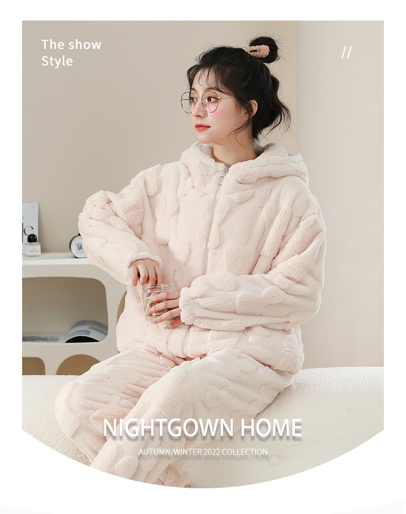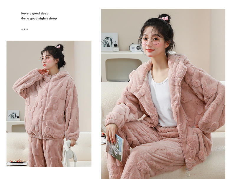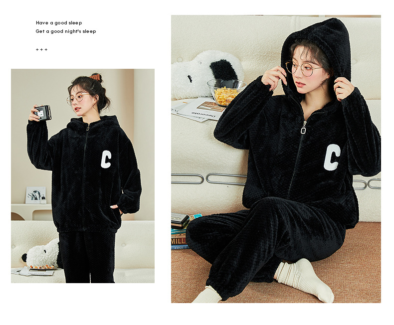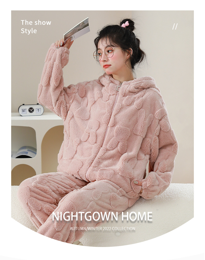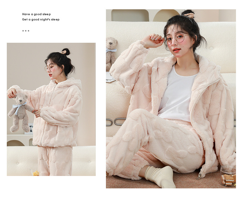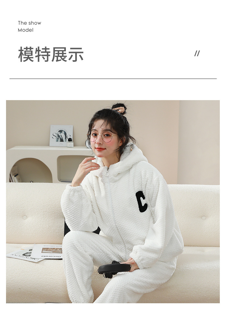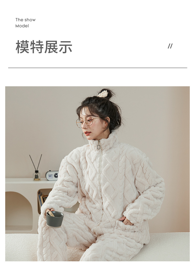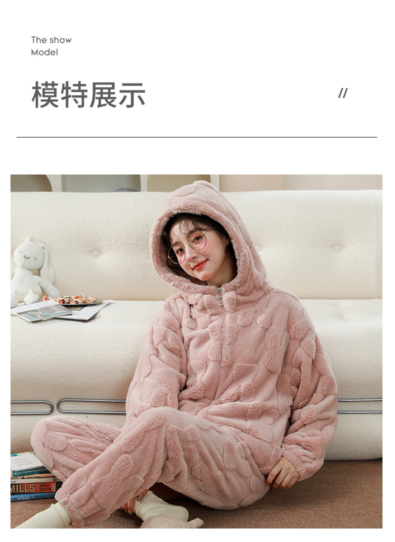 【拉链珊瑚绒家居服套装】可外穿睡衣秋冬季法兰绒加厚立领连帽