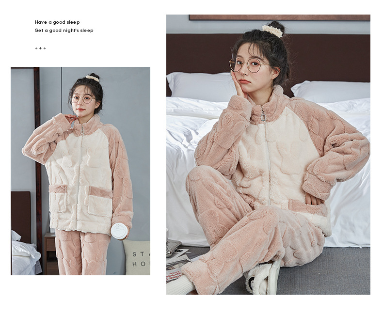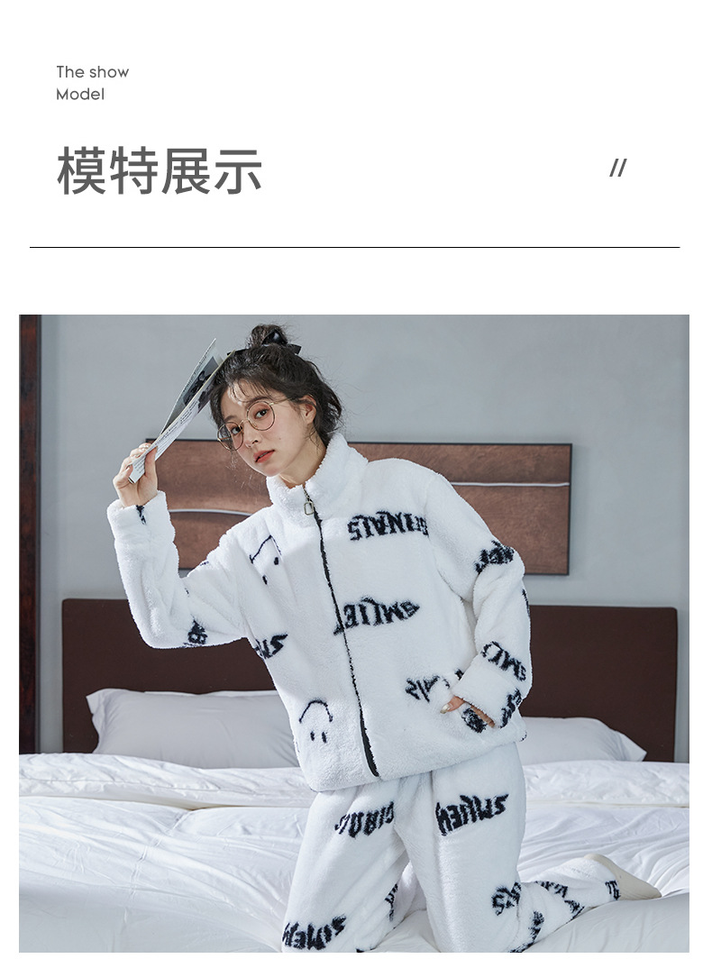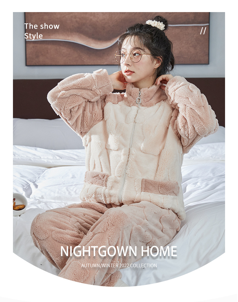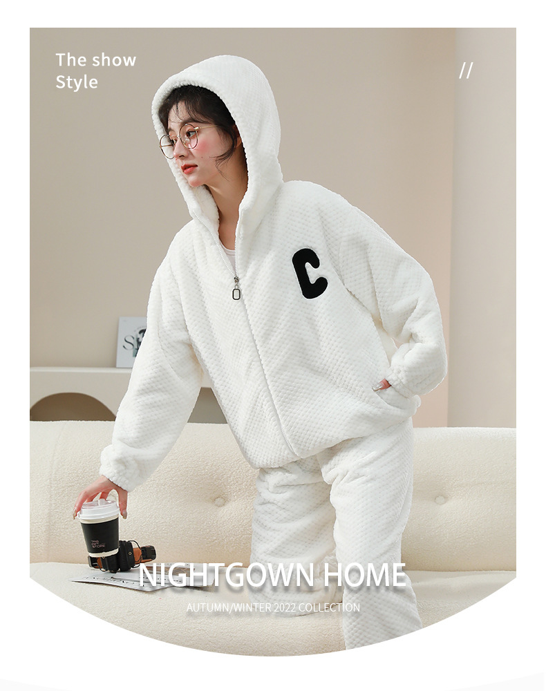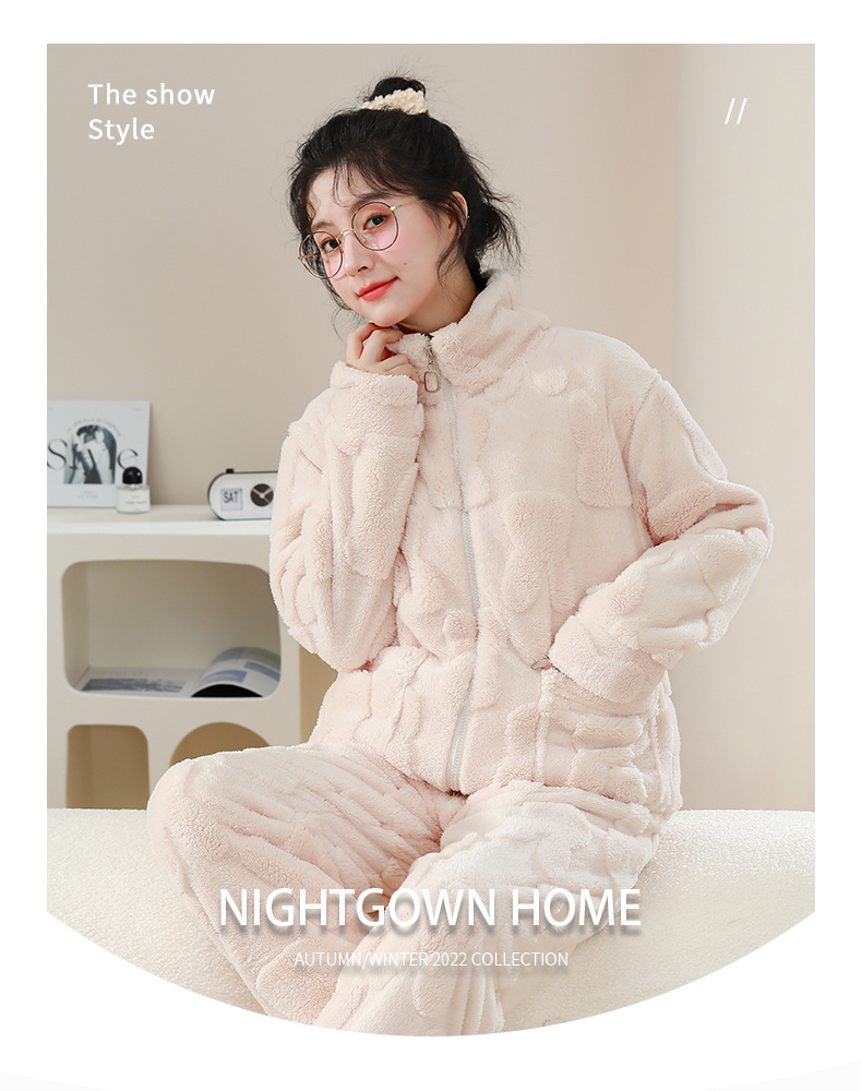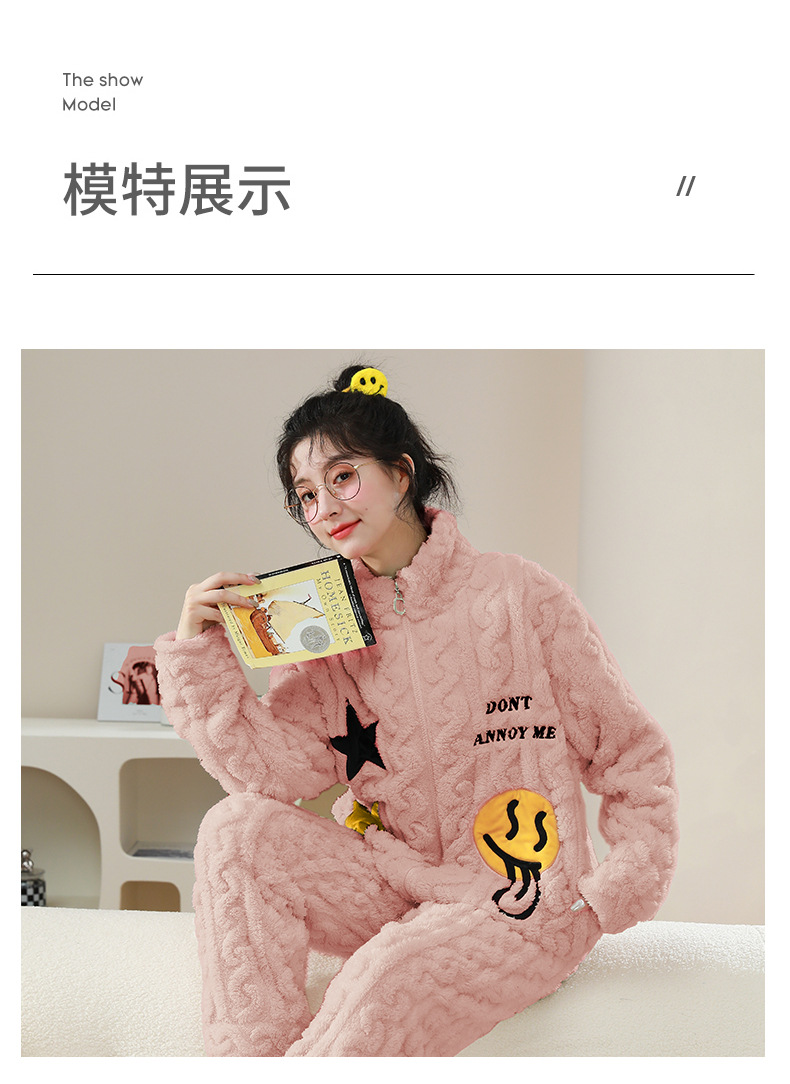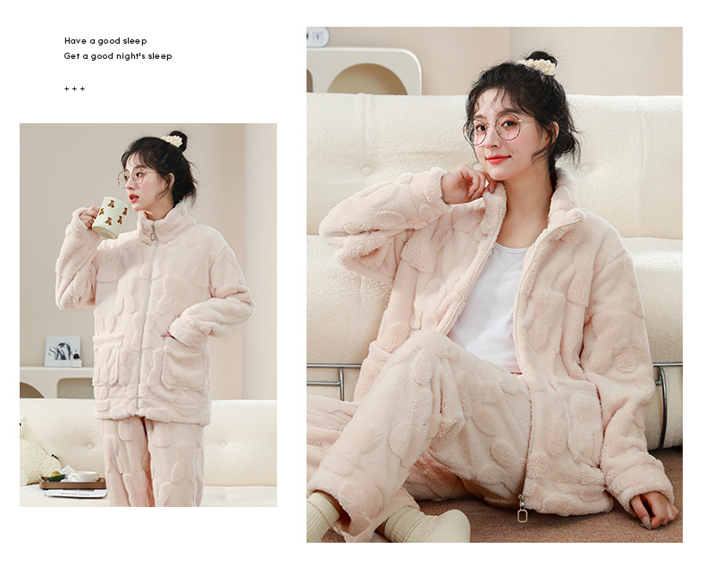 【拉链珊瑚绒家居服套装】可外穿睡衣秋冬季法兰绒加厚立领连帽